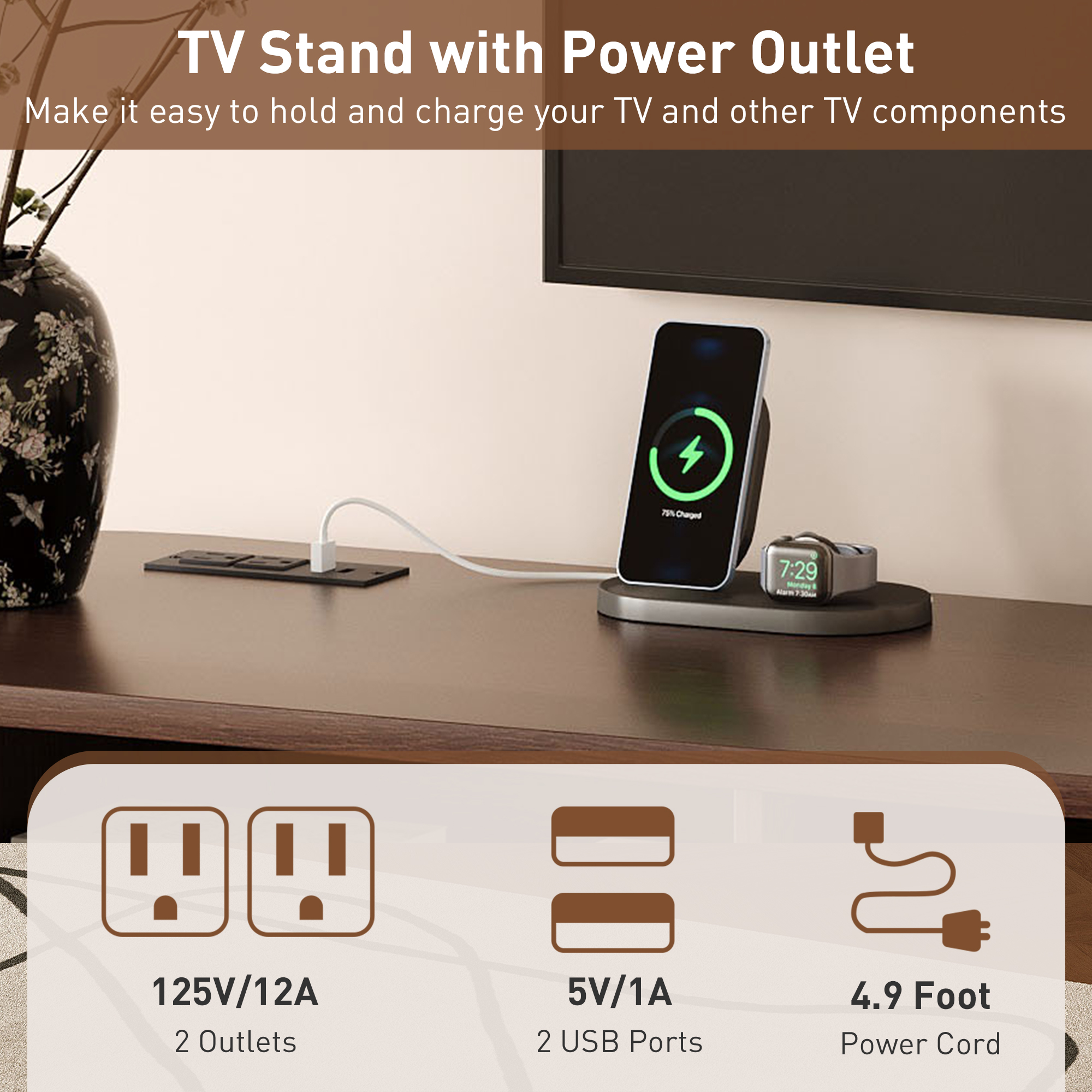 Keep your entertainment area tidy and your devices fully charged with the built-in power outlet system. The stand is equipped with two standard outlets (125V/12A) and two USB ports (5V/1A), all conveniently integrated into the unit.