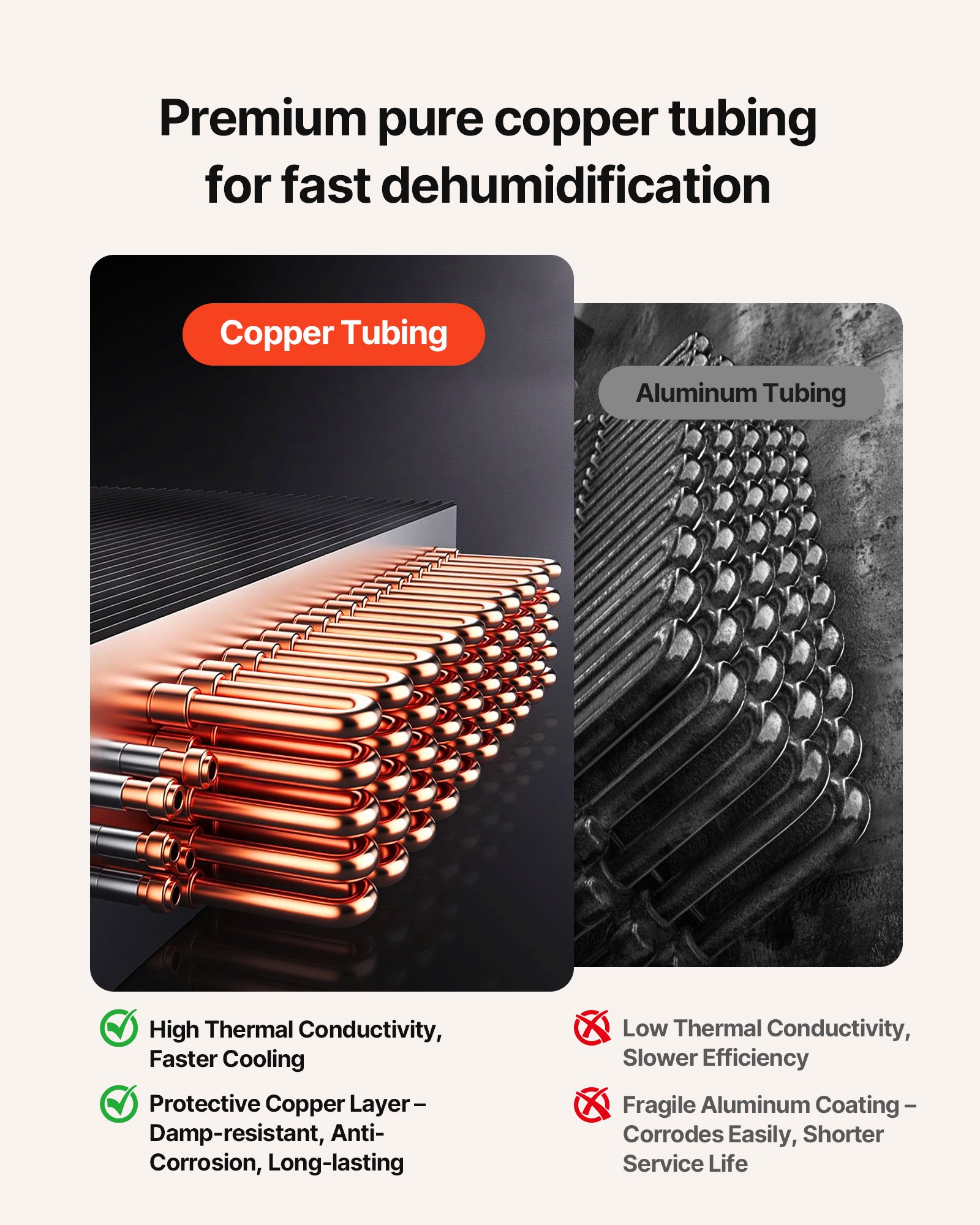Copper Tubing for Cooling: Compared to aluminum, the pure copper condenser in this industrial dehumidifier ensures faster cooling, faster humidity extraction, better corrosion-resistance, and longer service life