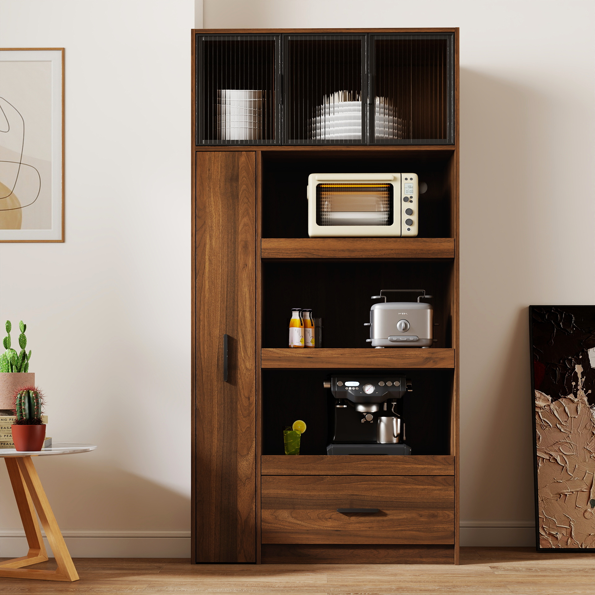 Product Name:70.87" Tall Kitchen Pantry Cabinet with multi-functional pull-out multi-tier storage shelf, 1 Drawers,with Aluminum frame glass door,Freestanding Food Hutch with Microwave Stand for Dining Room