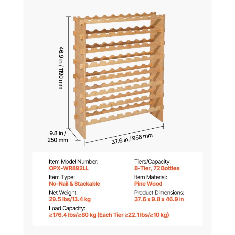 Large Capacity: Featuring an 8-tier stackable design, this freestanding stackable modular wine rack holds up to 72 bottles. Its rack length is extended to 37.7 in/95.8 cm, allowing continuous placement of Pinot Noir bottles to meet home storage needs