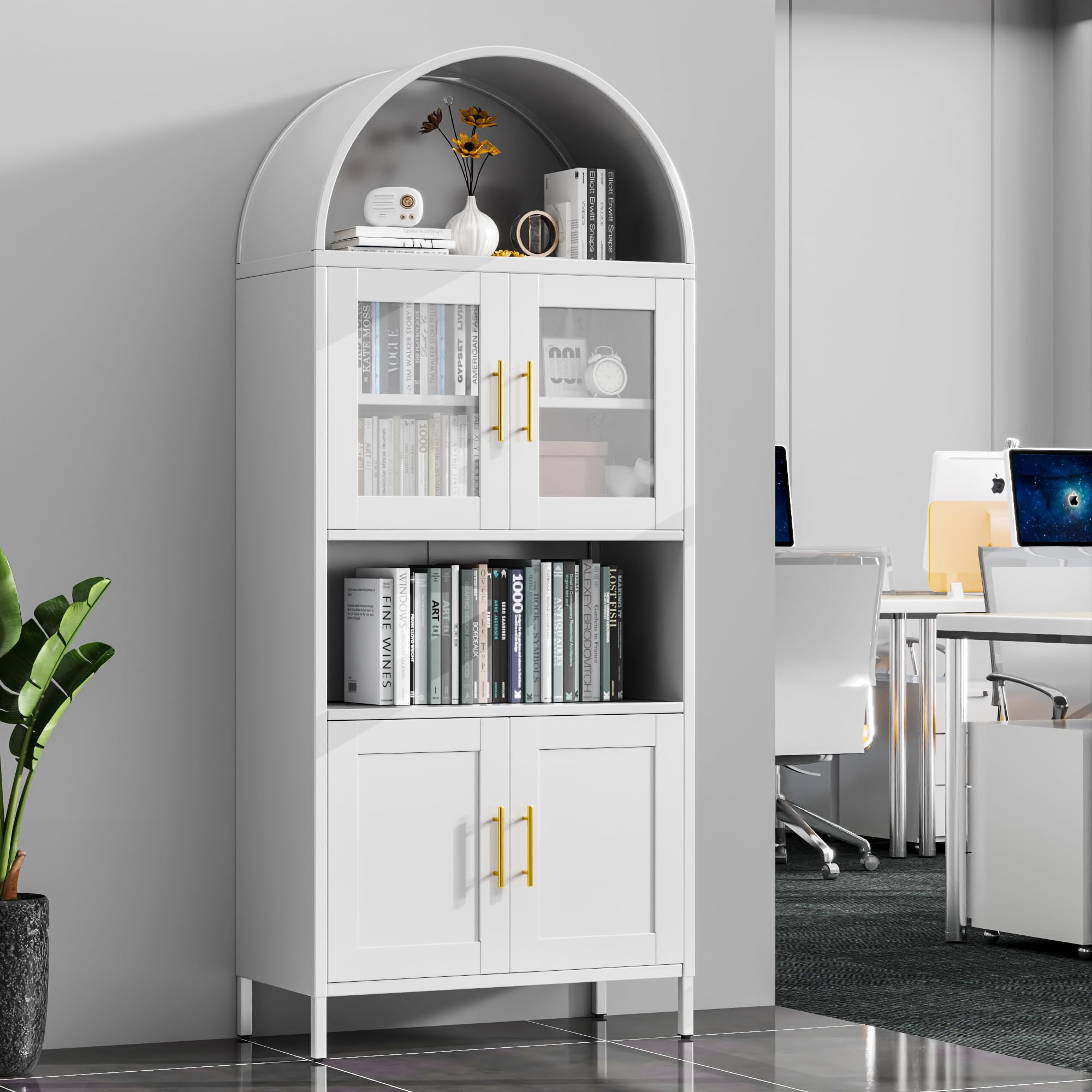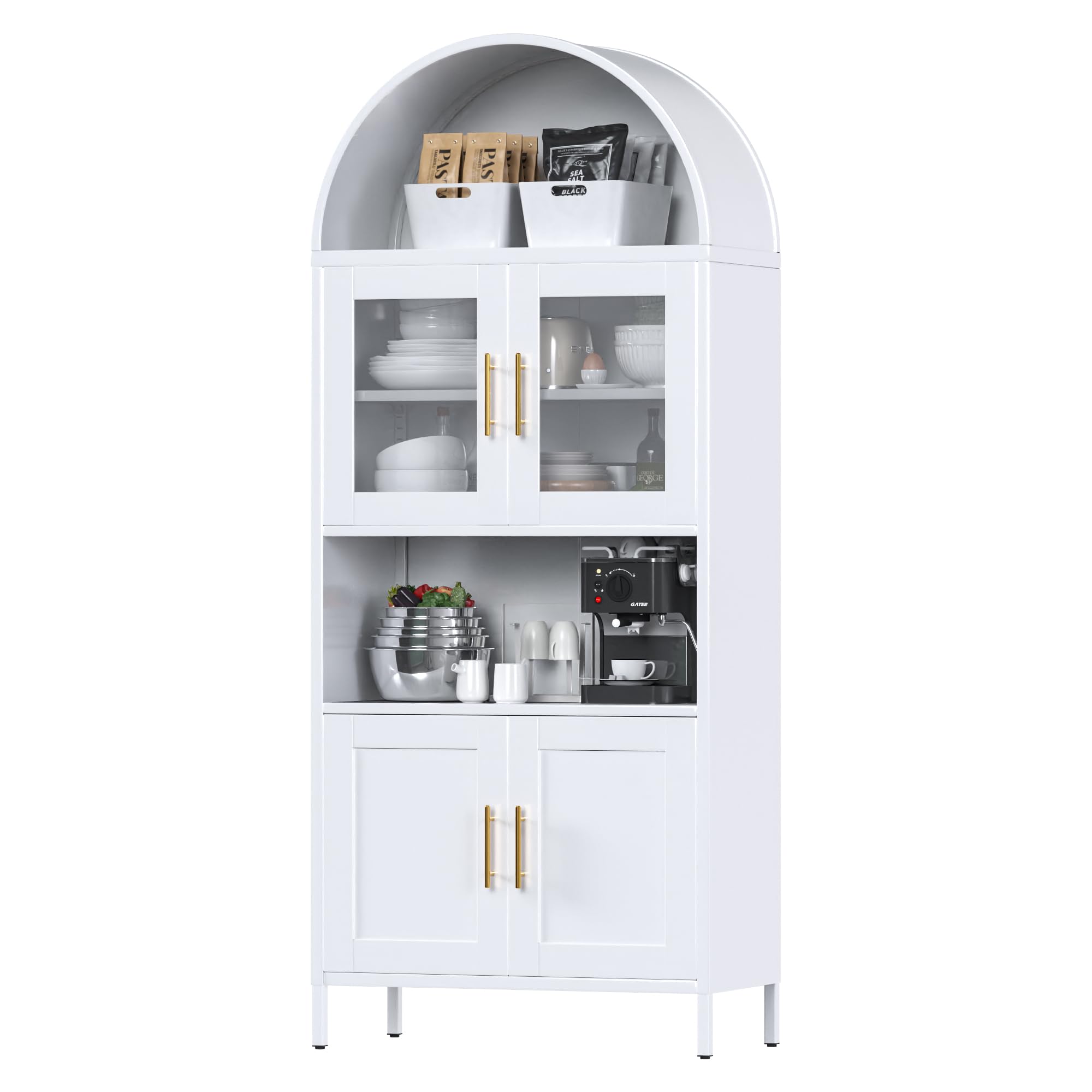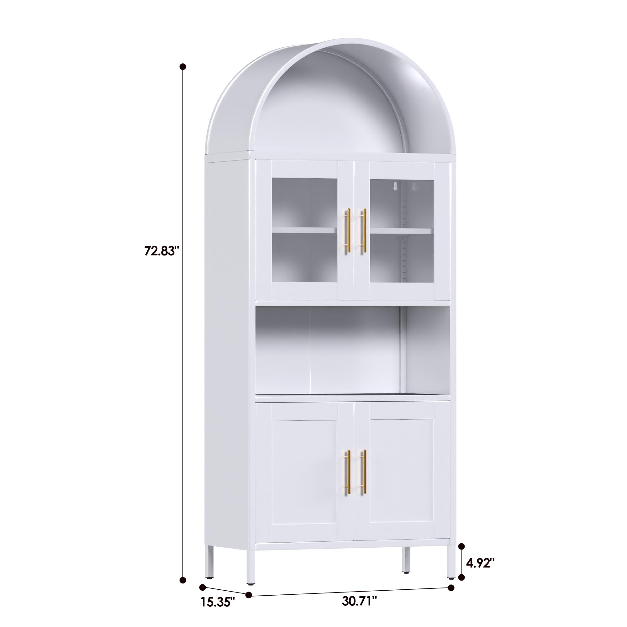 73 In Tall Metal Arched Cabinet, Kitchen Pantry Cabinet With Glass Door, Modern Farmhouse Arched Bookcase With 2 Adjustable Shelves For Living Room, White, Assembly Required