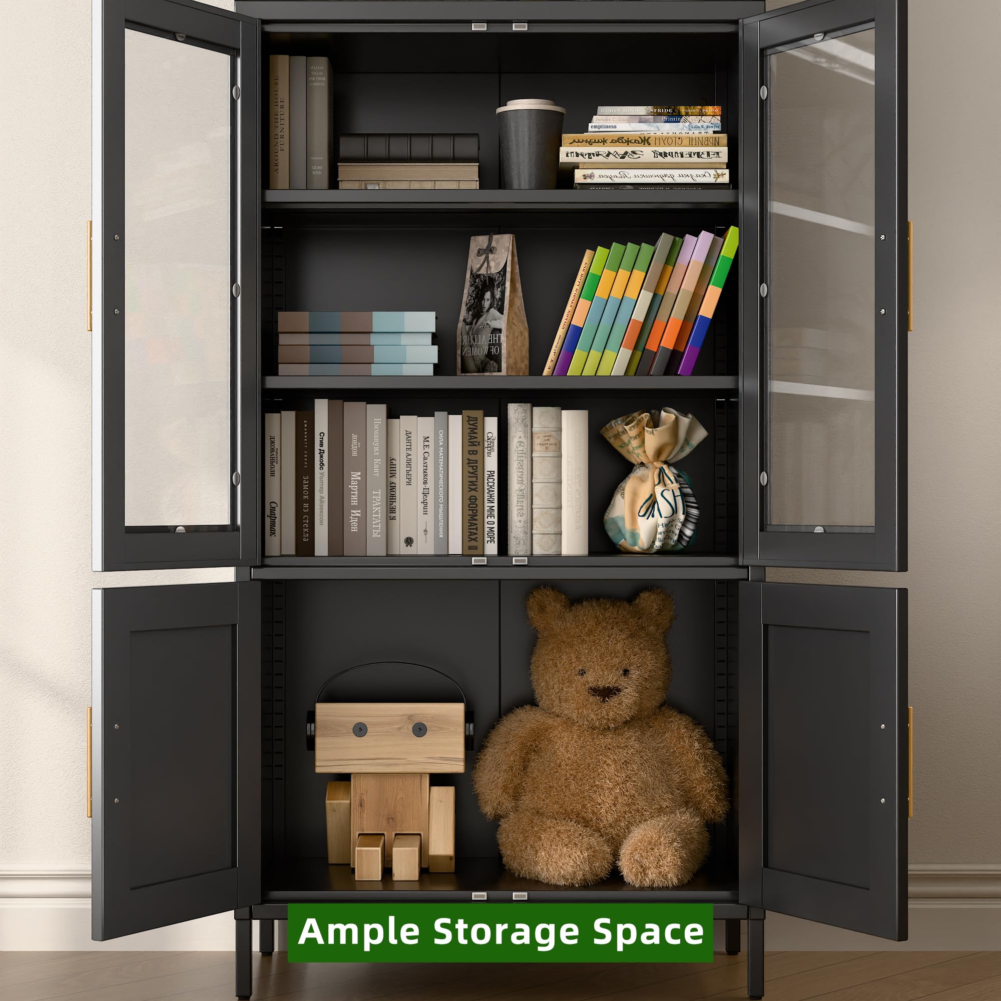 【Arched Cabinet with Doors】Black arched cabinet has 2 glass doors and 2 metal doors, can store different items. The design of the glass door not only makes it convenient for us not to open the door to confirm the items stored inside but also to isolate the dust in the air