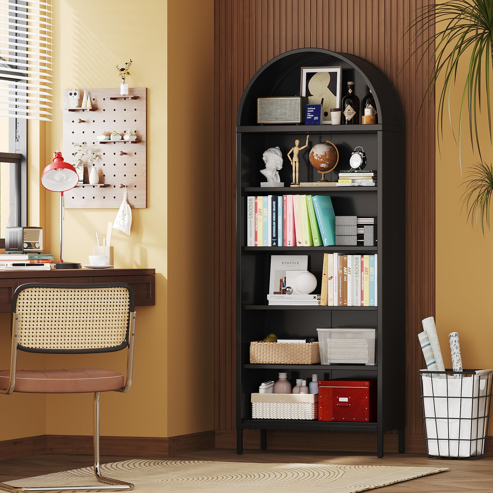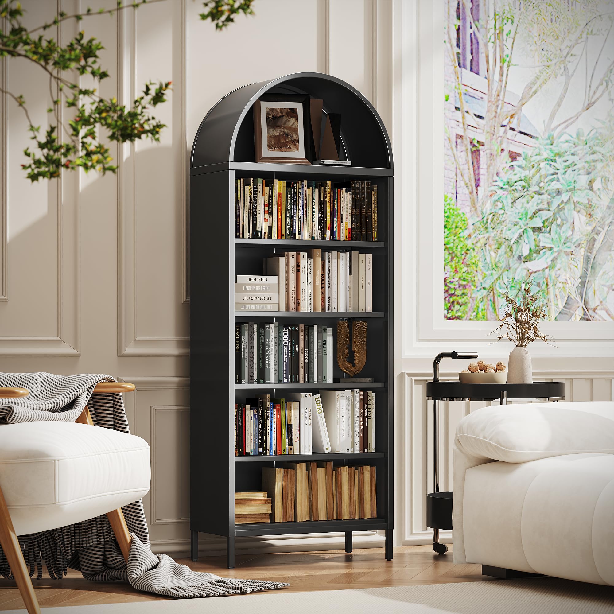 • Crafted from durable metal material, this robust arched cabinet bookshelf offers exceptional strength. Each of its shelves provides a remarkable load-bearing capacity of 150 lbs for your heaviest items.