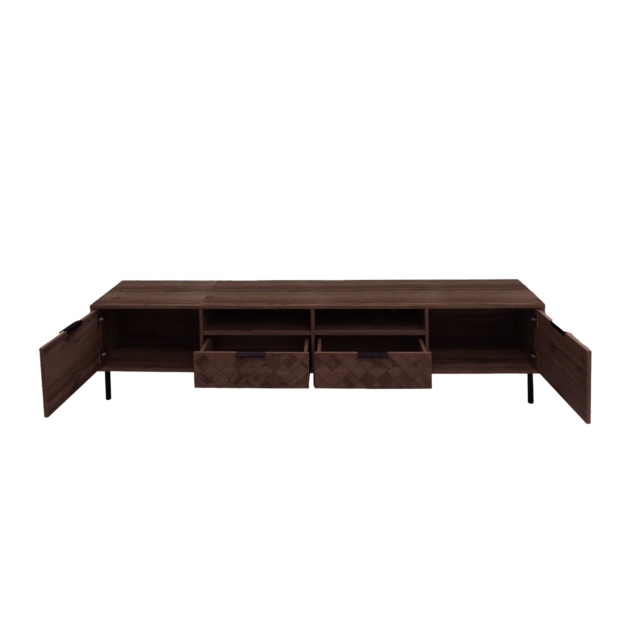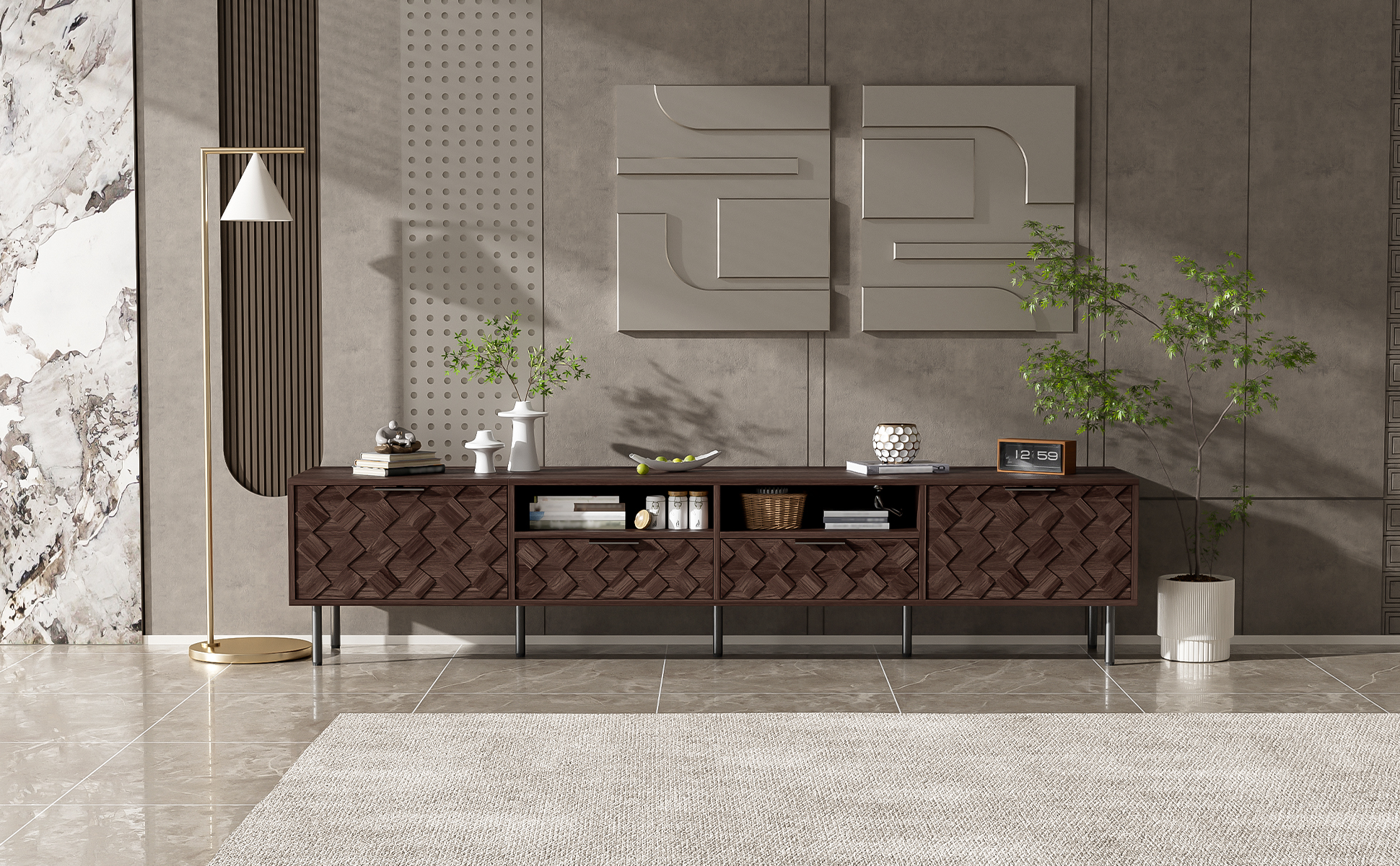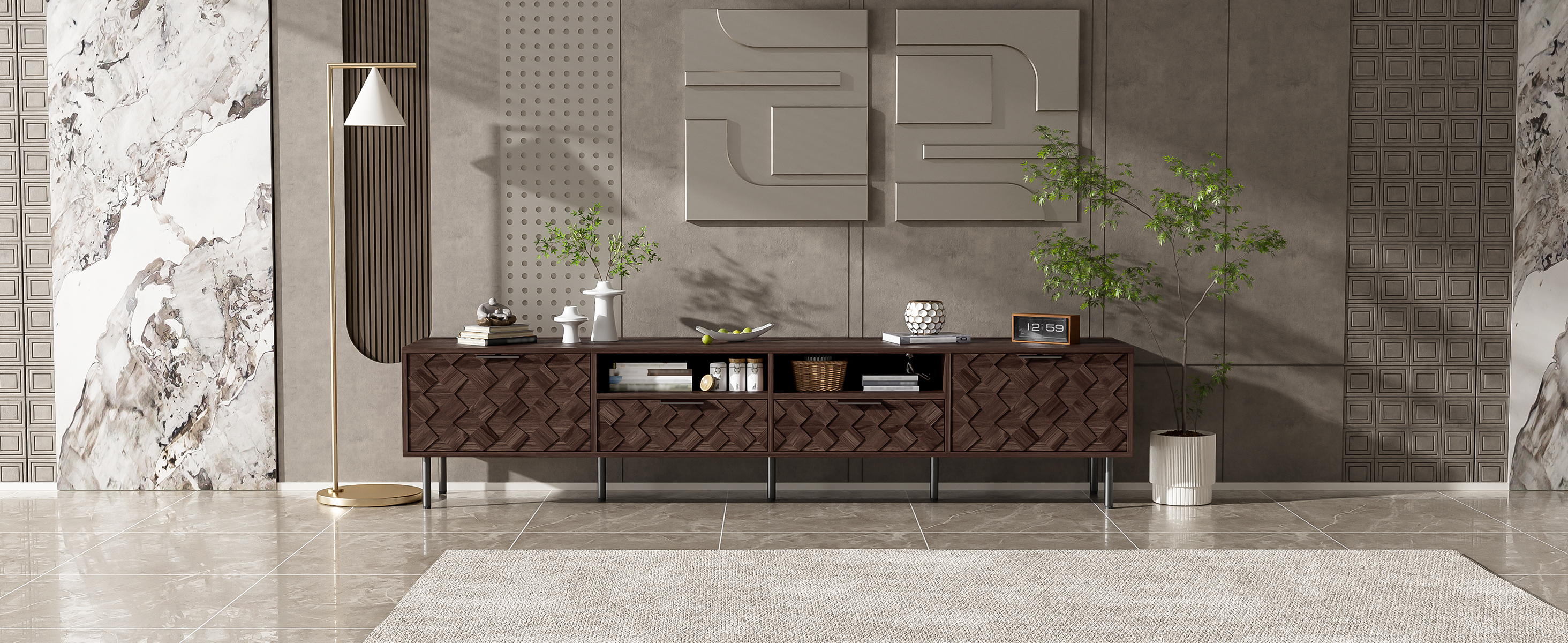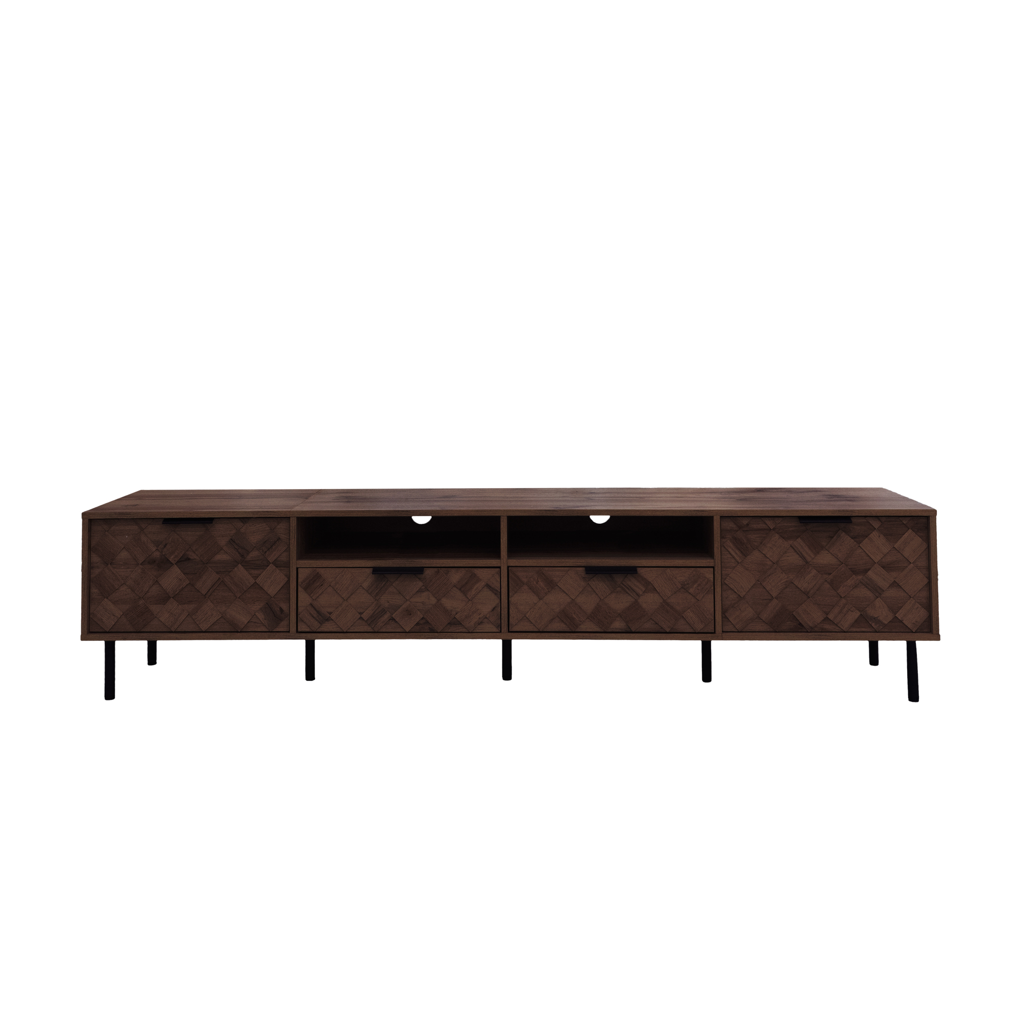 Designed with a 3D diamond interwoven pattern, this console combines style and thoughtful functionality. It features integrated cable management ports to keep wires organized and sleek metal handles for a refined finish. Every detail is crafted to enhance both visual appeal and daily convenience.