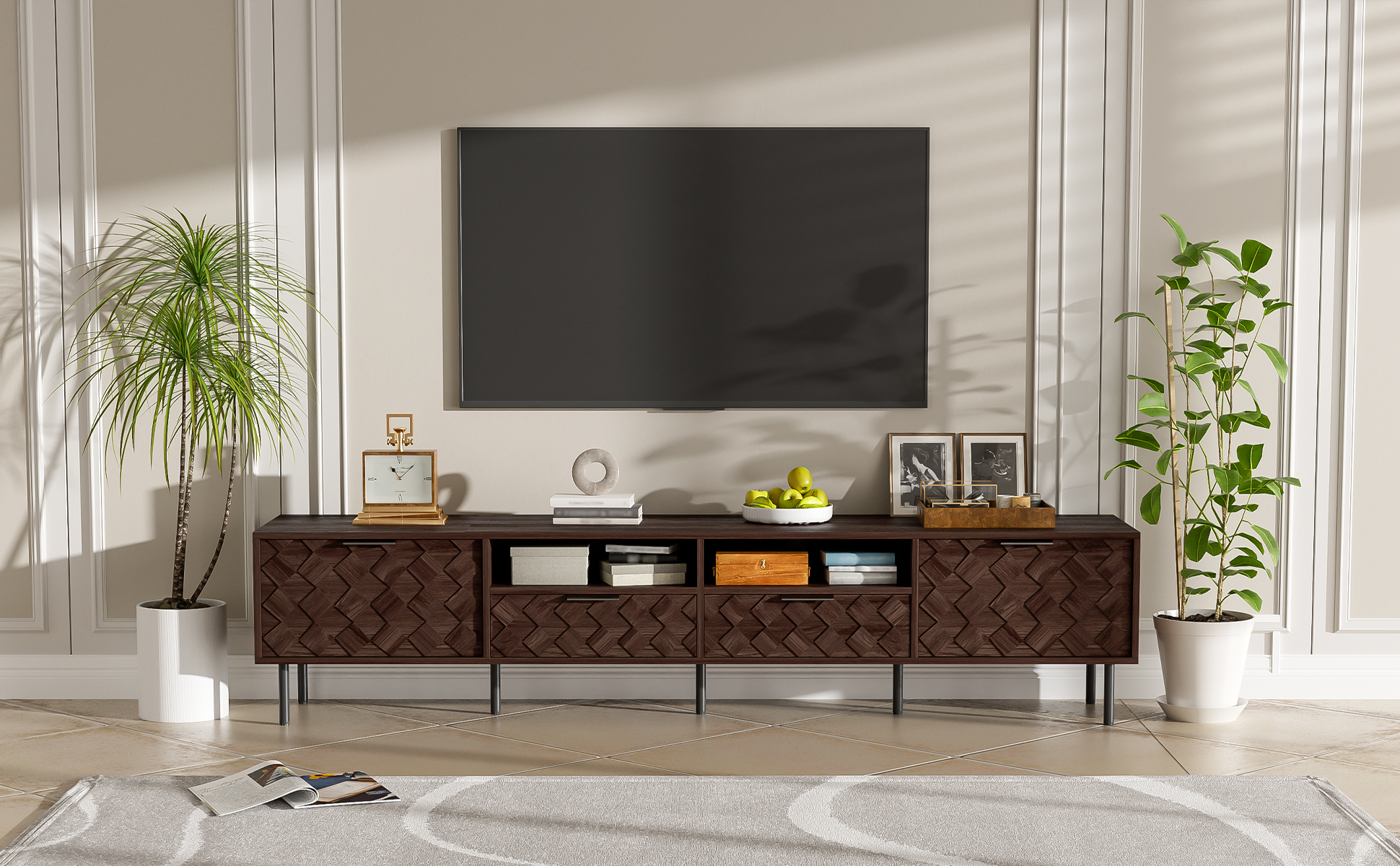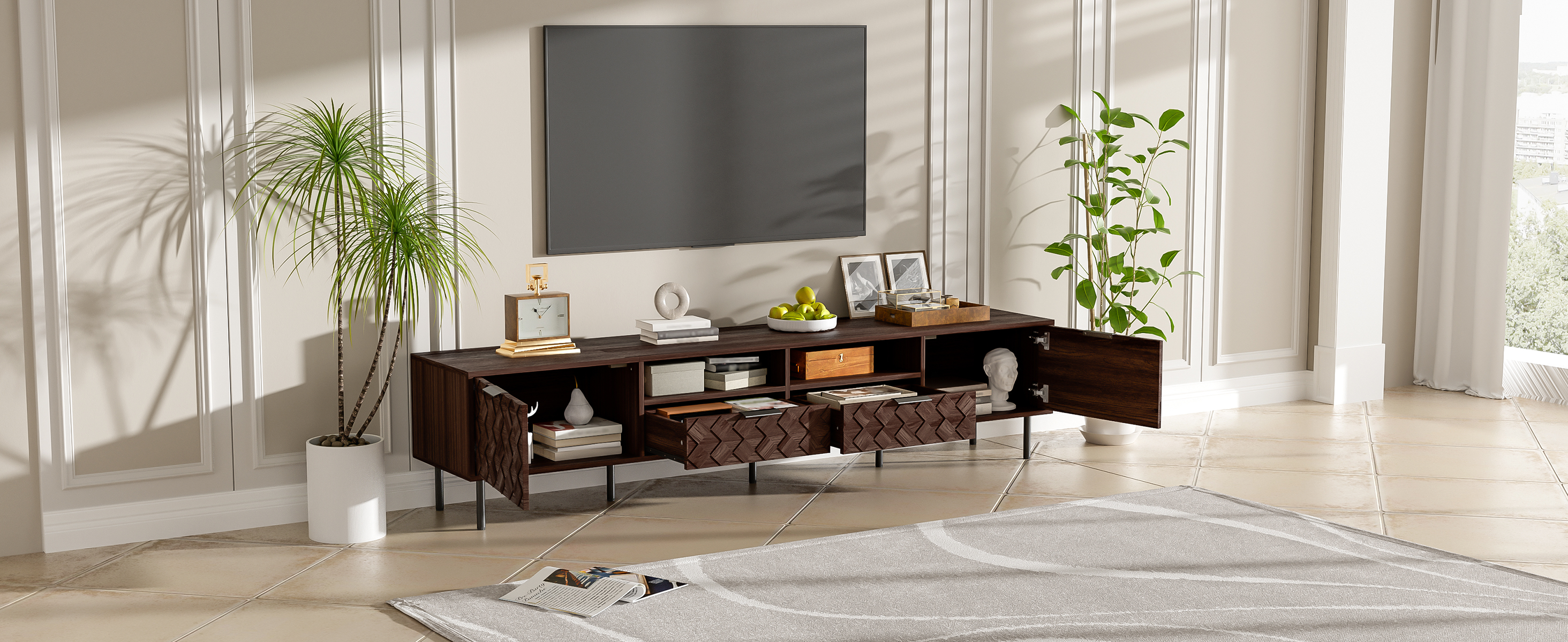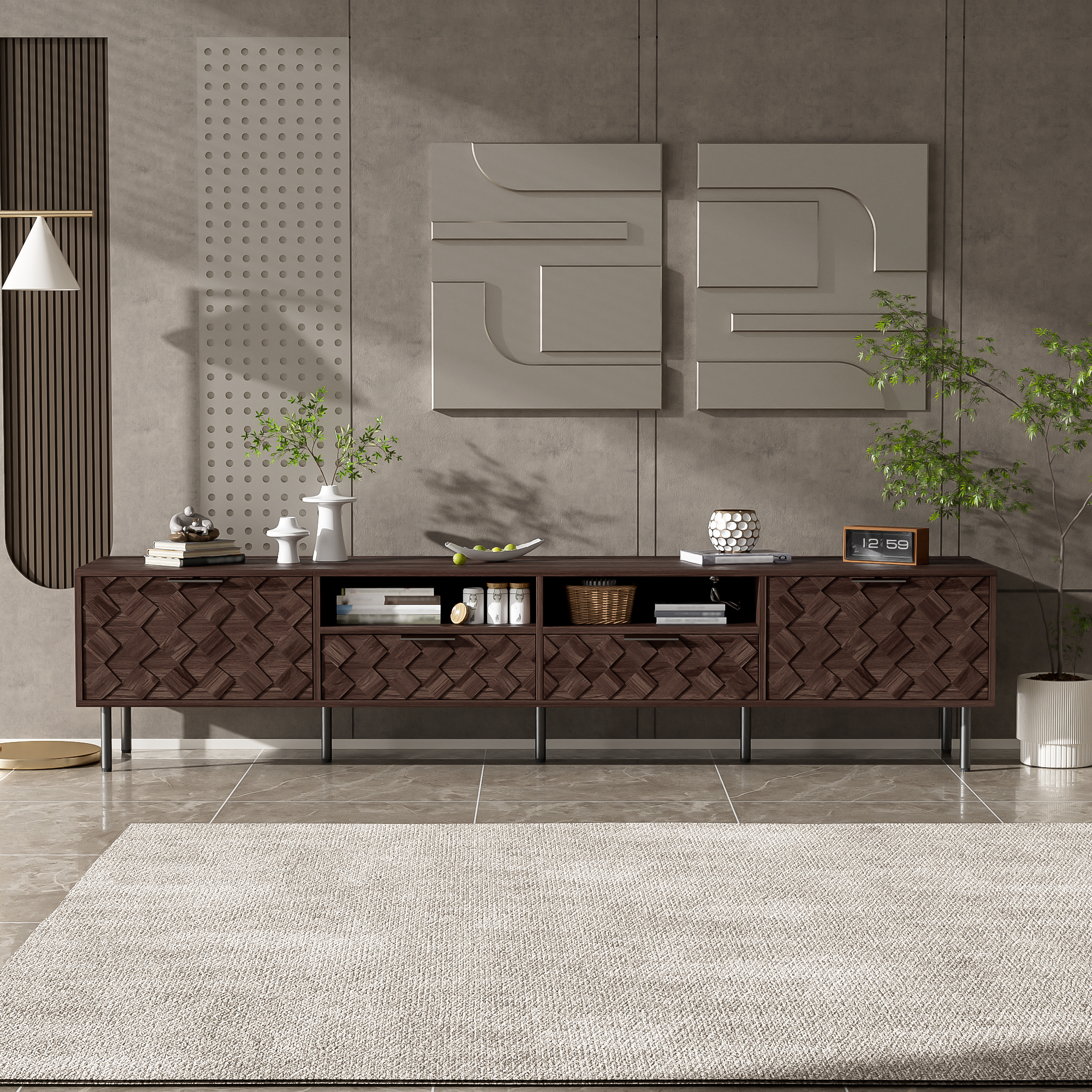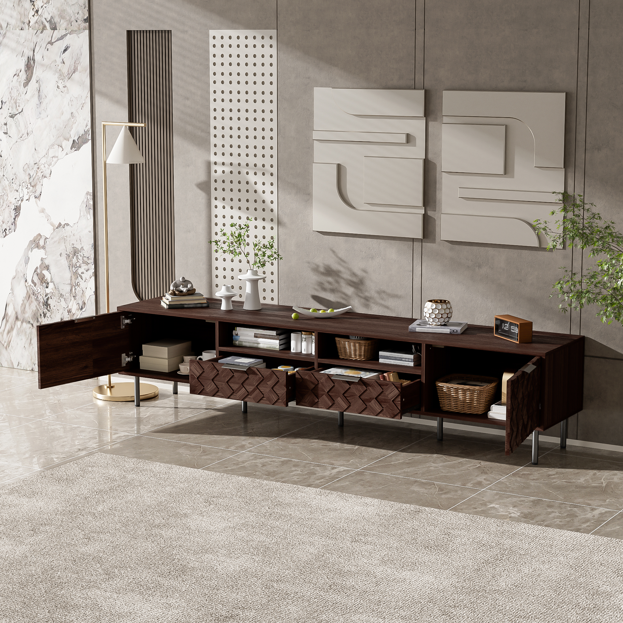 This TV console artfully blends refined style with thoughtful functionality. Its distinctive 3D diamond interwoven pattern creates a subtle interplay of light and shadow, adding unique design character to your space. The generous top securely accommodates 65" to 85" TVs, supported by a robust 88 lb load capacity. Discreet cable holes maintain tidy wire management, while soft-close hinges ensure smooth and whisper-quiet operation—uniting form, stability, and intelligent everyday convenience.
