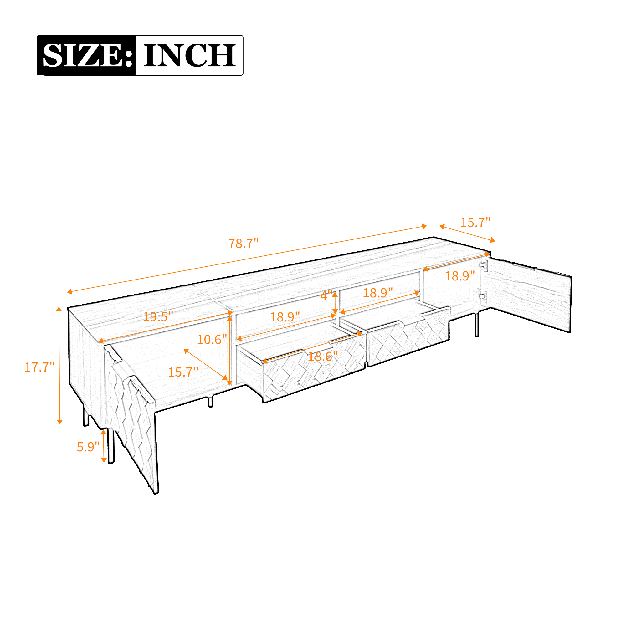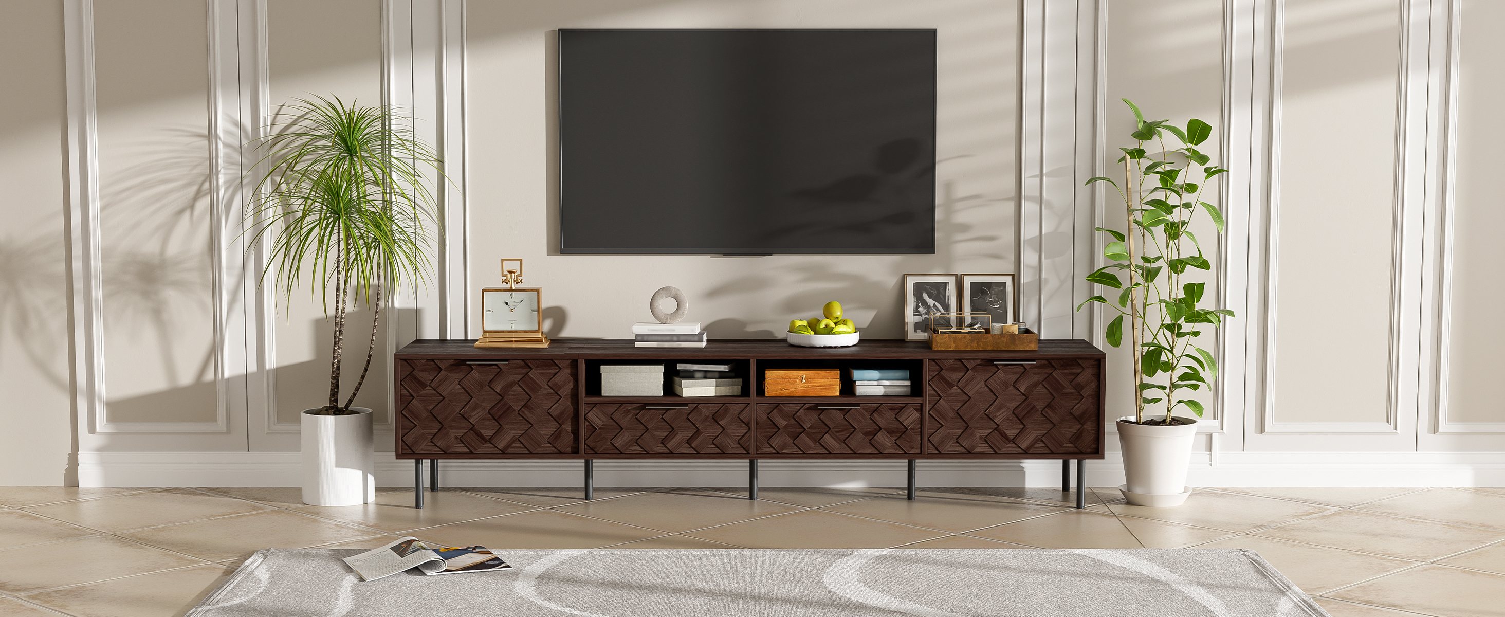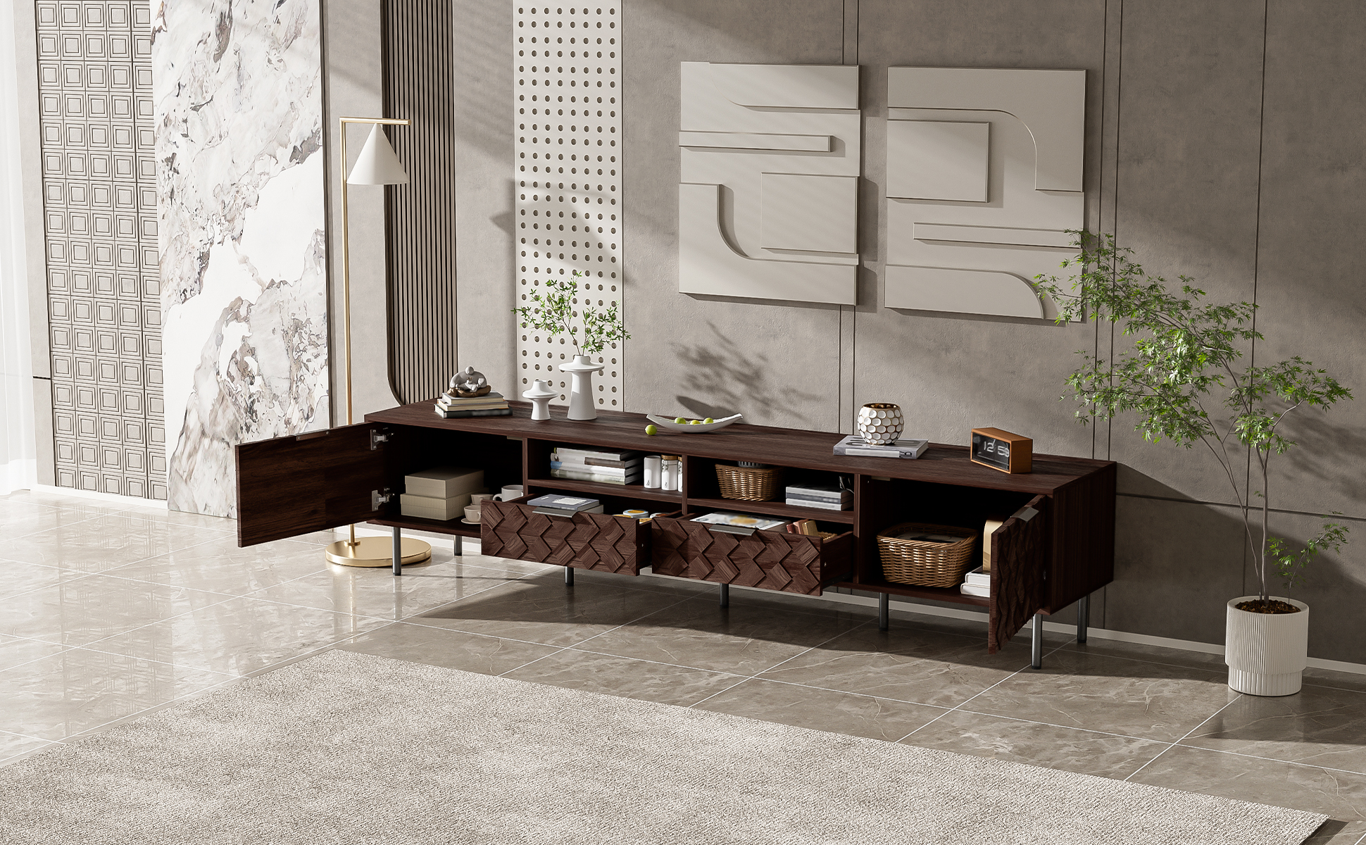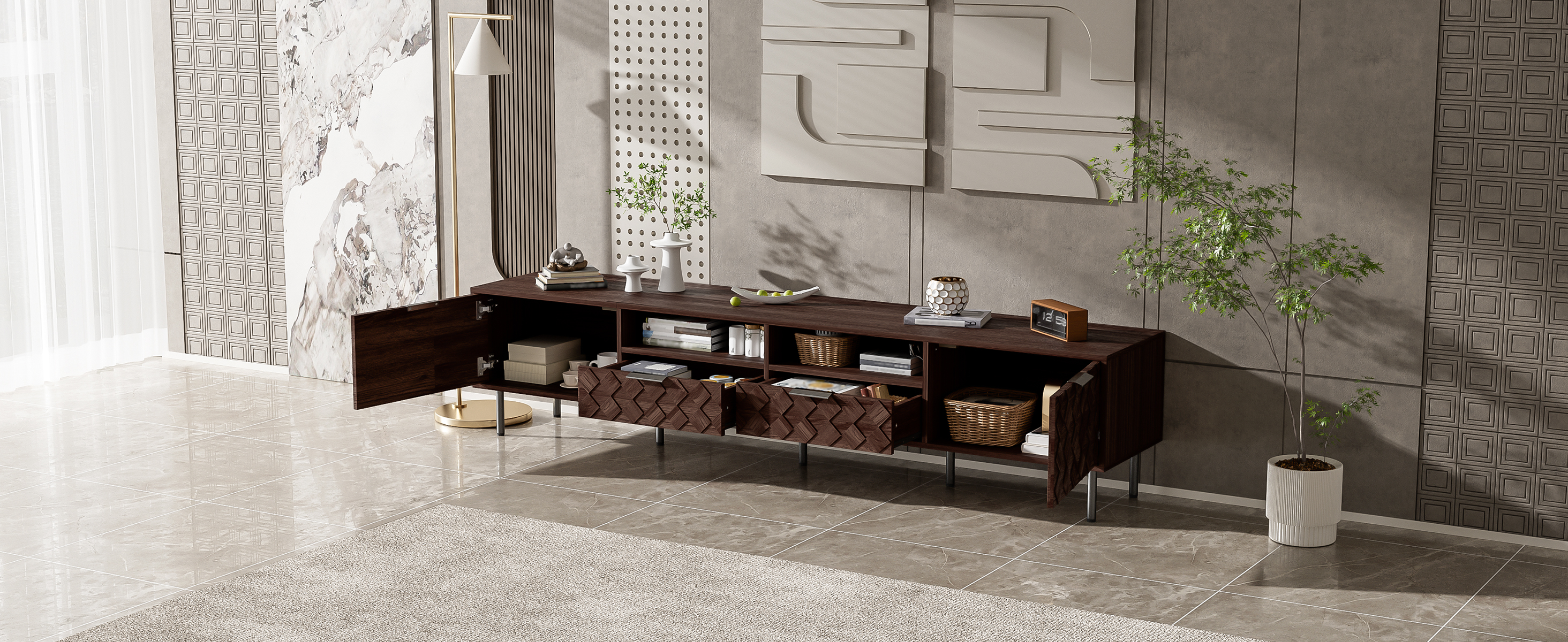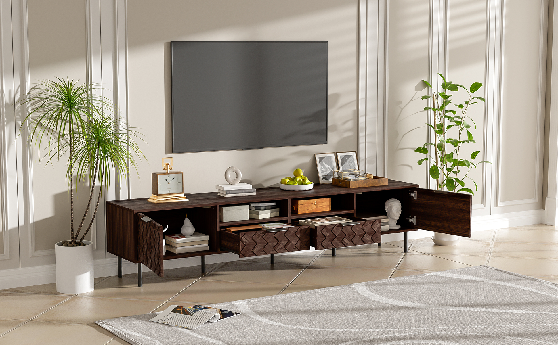 This TV console artfully blends refined style with thoughtful functionality. Its distinctive 3D diamond interwoven pattern creates a subtle interplay of light and shadow, adding unique design character to your space. The generous top securely accommodates 65" to 85" TVs, supported by a robust 88 lb load capacity. Discreet cable holes maintain tidy wire management, while soft-close hinges ensure smooth and whisper-quiet operation—uniting form, stability, and intelligent everyday convenience.