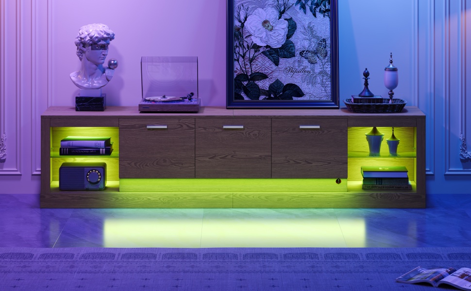 1.Private storage space and open shelving work perfectly together 2. 15 mm Tempered Glass Shelf 3. Double Cable Management Holes 4. Modern Minimalist Style 5. Soft Close Hinges 6.High Quality Accessories 7. LED Lights (4 Dynamic Modes, 16 Colors Change)