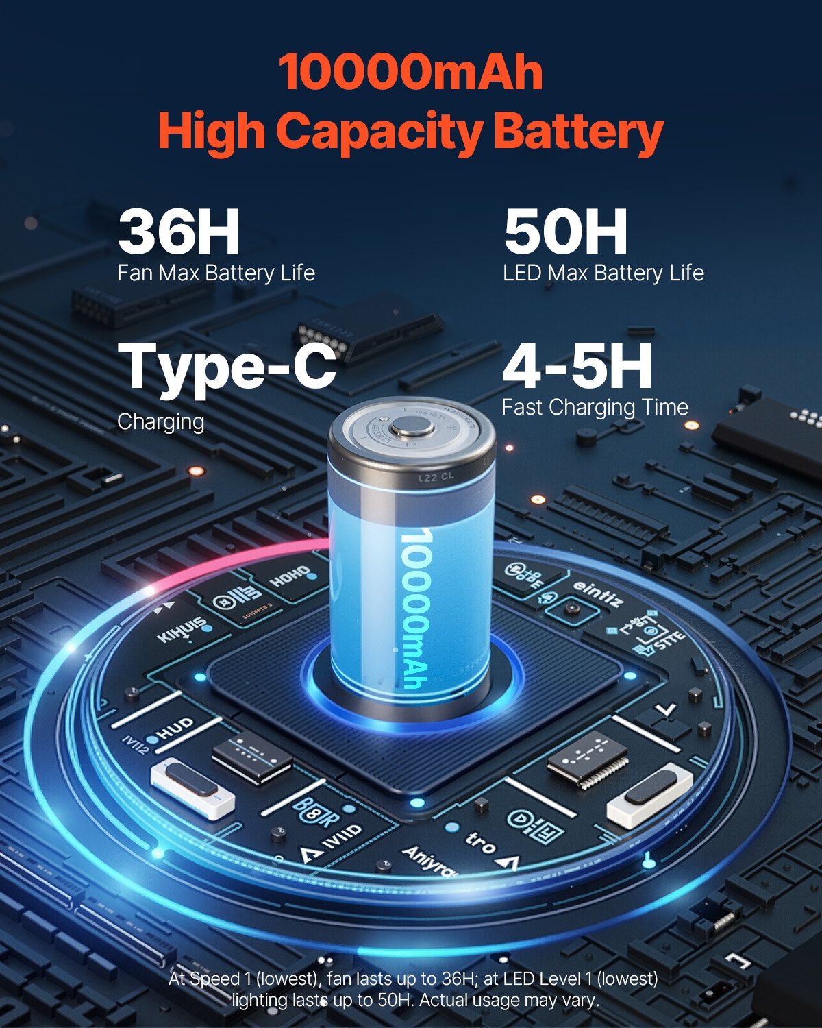Long-Lasting Battery: Equipped with a 10,000mAh battery, it takes 4-5 hours to fully charge. When fully charged, the small fan can run for up to 36 hours on the lowest speed, while the LED light can last up to 50 hours on the lowest setting. The convenient Type-C charging port allows for faster and more efficient charging, offering great compatibility whether you're at home or outdoors