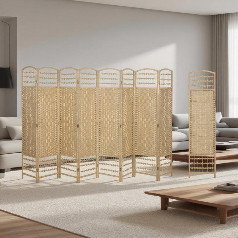 Features: - Great for creating a personal space or dividing up large rooms - Diamond woven paper fiber panel for a natural tone and lightweight portability - Folding design with four panels and nine twelve hinges that make it easy to create a new look and ensure space-saving storage - Solid pine wood frame for sturdiness - Elevated feet for more air circulation - No assembly required Specification: - Color: Natural - Materials: Paper, Bamboo, Pine Wood - Overall Dimensions: (Expanded) 126" L x 0.5" D x 67" H - Overall Dimensions: (Folded) 15.5" W x 4.7" D x 67" H - Each Panel Size: 15.5" W x 67" H - Foot Height: 2.25" H - Package Includes: - 1 x Privacy Screen - 1 x Manual