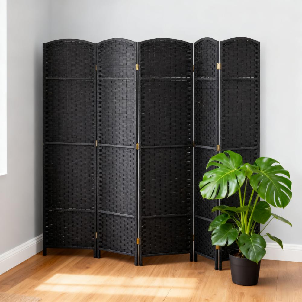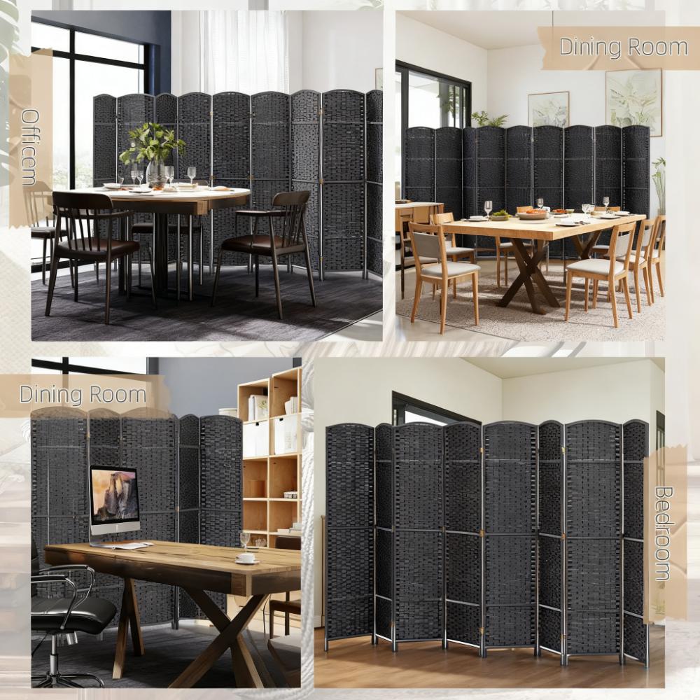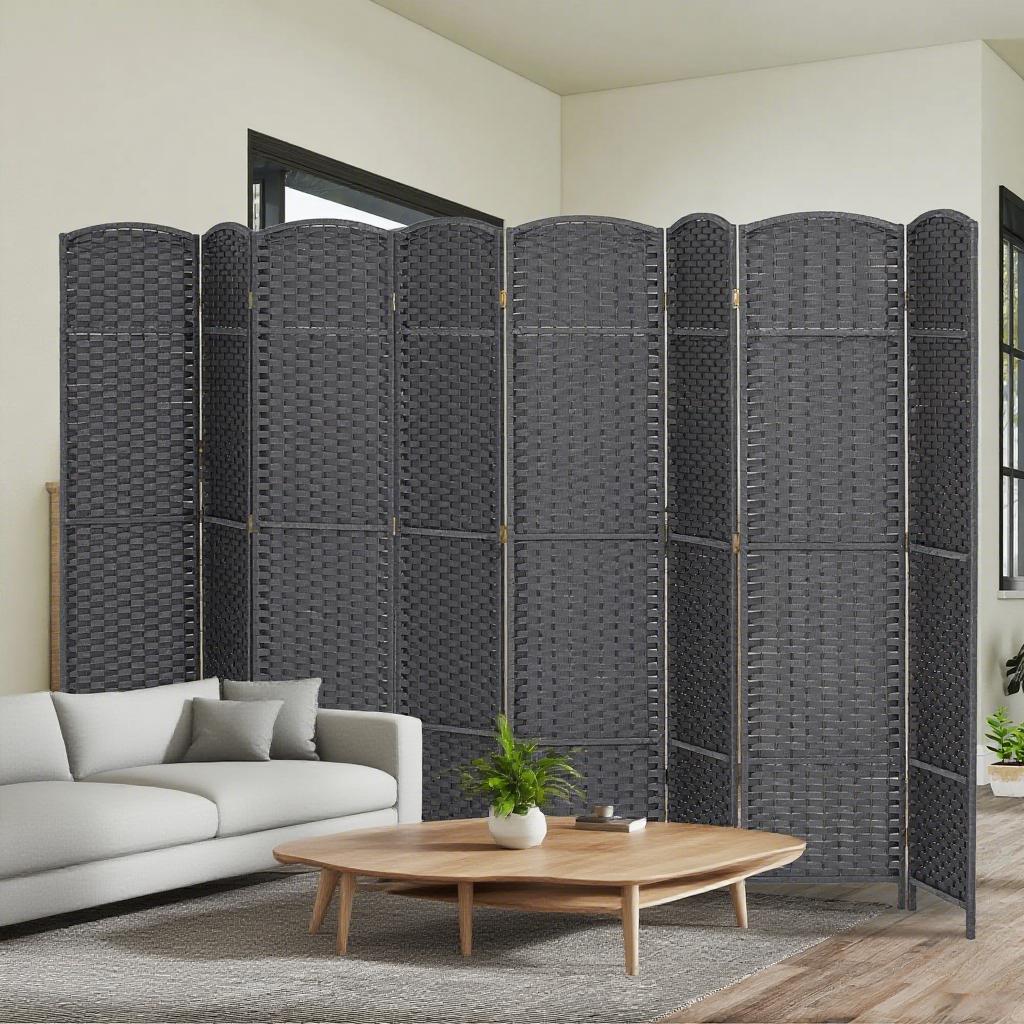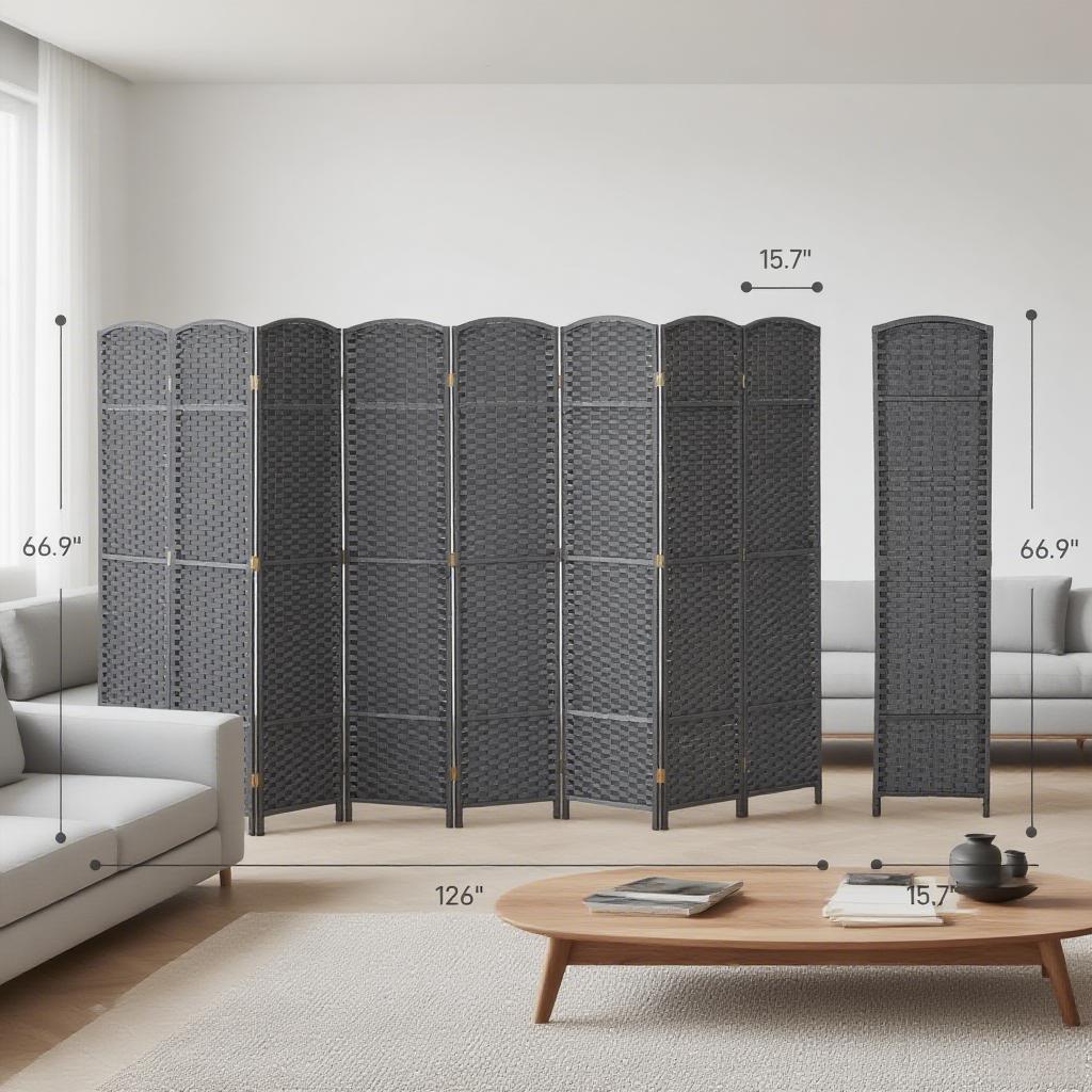 Features: - It features a weaving pattern with an elegant arched top - Create private sections or use it as a decorative background in any room - Solid pine wood frame provides strong support - Polypropylene assures enhanced privacy and durability - Eight-panel folding design with 21 metal hinges allows for easy storage - A lightweight design makes it easy to move - No assembly required Specification: - Color: Charcoal Gray - Materials: Polypropylene, Pine Wood - Overall Dimensions: 126" W x 0.6" D x 66.9" H - Folded Dimensions: 15.7" W x 6.3" D x 66.9" H - Single Panel Size: 15.7" W x 0.6" D x 66.9" H - Foot Height: 2.6" H - Net Weight: 16 lbs. - Package Includes: - 1 x Room Divider - 1 x Manual
