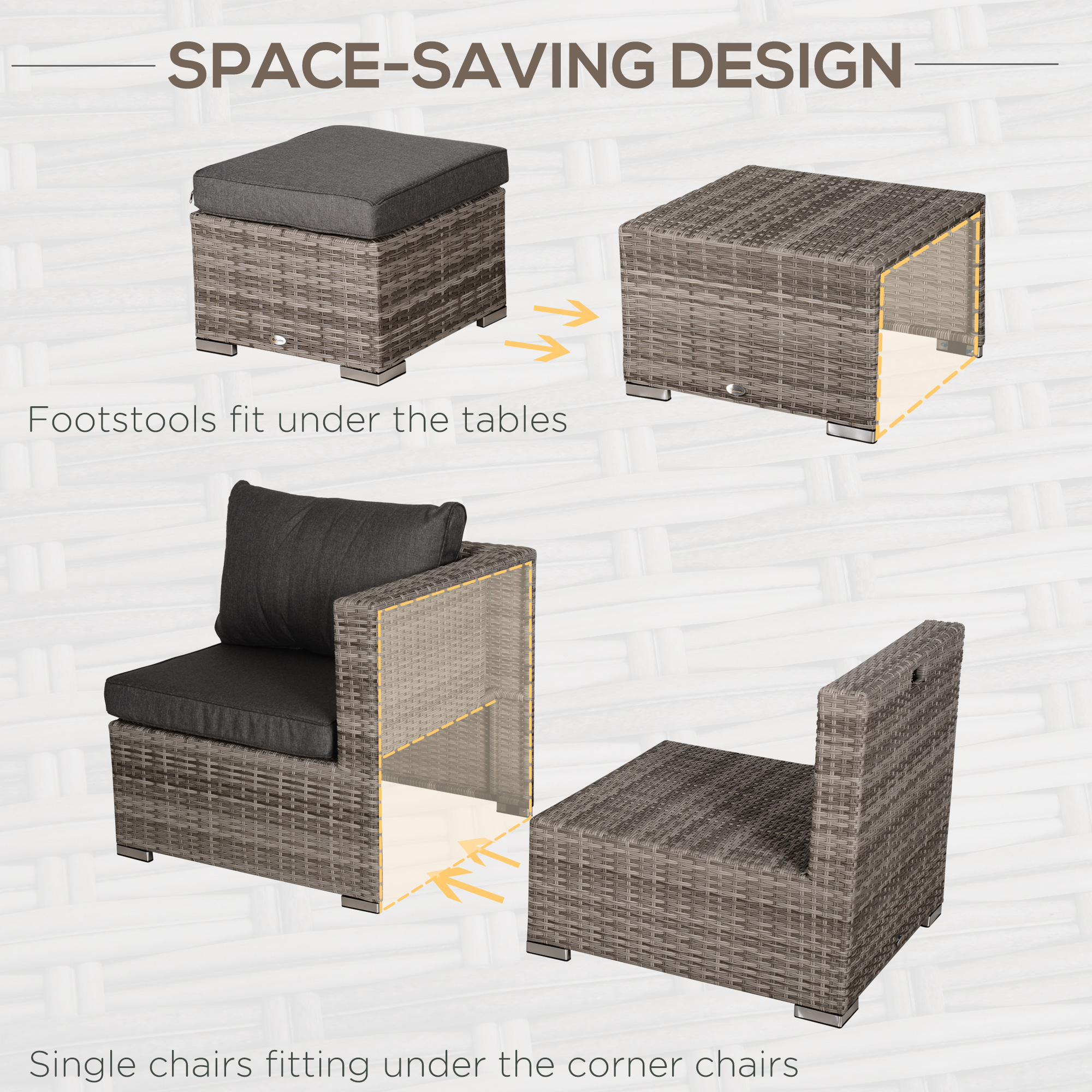 Take comfort to your garden with this eight-piece outdoor furniture from . Powder coated steel frames make each piece strong and supportive, wrapped in plastic wicker for a stylish rattan look; also creates a protective shell. Set comes with two armless chairs, two footstools and two square tables - seats up to six people. Compact design: footstools fit under the tables and armless chairs fit into the corner chairs.