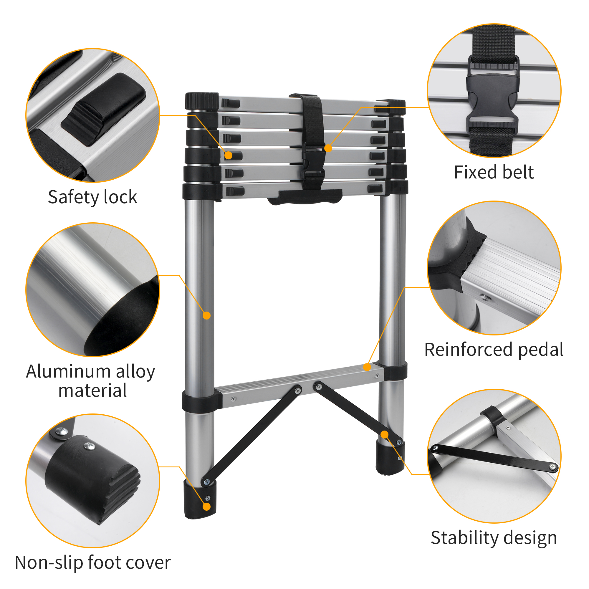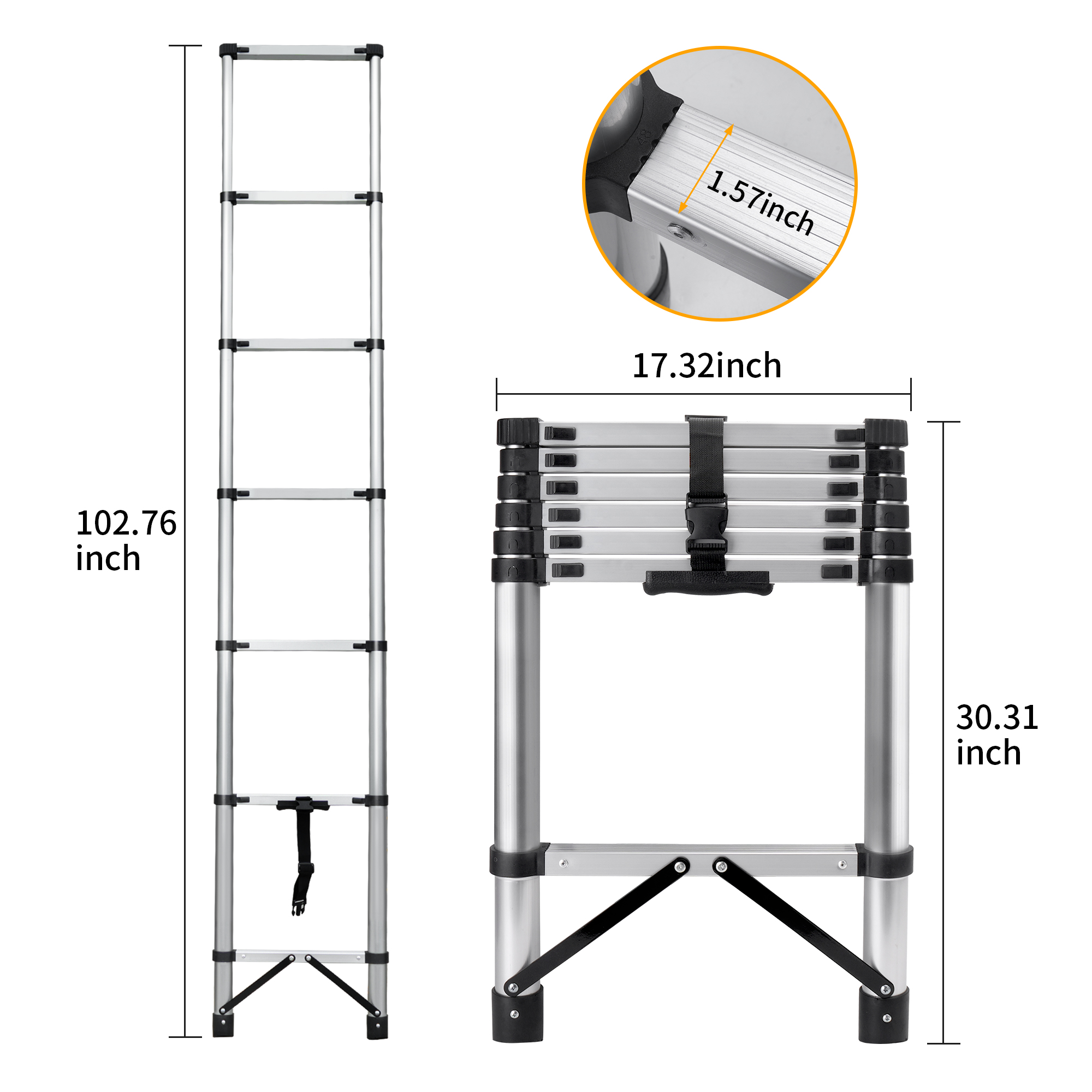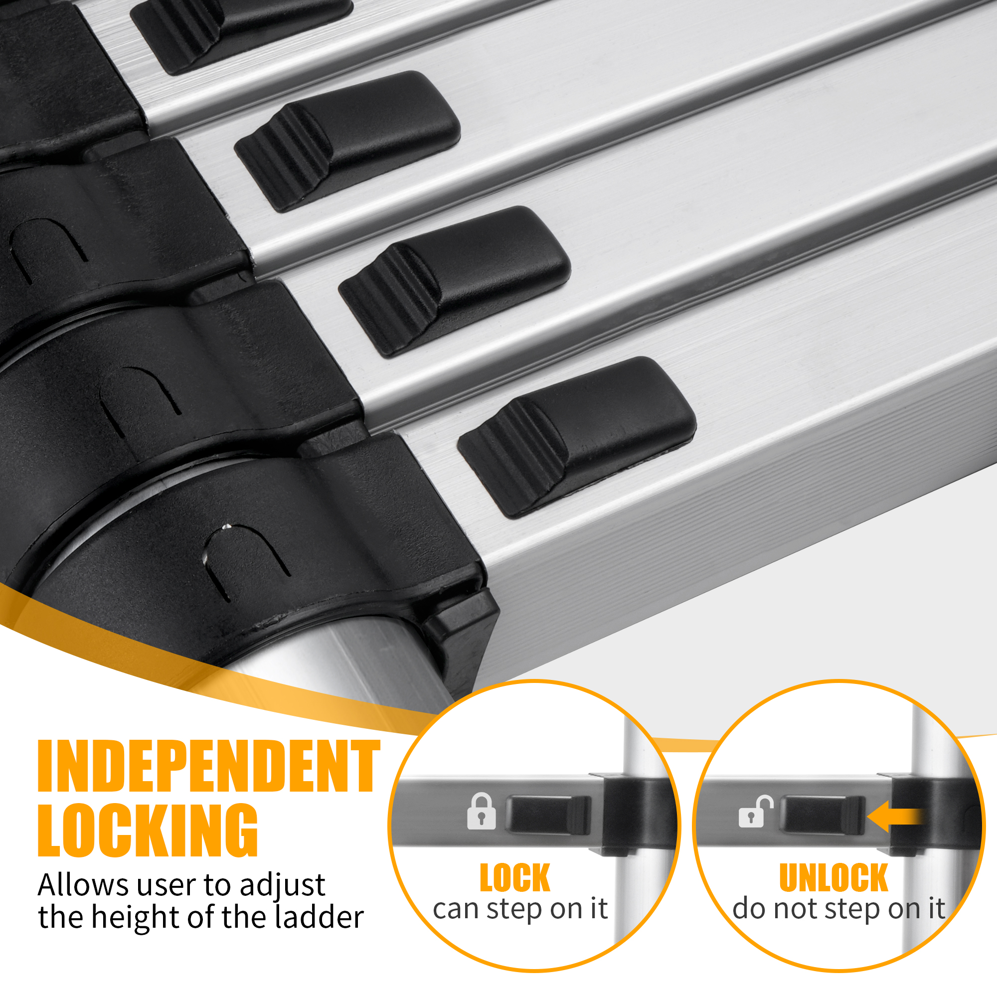 • 【Split Key Scaling】The aluminum telescoping ladder has a zoom function. Except for the top layer, each layer is equipped with a zoom button. You only need to push the button in to slowly retract the retractable ladder to its compact size, avoiding pinching fingers.