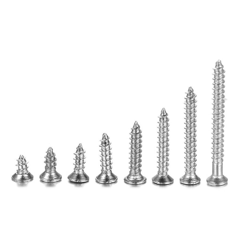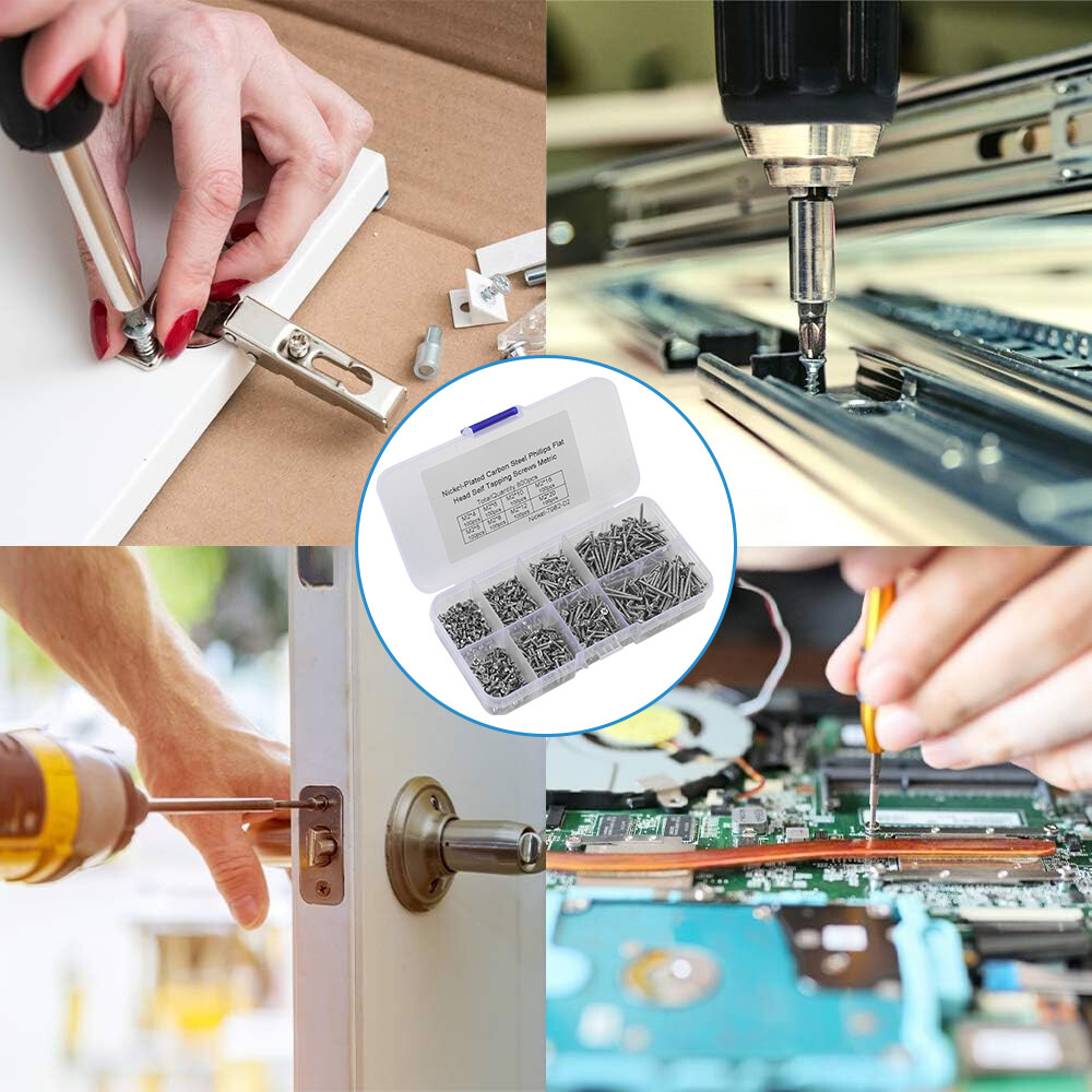 ãEasy to UseãThe flat head screws are more convenient to tighten, the screw head is sharp, easy to penetrate, suitable for metal plates, plastics, wood and other brittle materials.