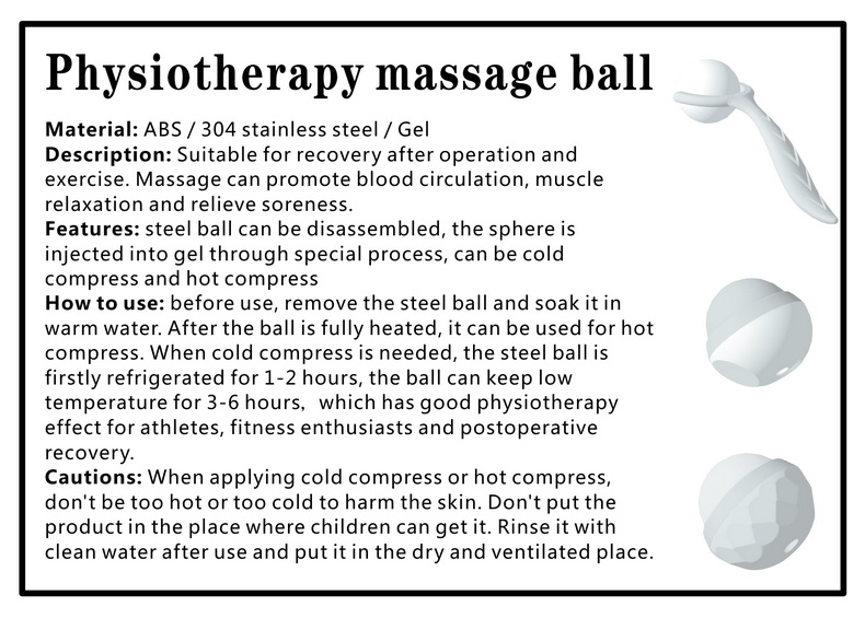 The steel ball can be disassembled, and the ball is injected with gel through a special process, which can be applied cold and hot. How to use: Before use, you can remove the steel ball and soak it in warm water. After the steel ball is completely heated, it can be used for hot compress; when cold compress is needed, first refrigerate the steel ball for 1-2 hours, and the ball can be kept at a low temperature for 3-6 hours. It has a good physical therapy effect for athletes, fitness enthusiasts, and postoperative recovery.