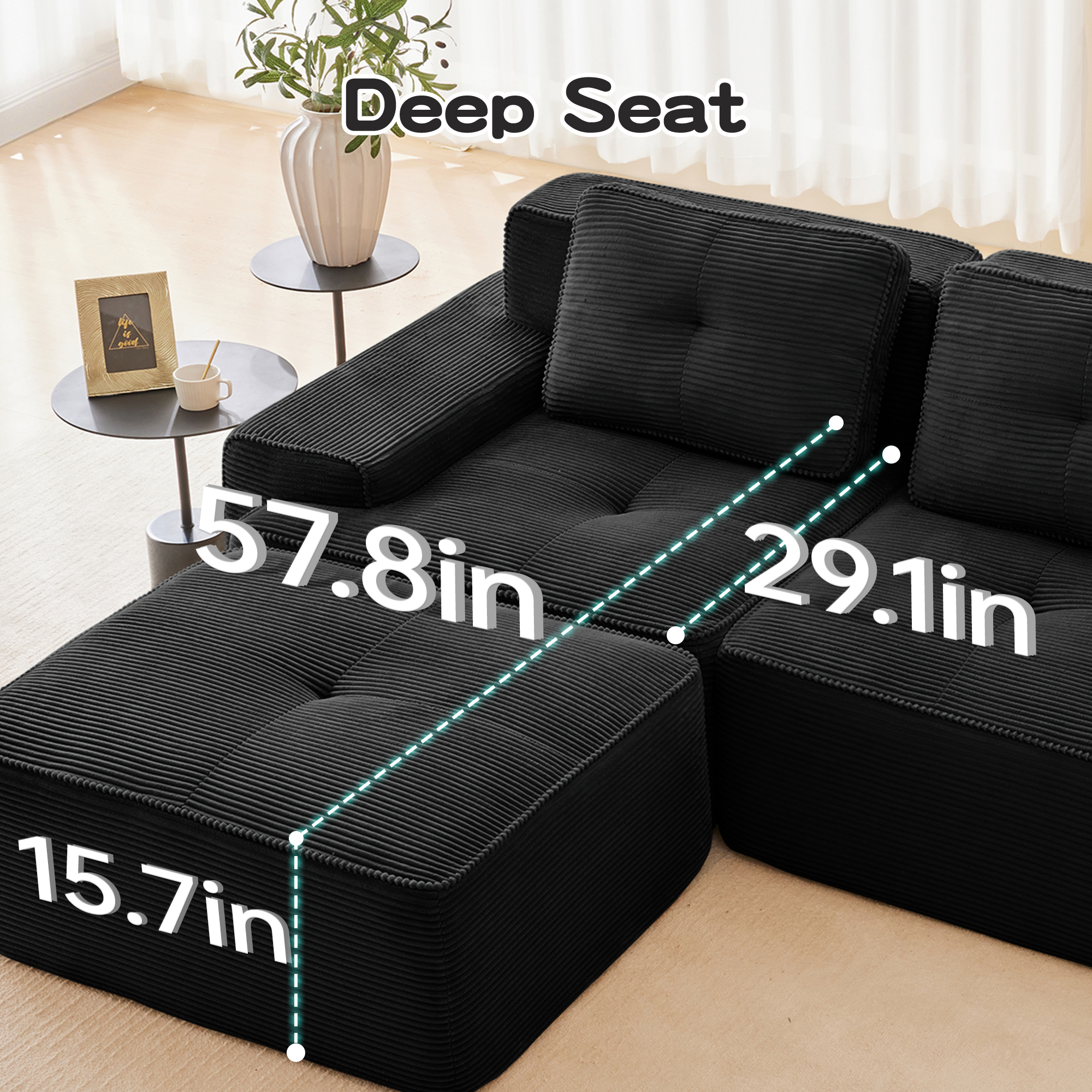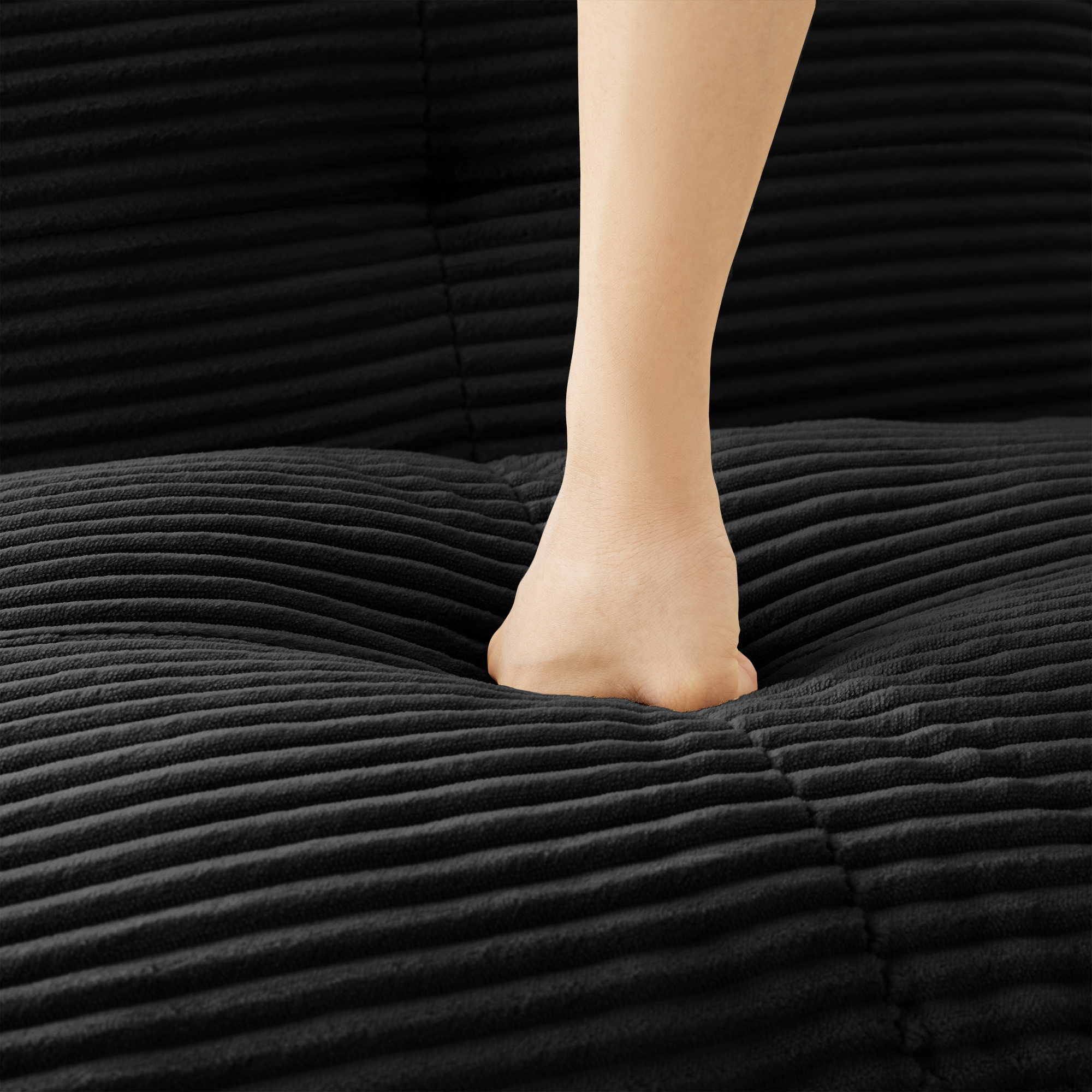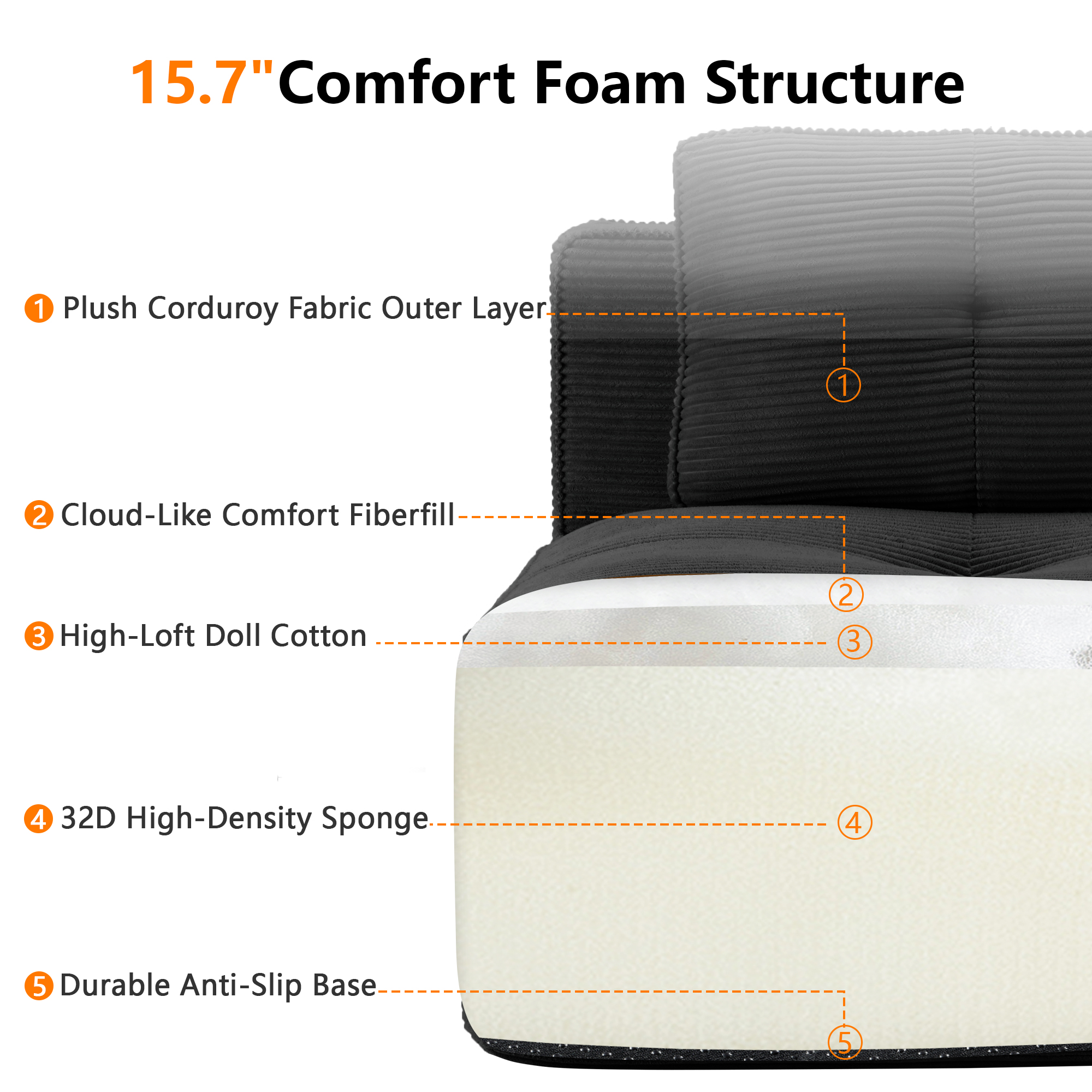 • Premium Corduroy Fabric: Immerse yourself in our velvety-soft corduroy fabric, offering a delicate touch alongside exceptional durability and abrasion resistance. This understated luxury material combines softness with warmth, delivering lasting comfort. Its distinctive texture and subtle sheen not only make the sofa stand out but also provide gentle care throughout every season, elevating your tactile experience.