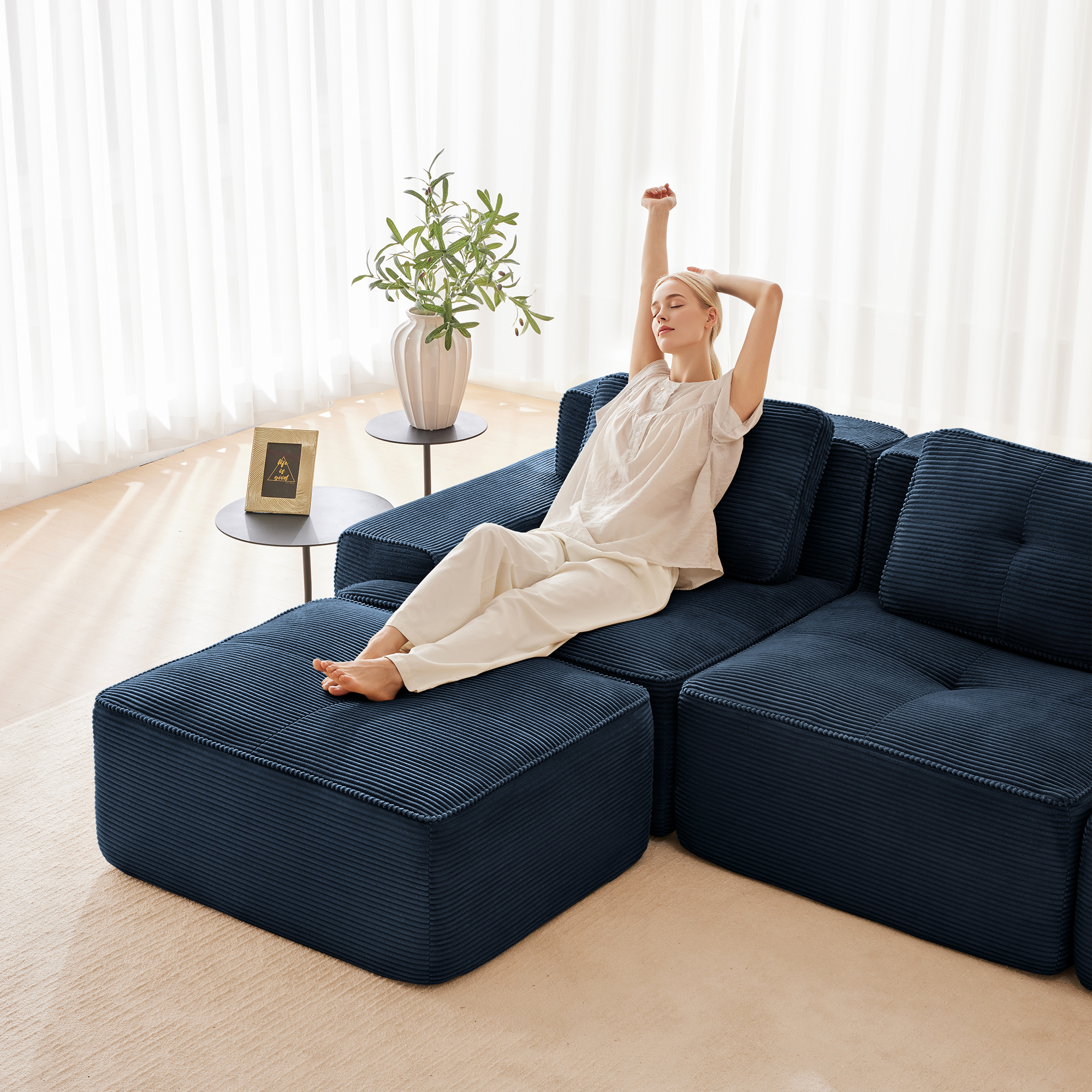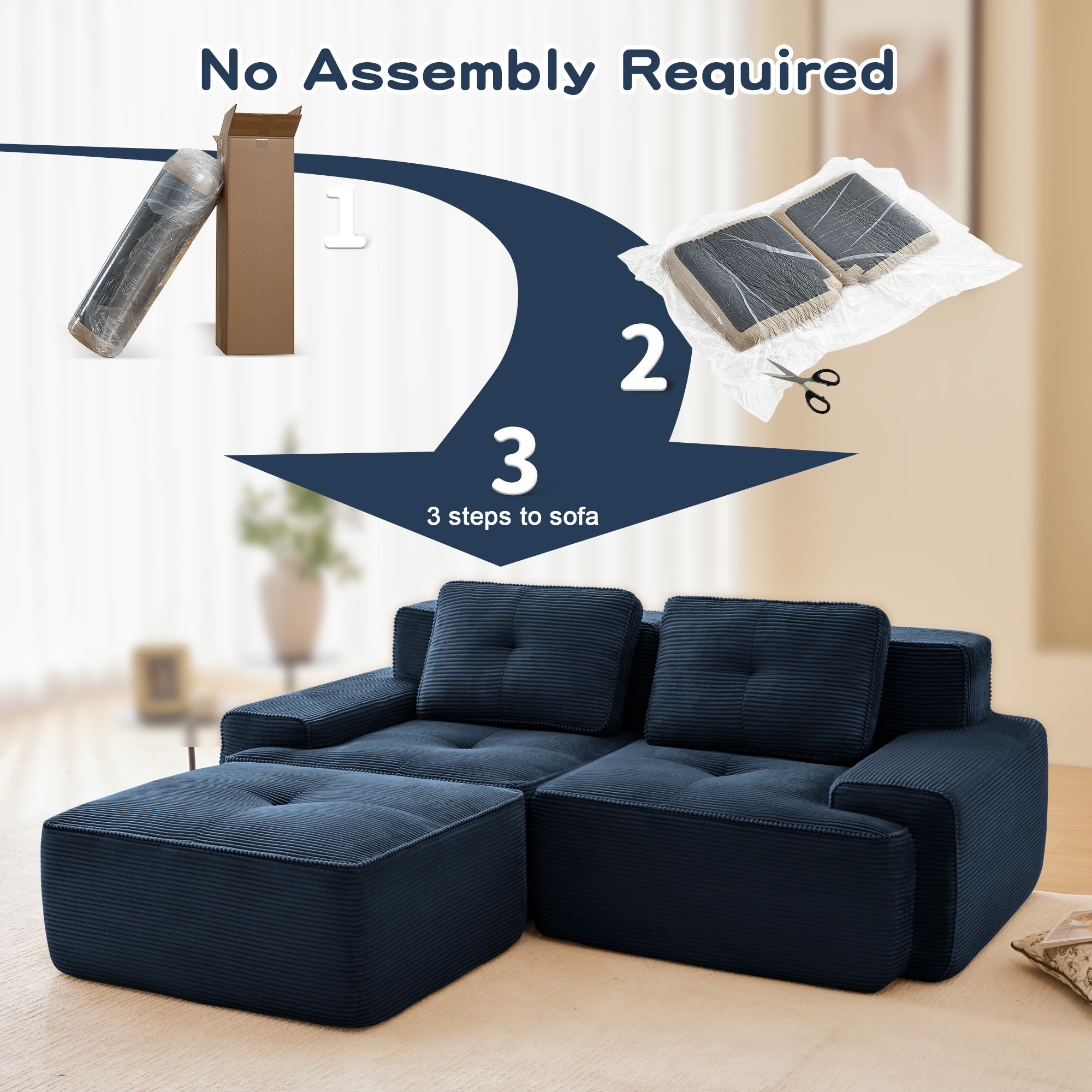 Product Name:82" Modern L-Shaped Modular Sectional Sofa for Living Room, Corduroy Fabric, 2-Seater Couch with Deep Seat and Movable Ottoman, Pearl-like piping, Tufted Design, No Assembly, Anti-slip Design, Blue