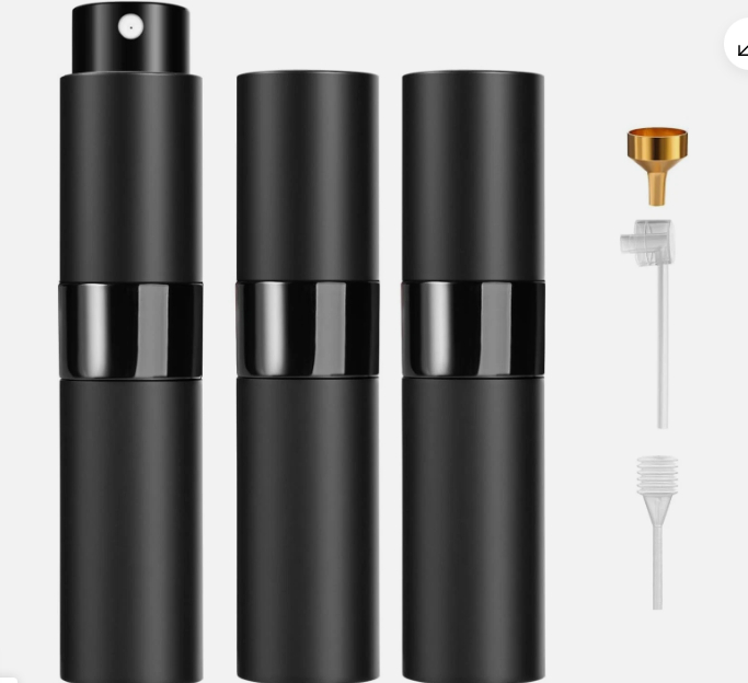 Specifications: Matte black, glossy black, pink, blue, silver, gold, purple; 1 silver funnel, 1 gold funnel, 1 perfume extender, 1 dropper, 1 3ml dropper, 1 plastic funnel