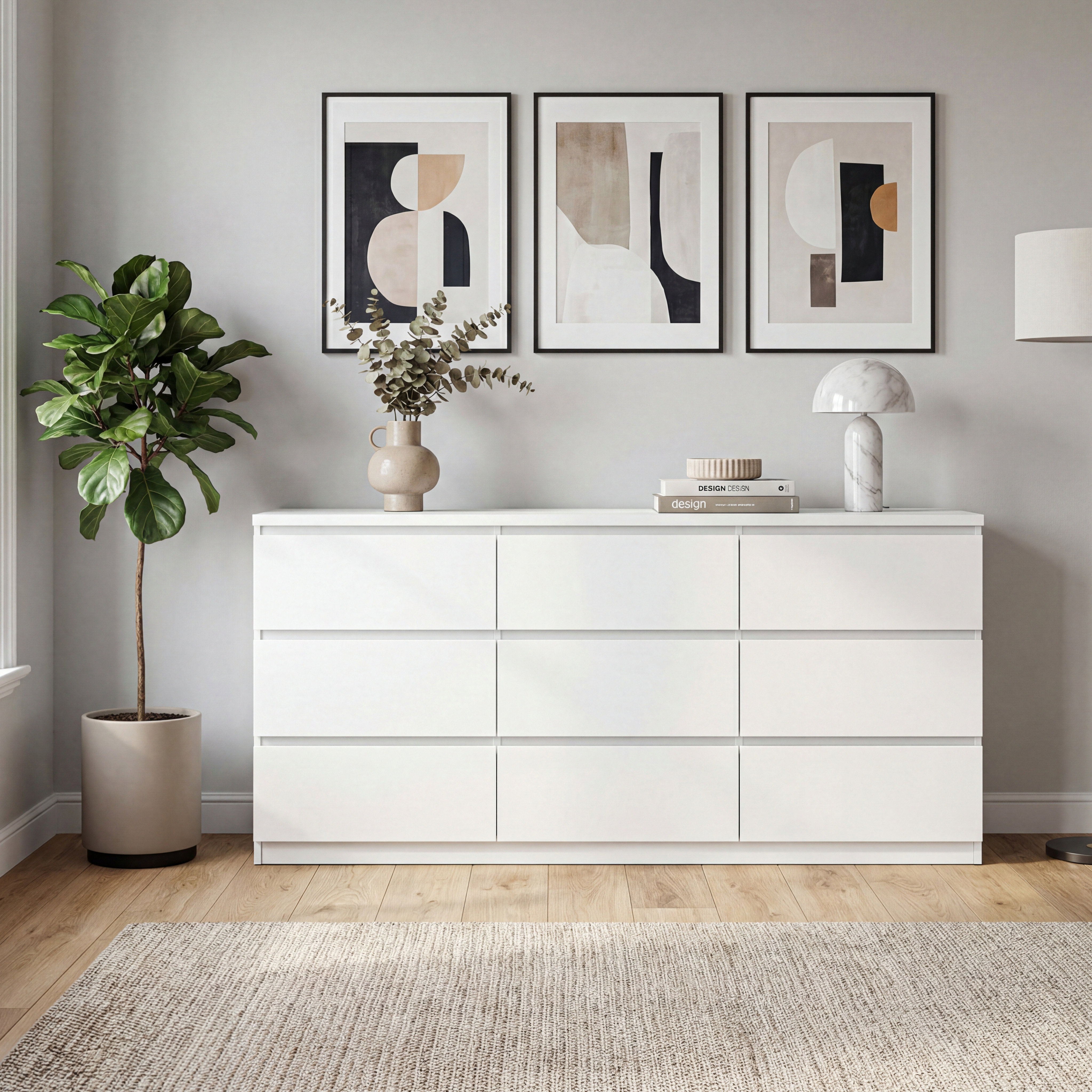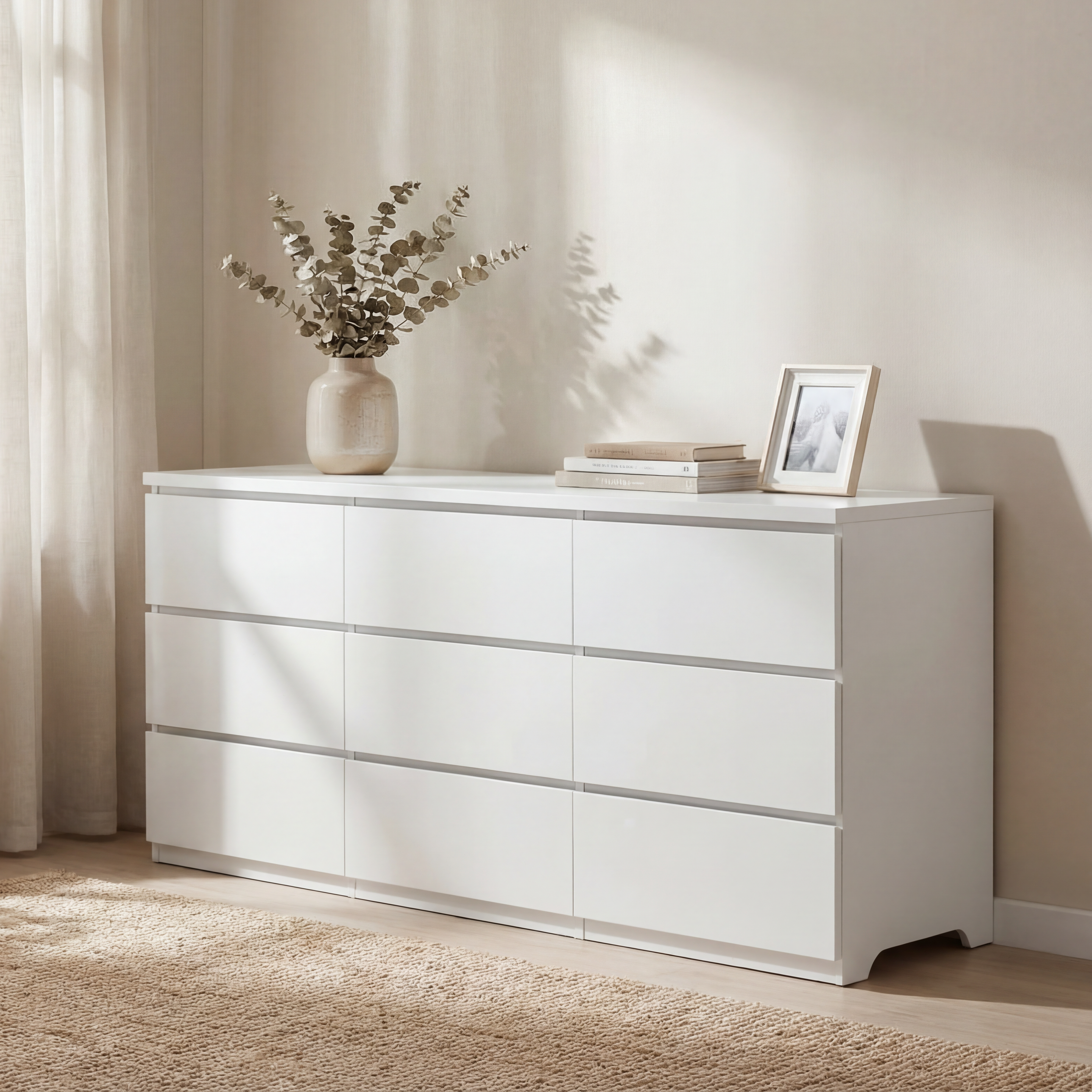 Product Name:9 Drawer Dresser with No Handle Design, Modern White Matte Wood Dresser for Bedroom, Storage Chest of Drawers for Living Room, Hallway, Entryway