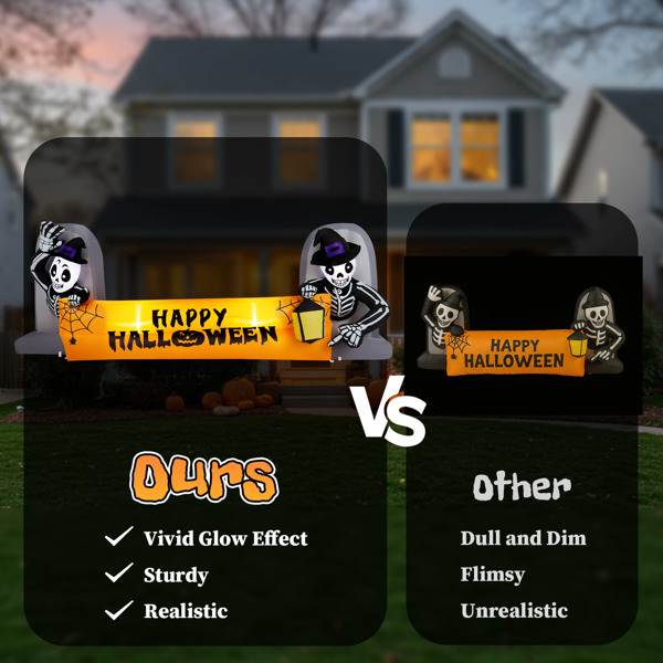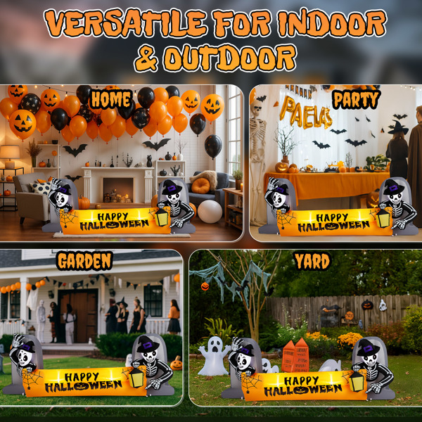 1. Striking Banner Design: Features two skeletons popped out from tombstones holding a banner that says HAPPY HALLOWEEN—perfect for creating a spooky focal point in your yard or party area.