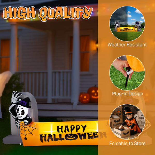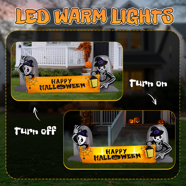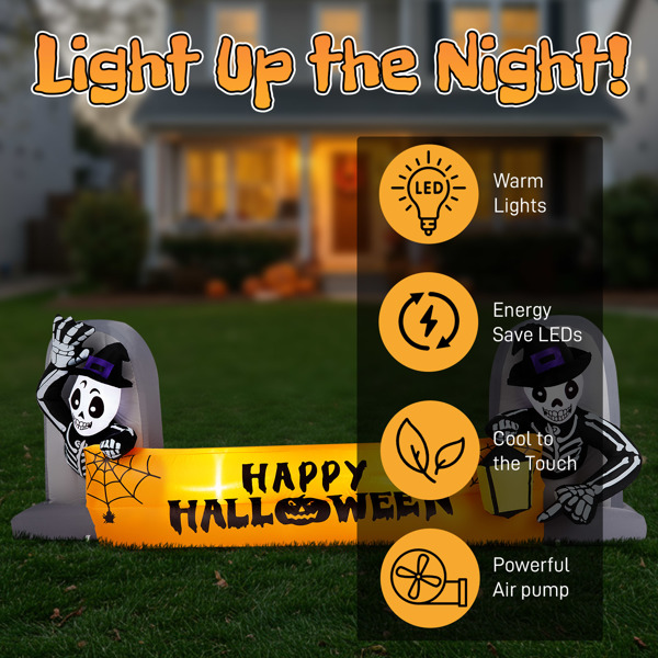 Make a bold statement this Halloween with the 9.6FT inflatable skeleton holding a tombstone banner—an eye-catching centerpiece designed to thrill trick-or-treaters and party guests alike. With built-in white LED lights that illuminate the entire decoration, this large inflatable creates a spooky yet festive atmosphere for your lawn, garden, or patio. Constructed from durable, weather-resistant polyester, it's built to endure outdoor conditions throughout the season. Setup takes just minutes with the built-in fan, and storage is simple with its collapsible design, making it a fun and reusable Halloween essential.