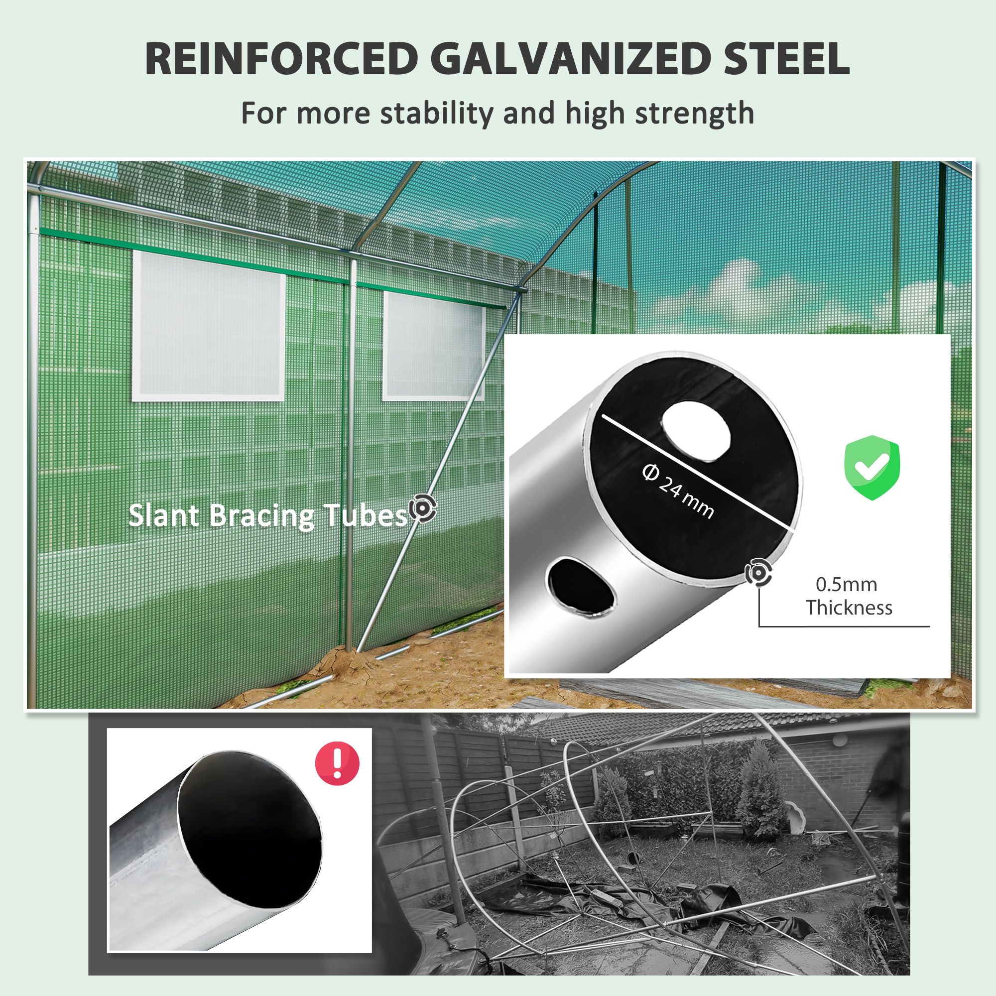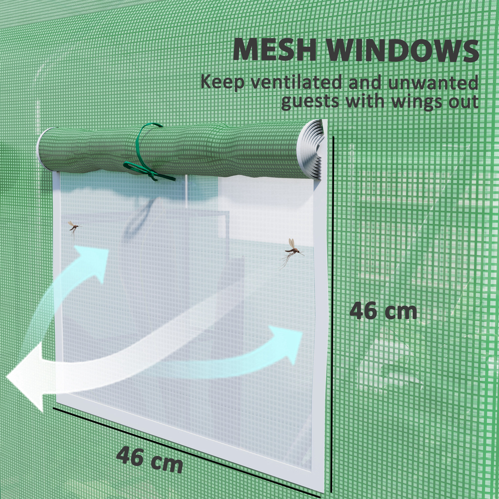 Year-round gardening with plenty of space and protection, with this polytunnel greenhouse. Three roll-up doors and multiple mesh windows allow easy access and plenty of fresh air. Fitted with a 140gsm plastic cover for a protective shell - shields inside fromlight weather and allows sunlight to pass through for beautiful growth. Complete with four ground stakes and four guy ropes in the package to pin greenhouse to the ground.
