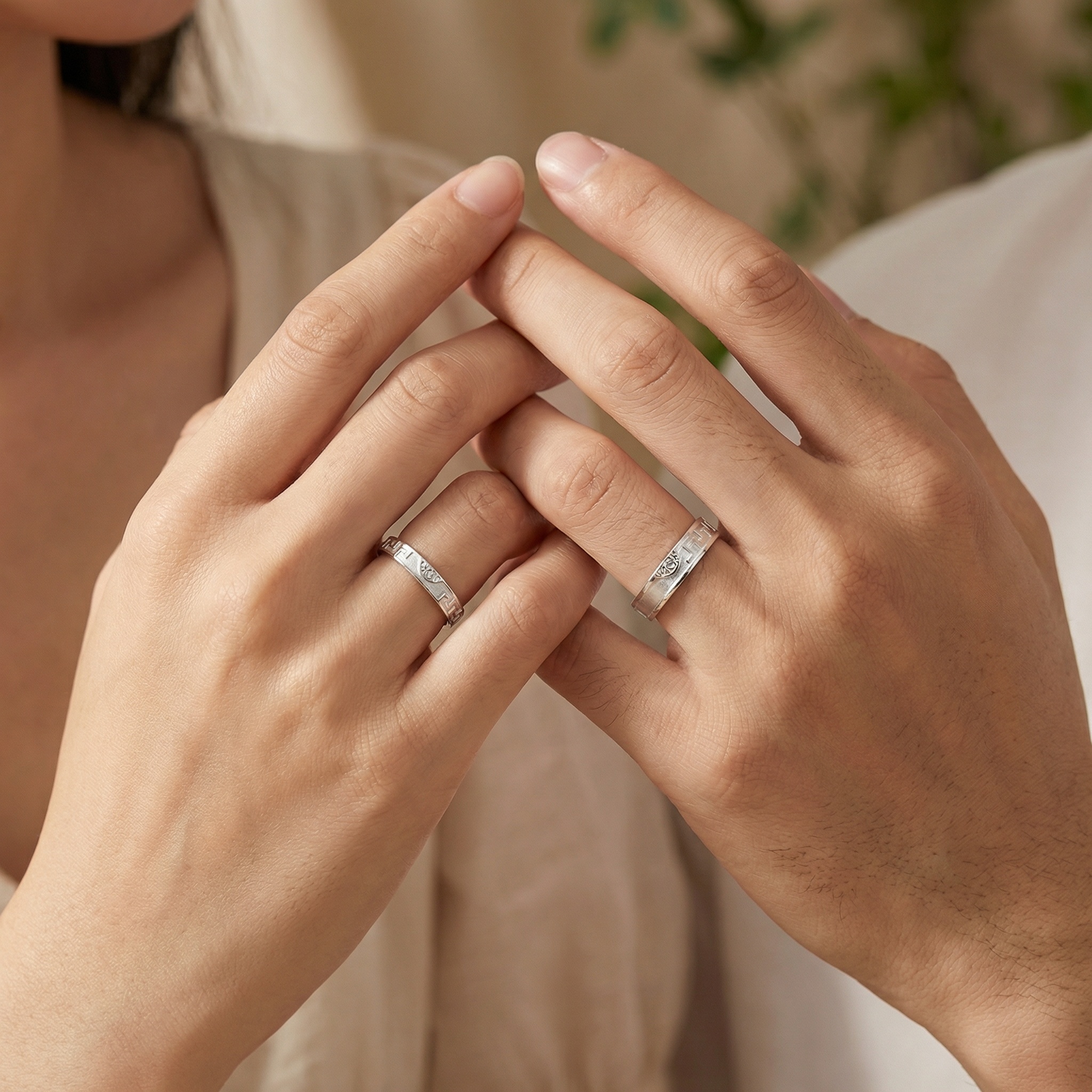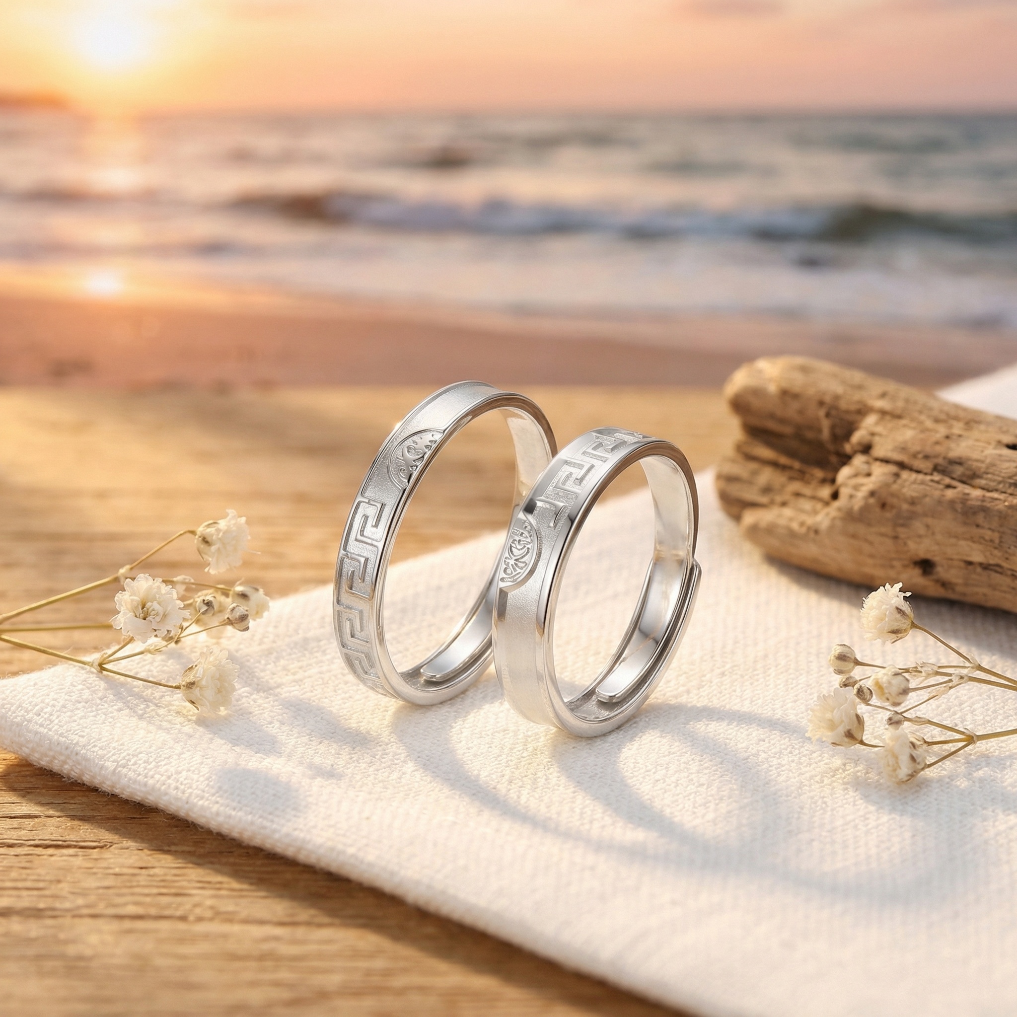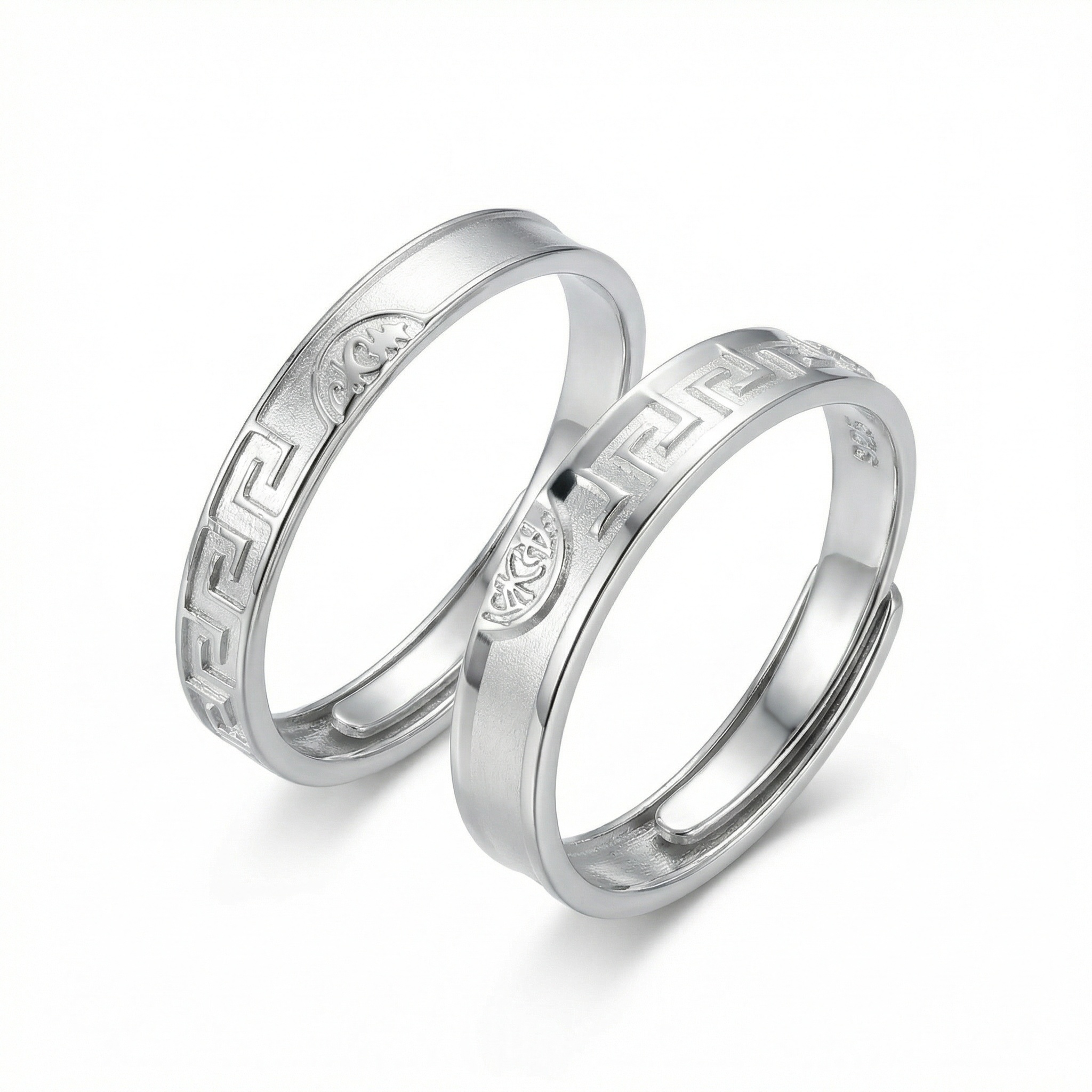 This elegant pair of couple rings is crafted from high-quality sterling silver, featuring a unique blend of classic and modern design elements. Each ring showcases an intricate Greek key pattern, symbolizing eternity and the infinite flow of love, alongside a delicate sun-inspired crest. The bands offer a sophisticated contrast between polished edges and a subtle matte finish. Designed with practicality in mind, the open-back adjustable bands ensure a comfortable and secure fit for any finger size. These matching rings serve as a beautiful symbol of connection and commitment, making them an ideal gift for anniversaries, engagements, or special occasions. Their timeless aesthetic complements both casual and formal attire, adding a touch of refined elegance to any ensemble. | Brand: jewelryodm