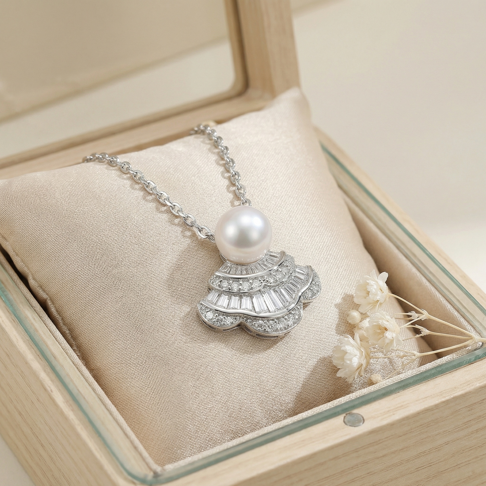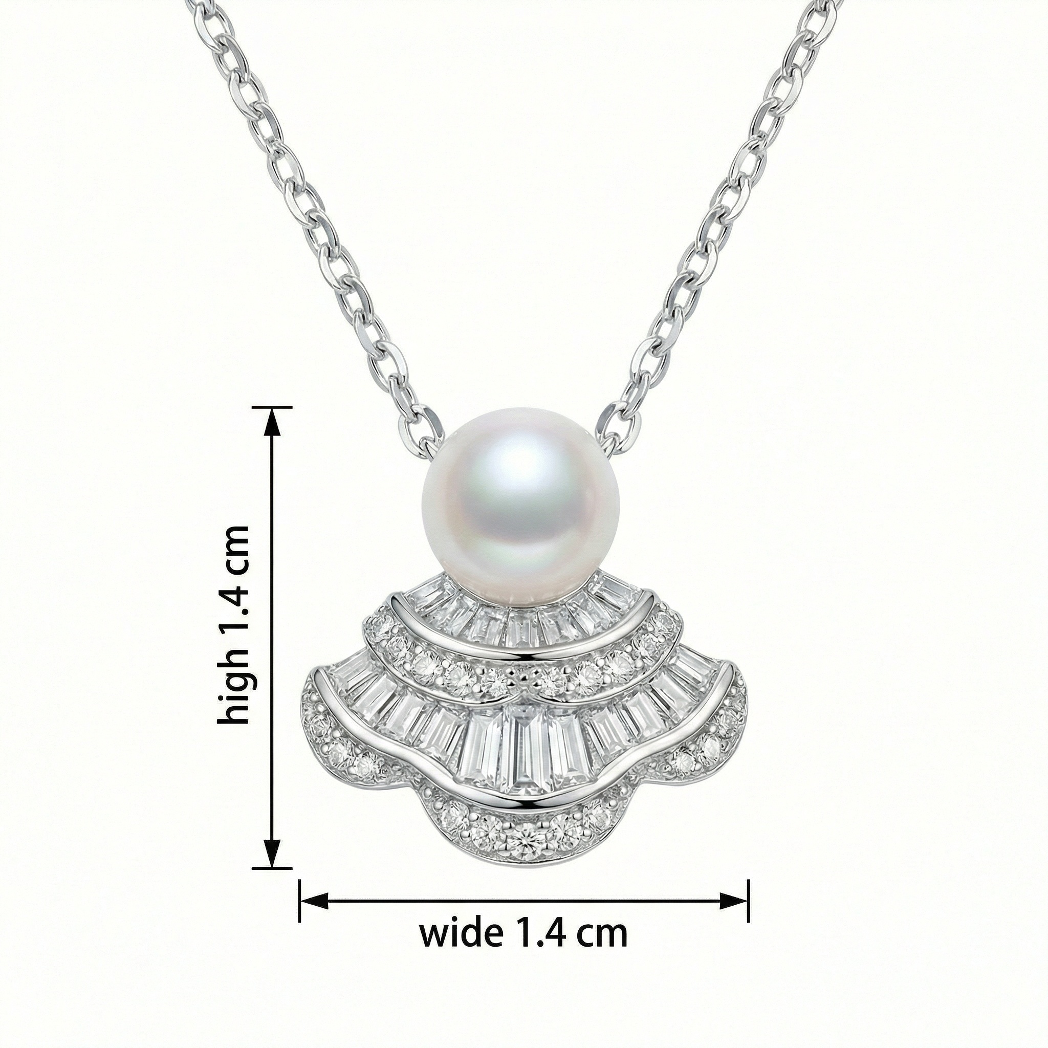 This elegant necklace features a radiant white pearl set atop a sophisticated fan-shaped pendant. Crafted in polished white metal, the pendant showcases an intricate Art Deco-inspired design, meticulously embellished with a combination of sparkling baguette-cut and brilliant round-cut diamonds. The tiered arrangement of stones creates a stunning visual depth, while the central pearl adds a touch of classic luster and grace. Suspended from a delicate silver chain, this piece perfectly balances vintage charm with contemporary luxury. Ideal for formal events or as a standout bridal accessory, this necklace is a testament to timeless beauty and refined craftsmanship, making it a precious addition to any fine jewelry collection. | Brand: jewelryodm