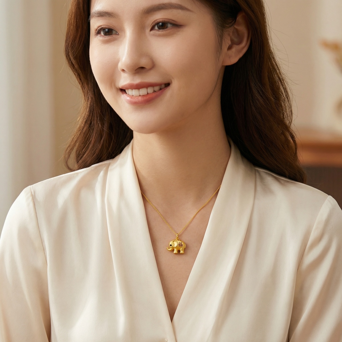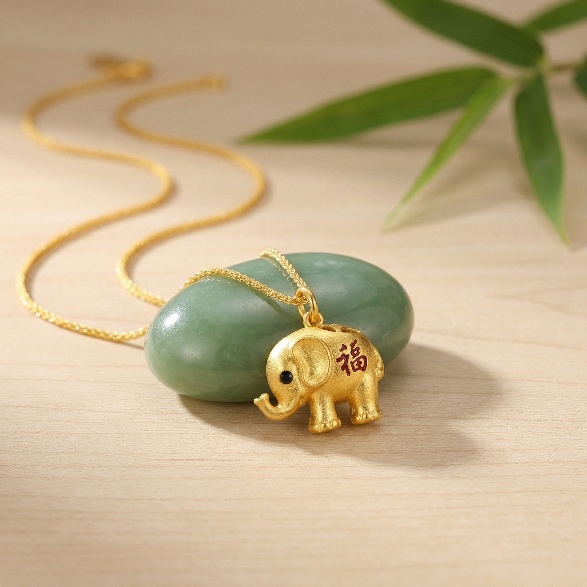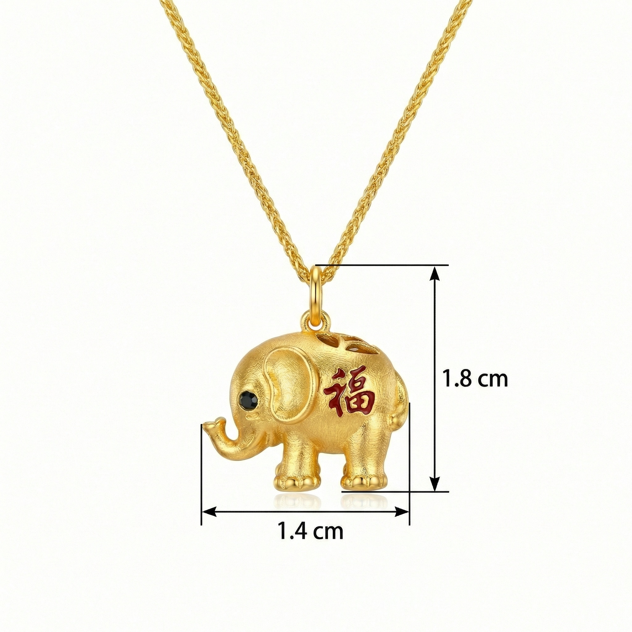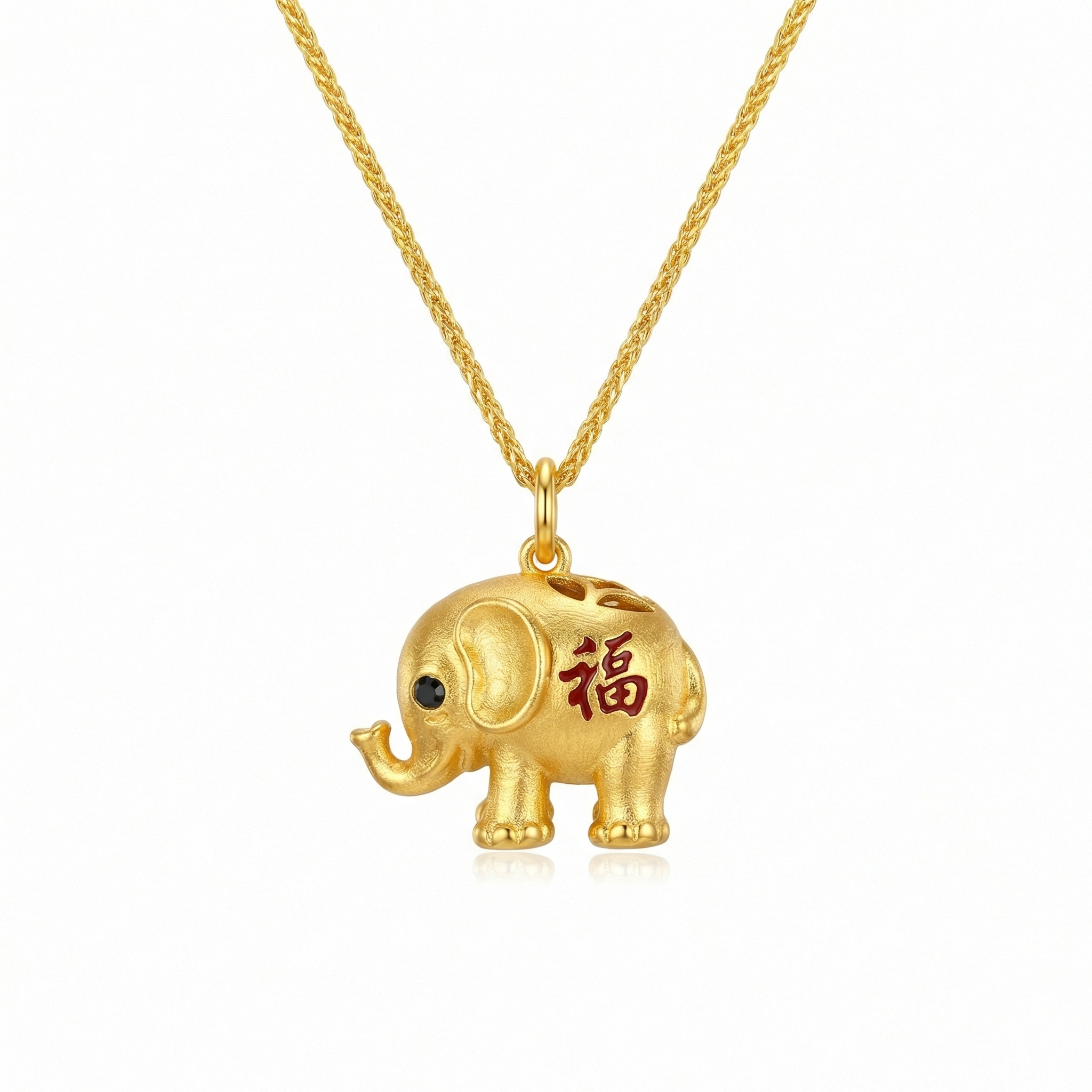This exquisite jewelry piece features a beautifully crafted elephant pendant hanging from a delicate wheat chain. The elephant is designed with a rich, textured finish and charming details, including a glistening black eye and an upturned trunk, a classic symbol of luck and prosperity. Adorning its side is the traditional Chinese character for "Fu," rendered in vibrant red, representing good fortune, blessings, and happiness. The piece combines cultural heritage with modern elegance, making it a perfect gift for someone special or a meaningful addition to your own collection. Its radiant metallic sheen highlights the intricate craftsmanship, from the elephant's ears to its sturdy legs. Wear this necklace as a daily reminder of strength, wisdom, and the many blessings life has to offer. | Brand: jewelryodm