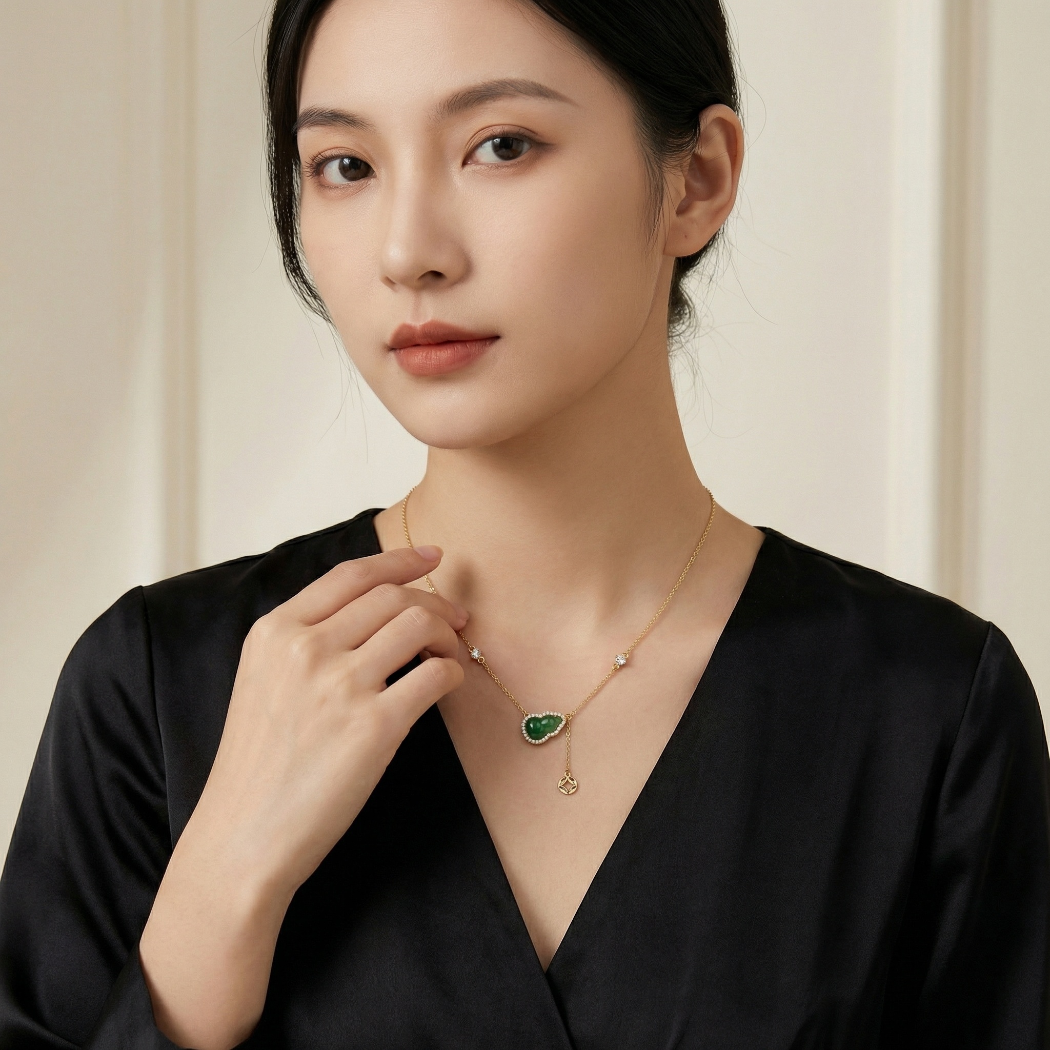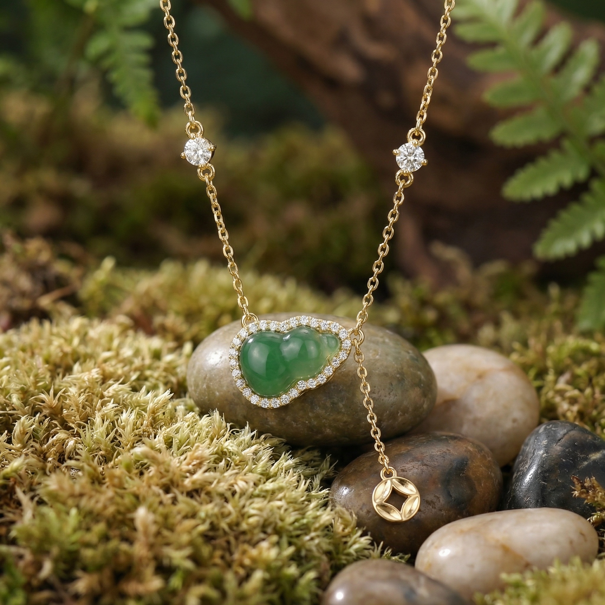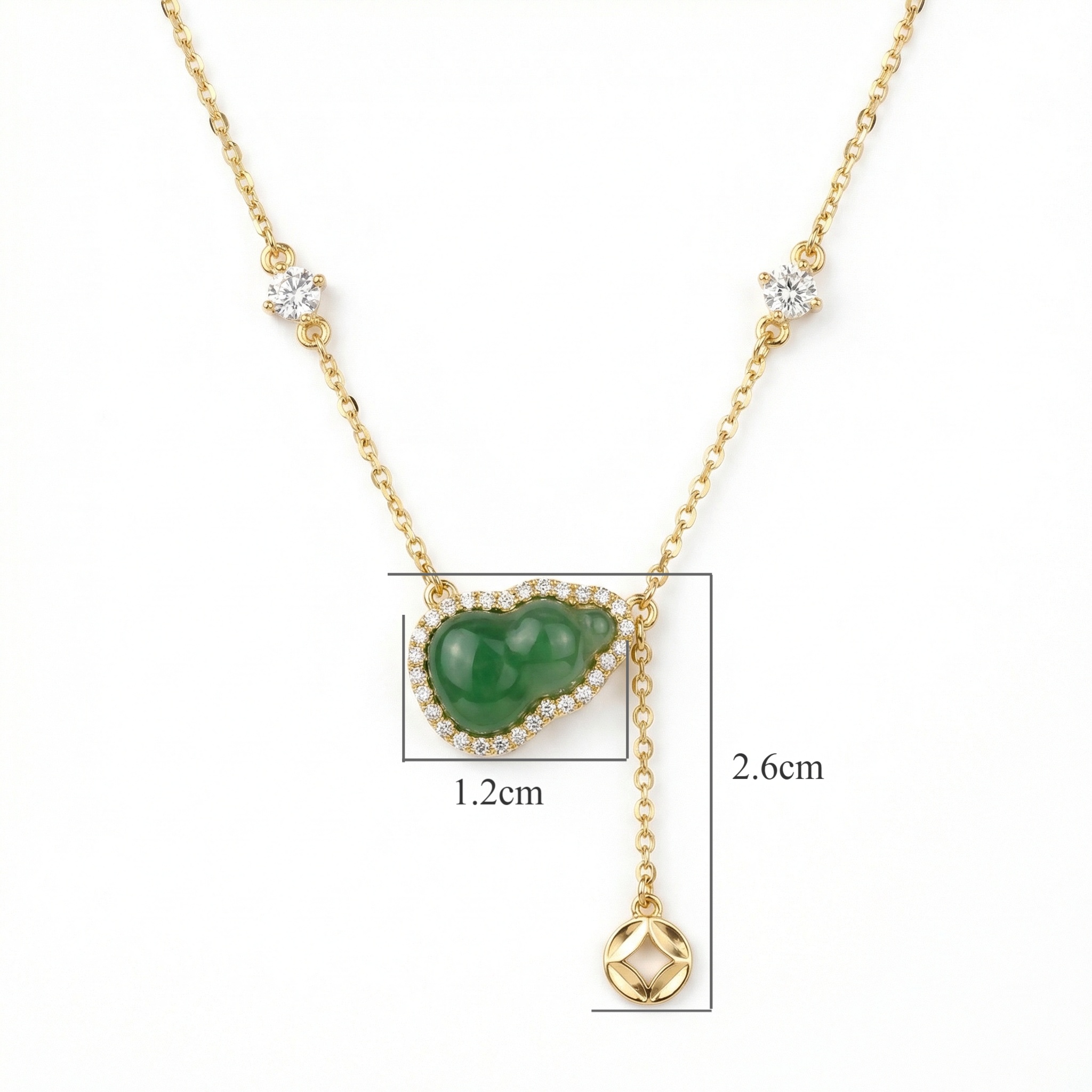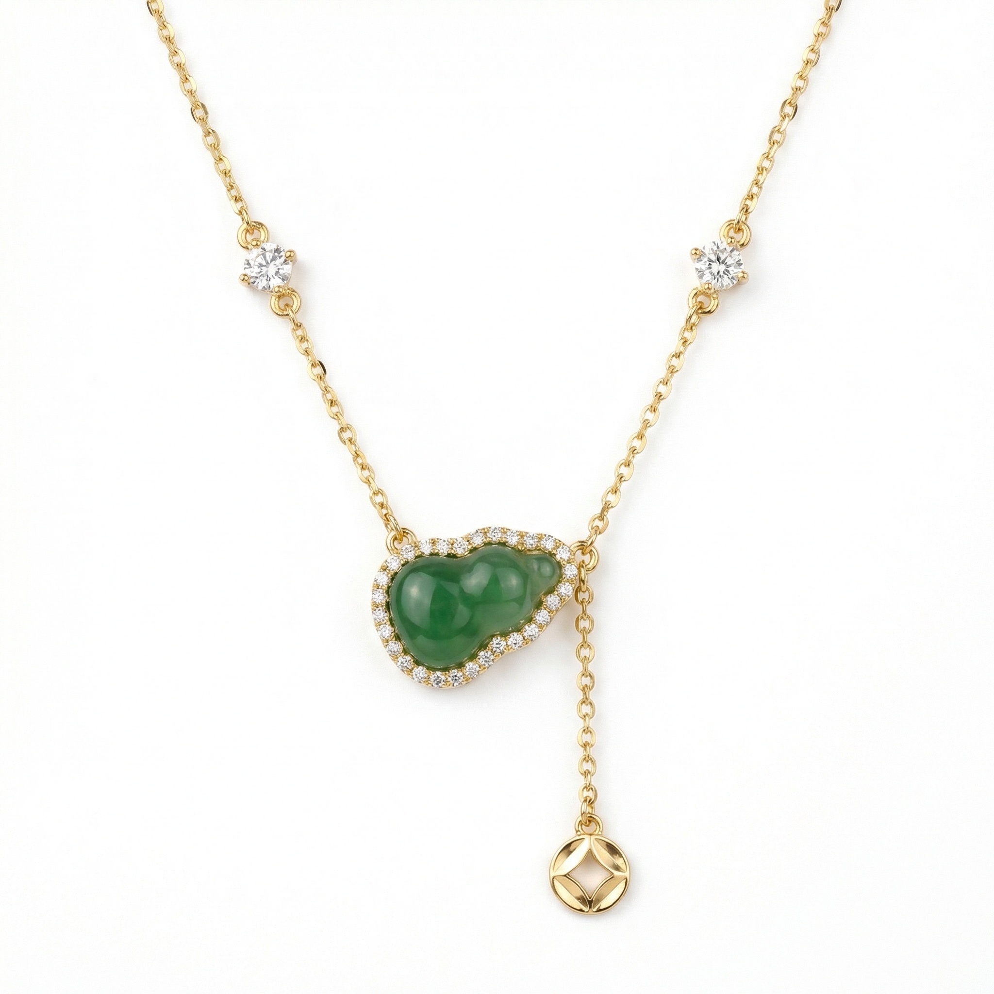 This exquisite necklace features a vibrant green jadeite pendant in a traditional hulu shape, symbolizing health and prosperity. The jade is beautifully framed by a halo of brilliant-cut diamonds, adding a layer of sophisticated sparkle. The delicate chain is enhanced with two additional bezel-set diamonds, while a dangling charm with a cultural prosperity motif provides a touch of elegant movement. Designed for the modern woman who appreciates tradition, this piece combines timeless symbolism with luxurious craftsmanship. The striking contrast between the deep green stone and the radiant diamond accents creates a refined aesthetic. Whether worn for a special occasion or as a meaningful daily accessory, this necklace offers a unique blend of serenity, grace, and cultural heritage. | Brand: jewelryodm
