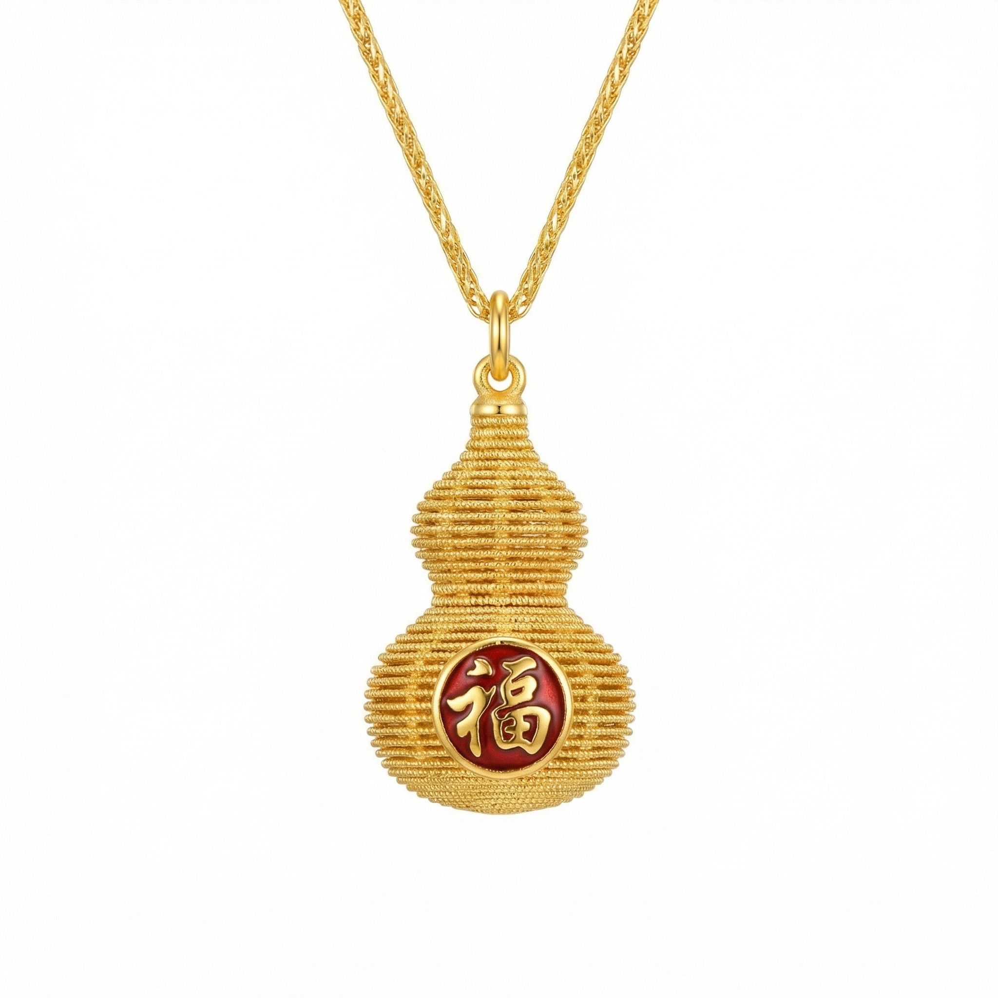 This exquisite piece features a meticulously crafted Hu Lu gourd pendant, a traditional symbol of longevity, protection, and harmony. The pendant showcases a unique textured design, created through intricate metallic coils that catch the light beautifully. At its heart lies a vibrant crimson enamel circle, prominently displaying a shining Chinese character "Fu," which translates to blessings and good fortune. Suspended from a delicate, matching woven chain, this necklace combines cultural heritage with sophisticated artistry. The warm metallic tones perfectly complement the bold red accent, making it a meaningful accessory for daily wear or special celebrations. Whether given as a gift to wish someone well or worn as a personal talisman, this pendant serves as a timeless emblem of prosperity and peace. | Brand: jewelryodm