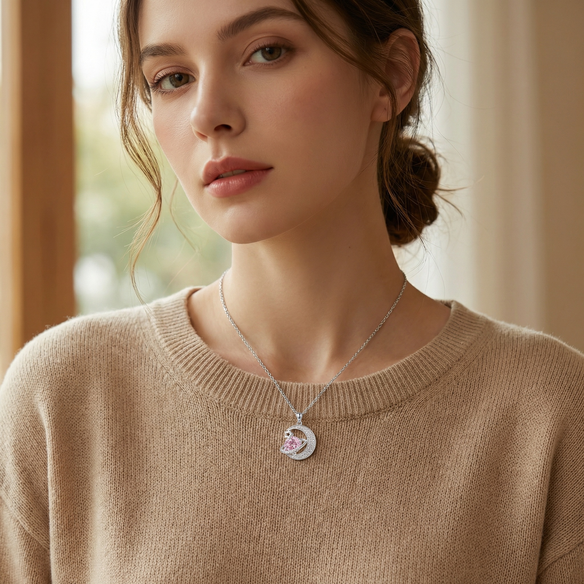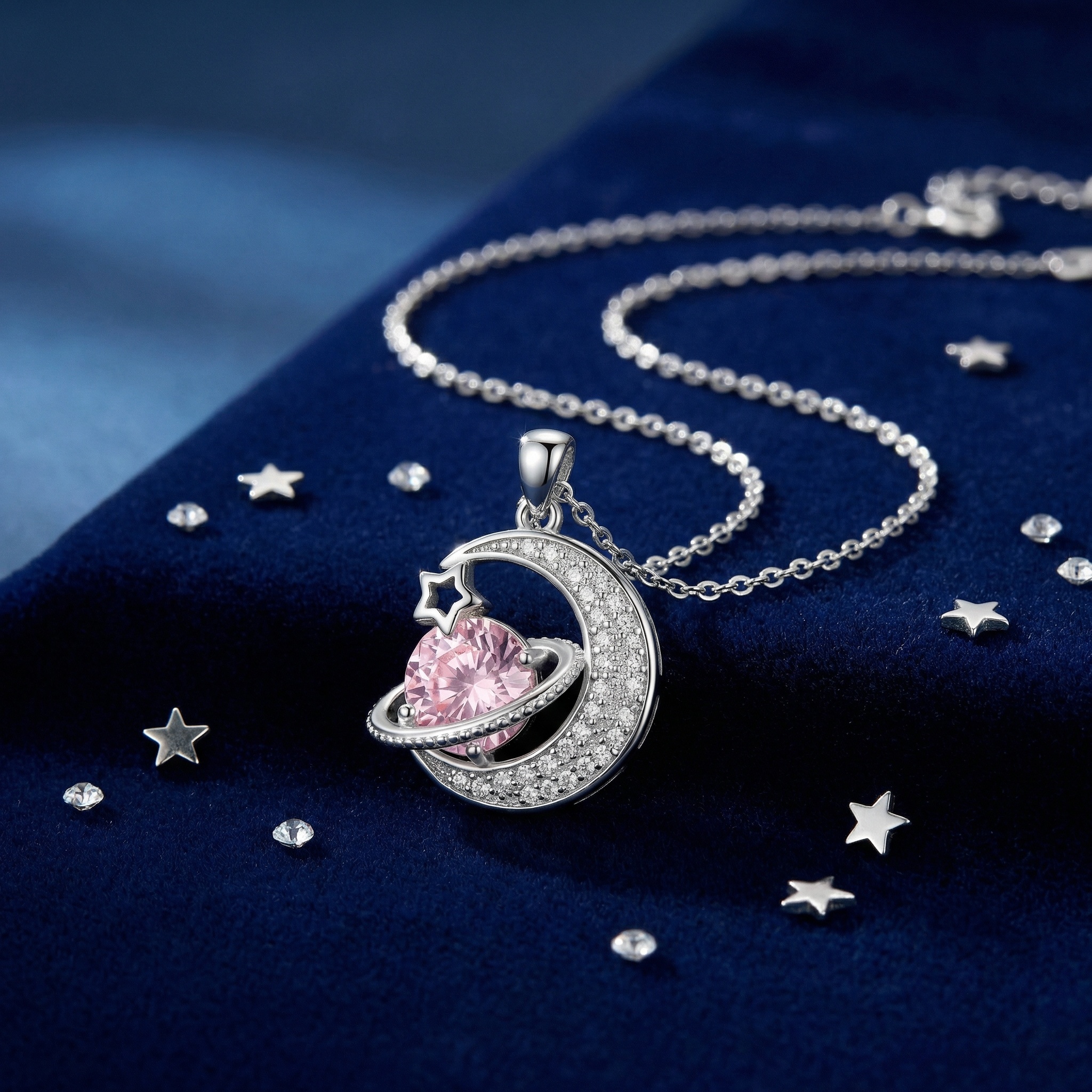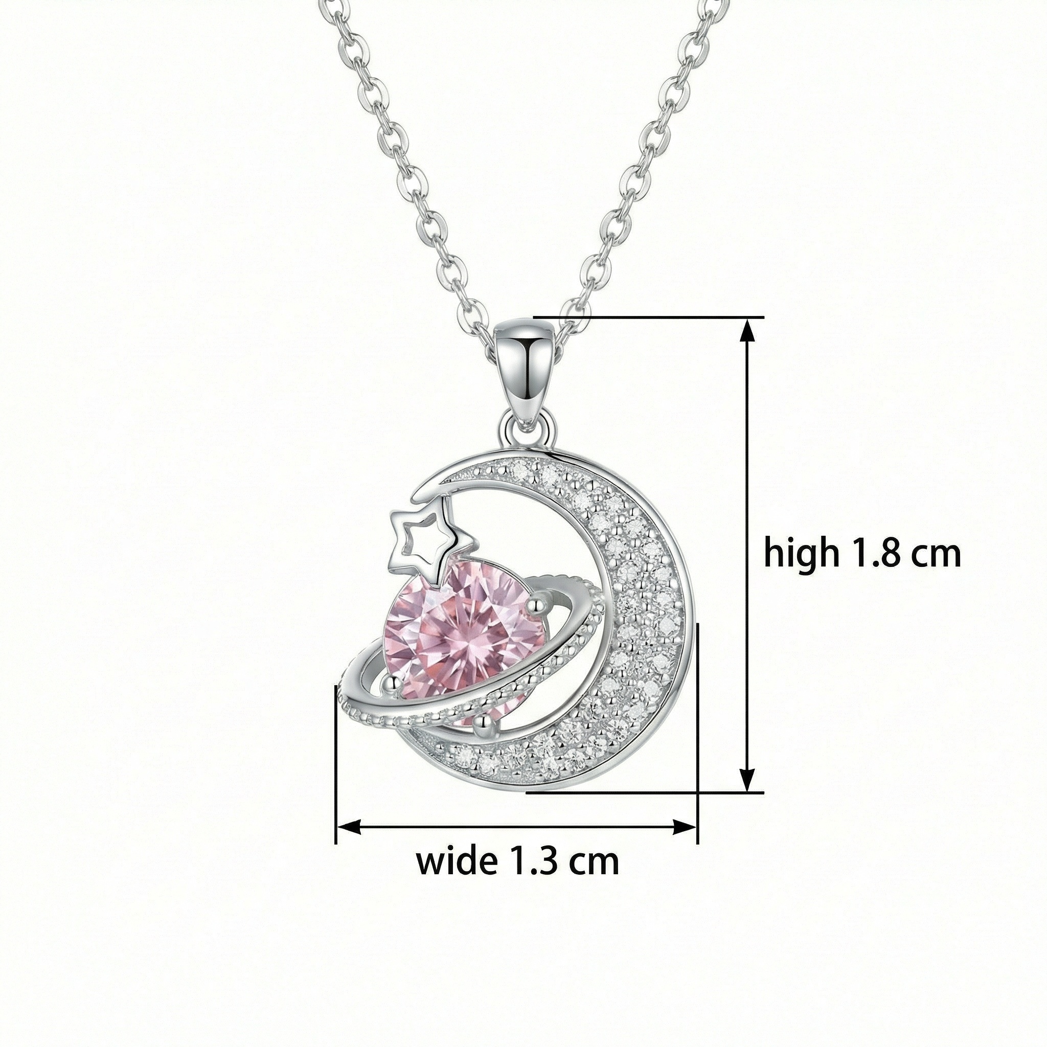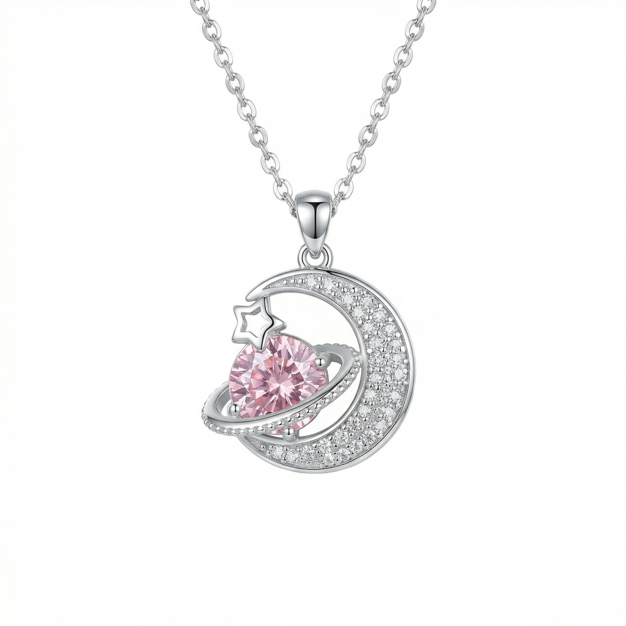 This exquisite necklace features a celestial-inspired pendant crafted in gleaming silver-toned metal. At its heart lies a stunning round pink gemstone, styled as a planet with a sparkling orbital ring. A delicate crescent moon, encrusted with shimmering pavé stones, cradles the planet, while a polished star outline adds an extra touch of cosmic charm. The intricate detailing and brilliant contrast between the soft pink gem and the bright silver finish make it a perfect accessory for both daily wear and special occasions. Suspended from a classic cable chain, this piece captures the magic of the night sky, making it a romantic and elegant gift for a loved one or a charming addition to your own jewelry collection. | Brand: jewelryodm
