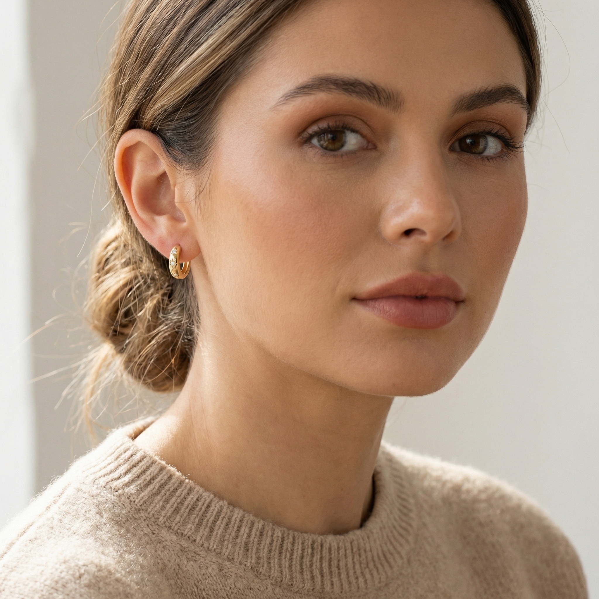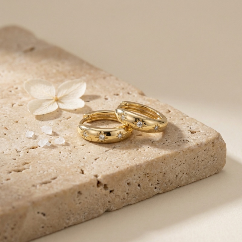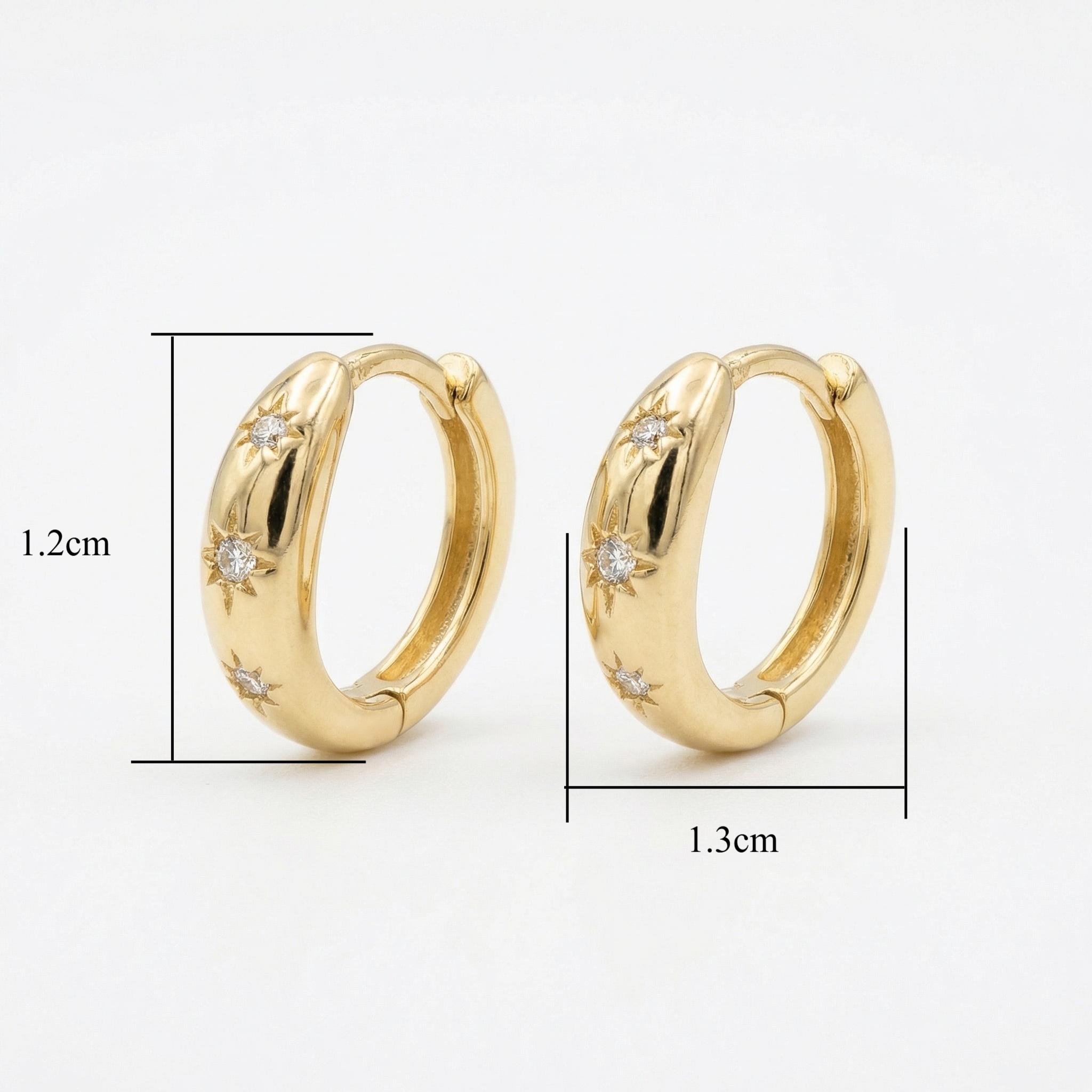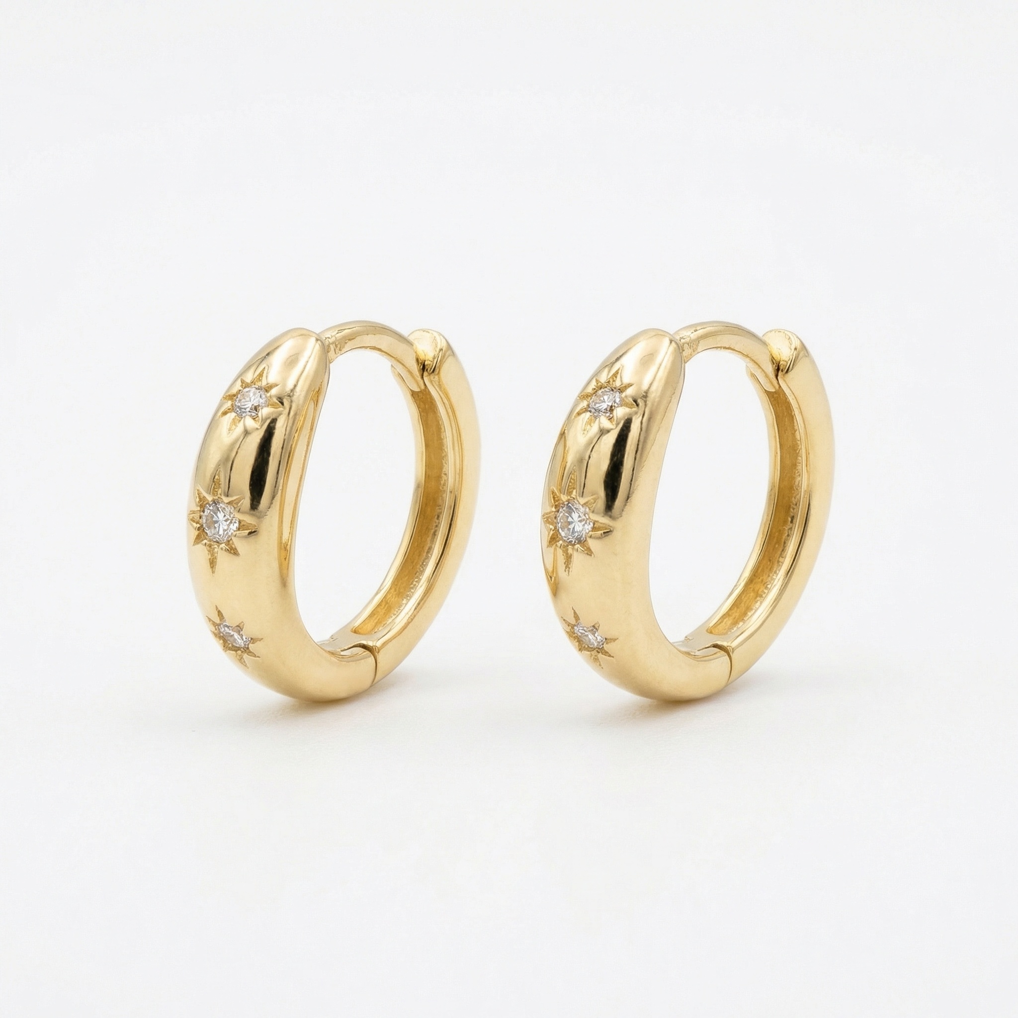 These elegant huggie hoop earrings feature a polished metallic finish and a sophisticated celestial theme. Each earring is adorned with three delicately engraved starburst motifs, each centered with a brilliant clear stone that catches the light beautifully. The thick, rounded design provides a modern yet timeless silhouette, making them perfect for both daily wear and special occasions. Crafted with a secure hinged closure for comfort and ease of use, these small hoops sit snugly against the earlobe. The radiant warm tone enhances the brilliance of the inlaid gems, creating a refined look that complements any style. Whether worn alone or stacked with other pieces, these stellar-inspired accessories add a touch of cosmic magic to your jewelry collection. | Brand: jewelryodm