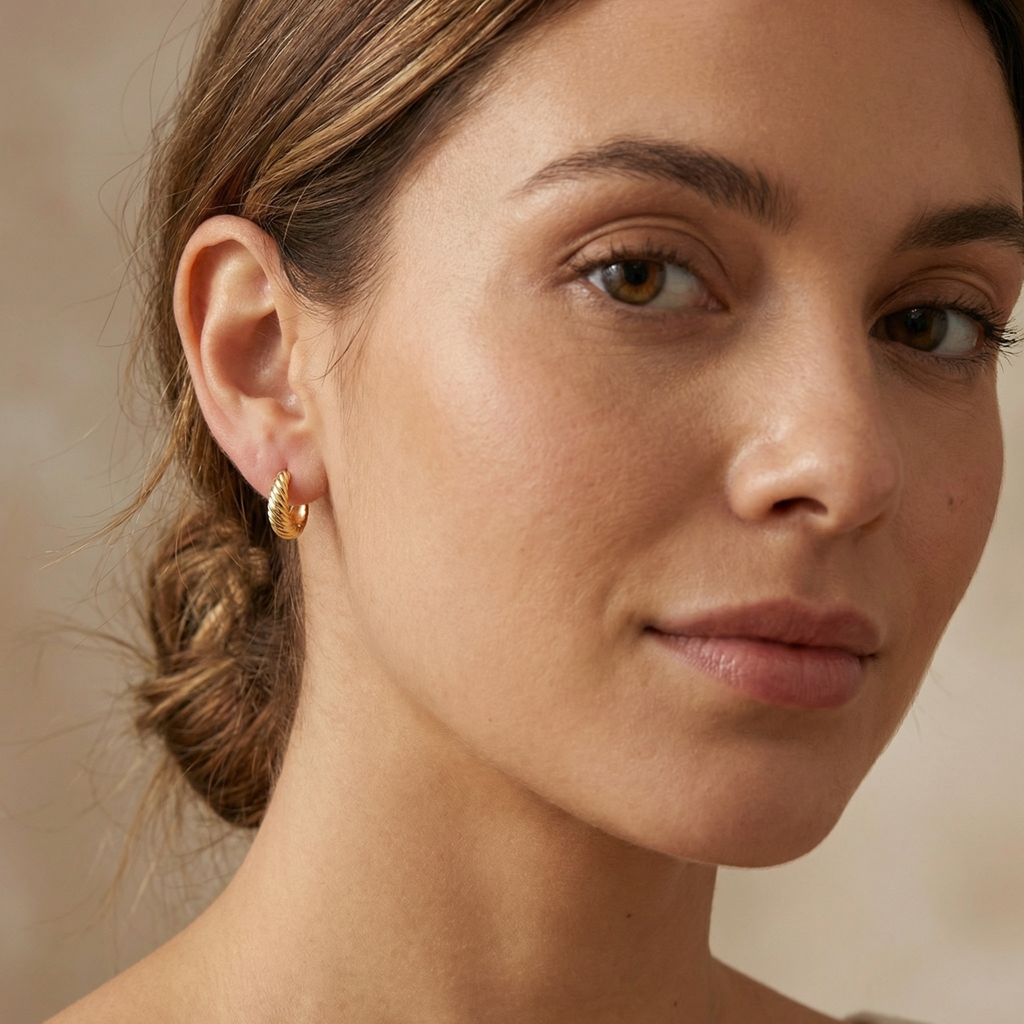 These elegant earrings feature a unique croissant-inspired twisted design that adds a touch of sophisticated texture to any ensemble. Crafted with a lustrous metallic finish, the chunky yet lightweight silhouette ensures all-day comfort without sacrificing style. The ribbed detailing catches the light beautifully, creating a dynamic visual appeal. Equipped with a secure hinged closure, these huggie-style hoops are easy to put on and take off, making them perfect for both casual everyday wear and special evening occasions. The timeless yellow hue complements a wide variety of skin tones and outfits, from crisp white shirts to elegant black dresses. Elevate your jewelry collection with these versatile statement pieces that combine classic vintage charm with a modern, bold aesthetic. They make an ideal gift for yourself or a loved one who appreciates high-quality, fashion-forward accessories. | Brand: jewelryodm
