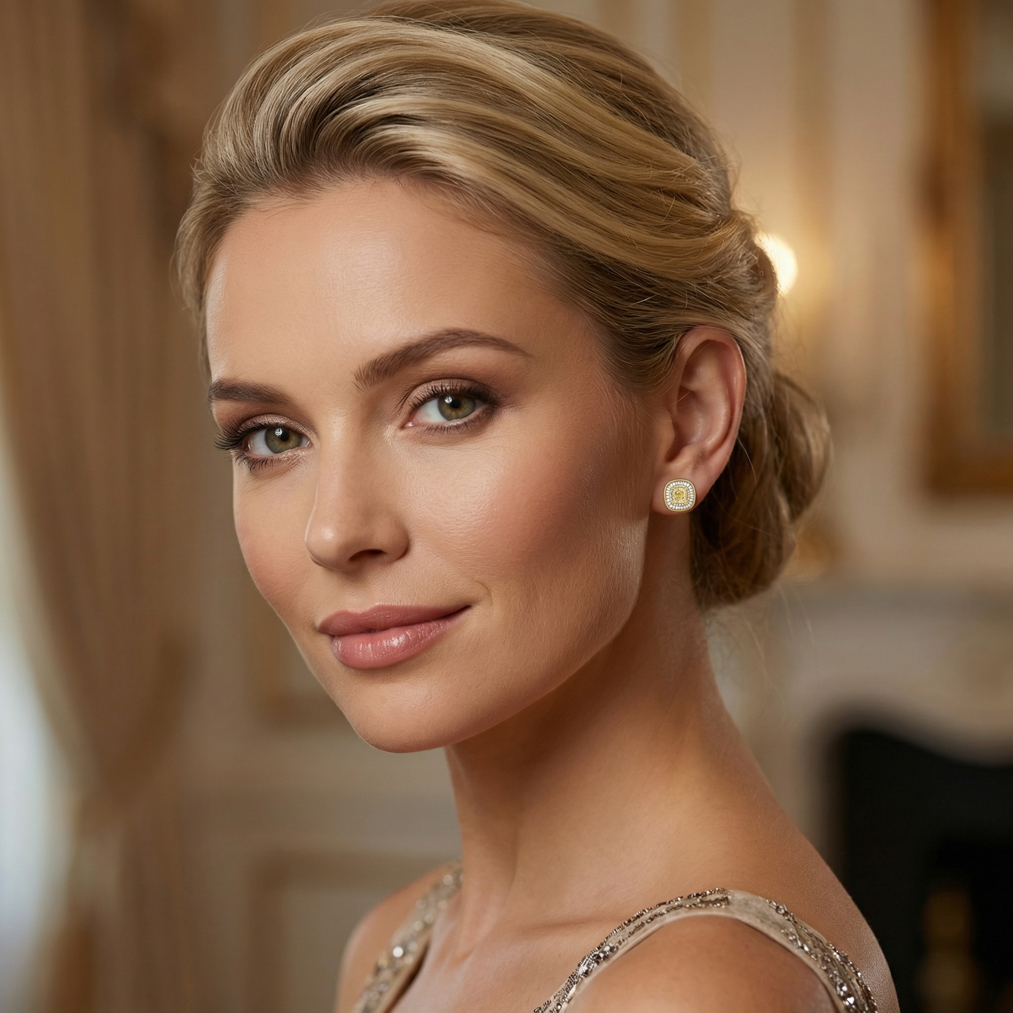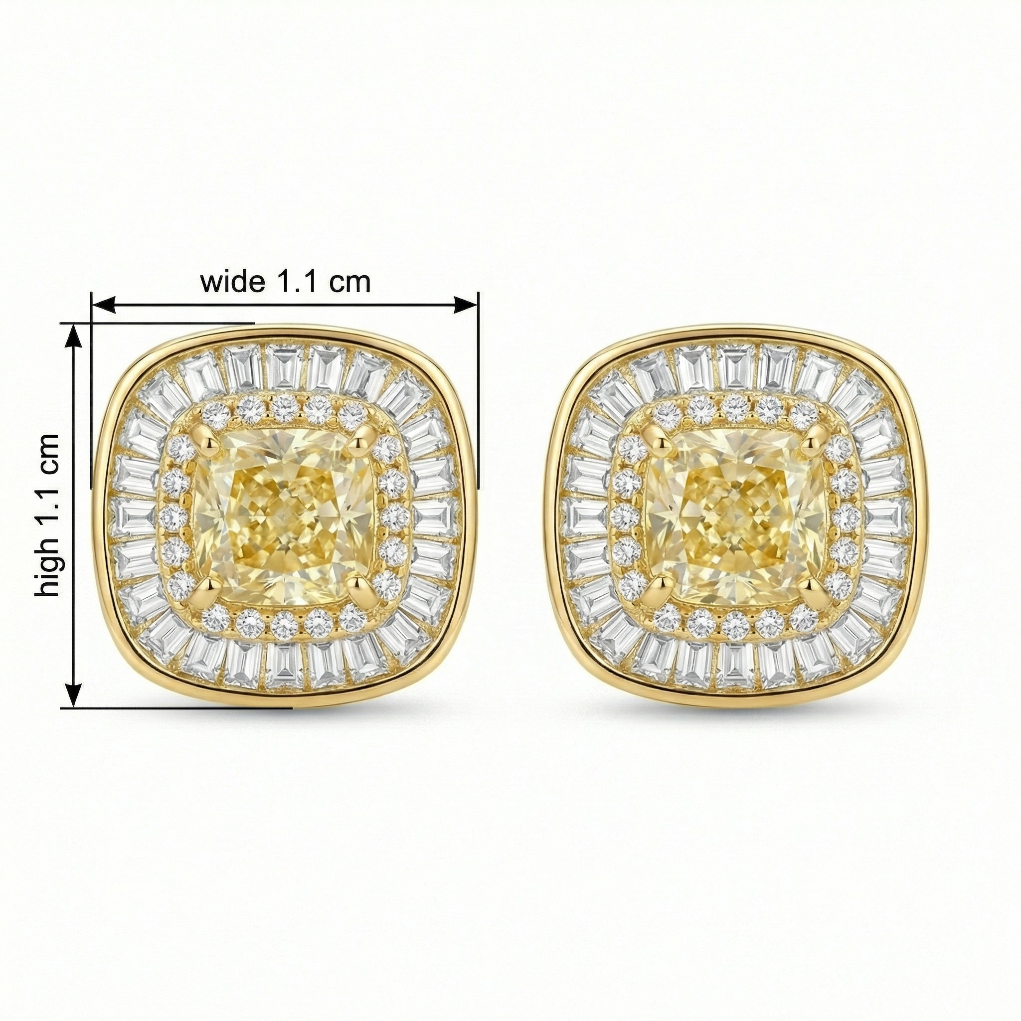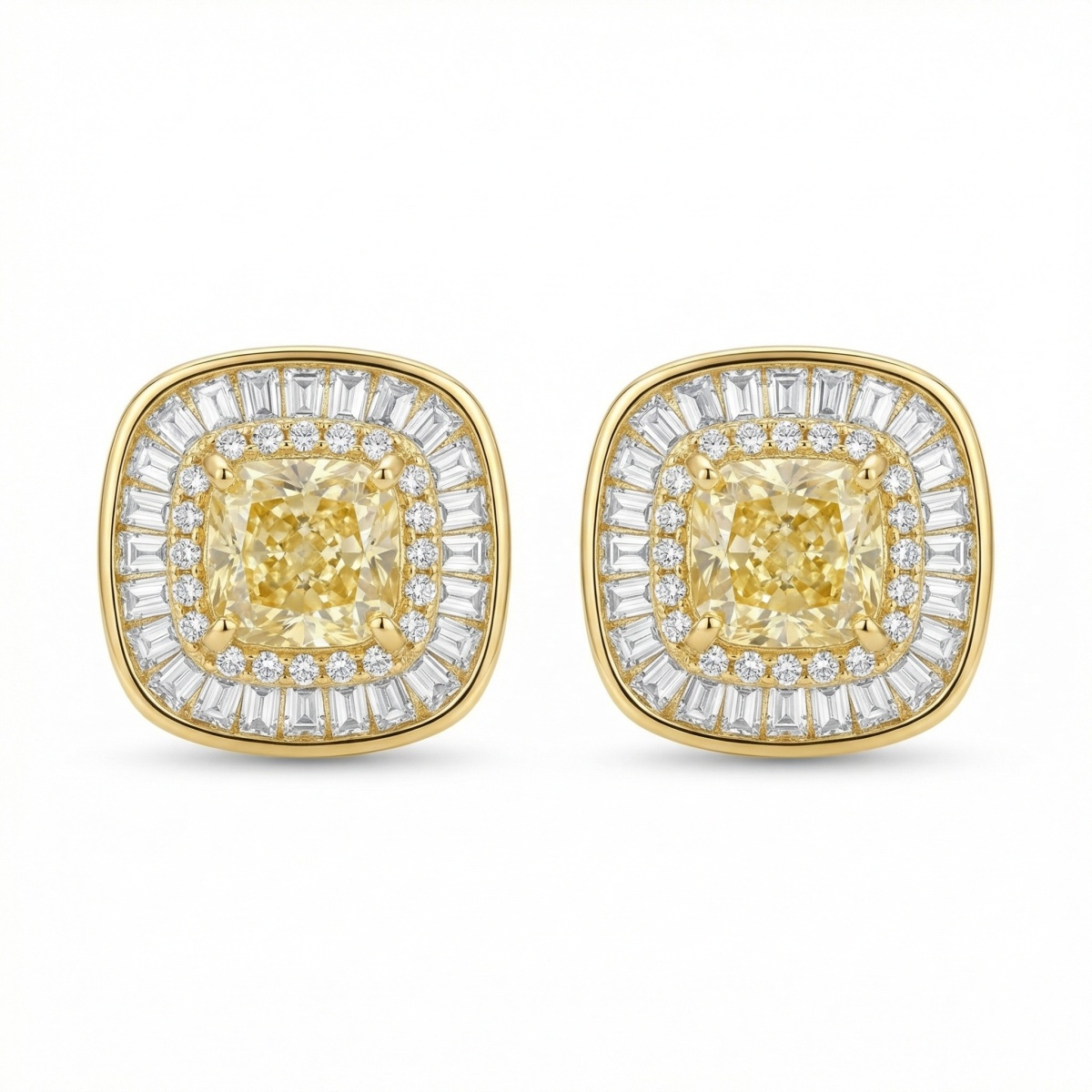 These exquisite stud earrings feature a breathtaking canary-colored cushion-cut center stone that radiates warmth and brilliance. Each center gem is encircled by a double halo design, adding layers of sophisticated sparkle. The inner halo is meticulously set with petite round brilliant-cut diamonds, while the outer halo showcases a striking array of tapered baguette diamonds for a modern architectural touch. Crafted in a rich yellow precious metal setting, these earrings offer a bold yet classic aesthetic. The combination of geometric shapes and vibrant tones creates a stunning play of light, making them a perfect statement piece for gala events or weddings. Their timeless design ensures they remain a treasured part of any jewelry collection, exuding elegance and luxury with every movement. | Brand: jewelryodm