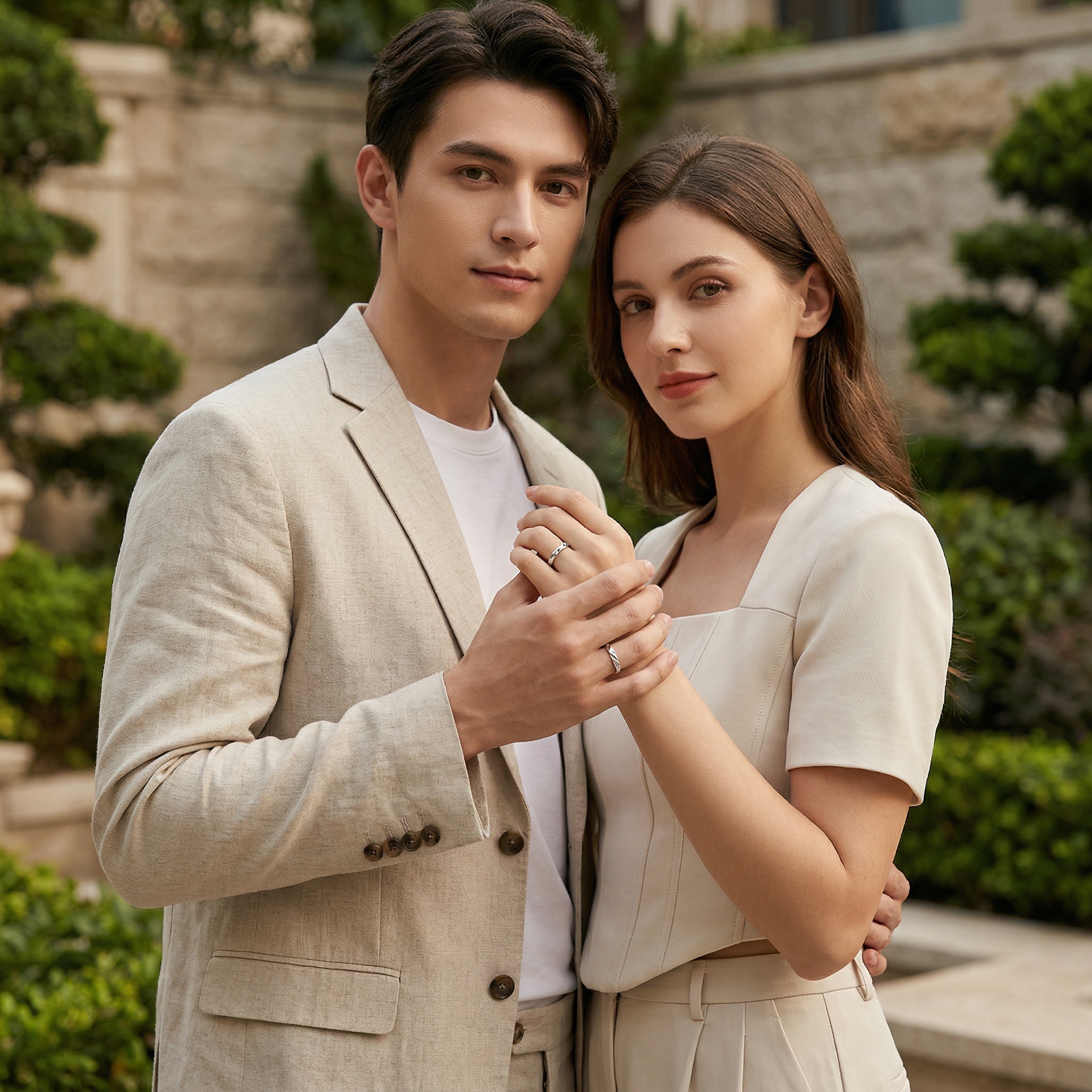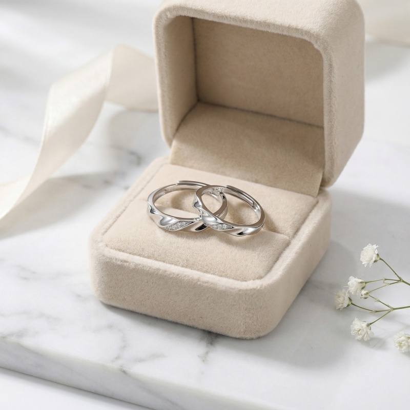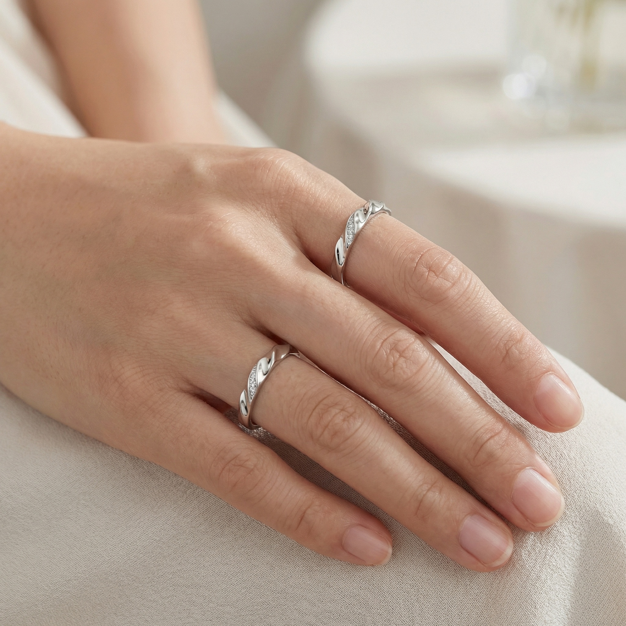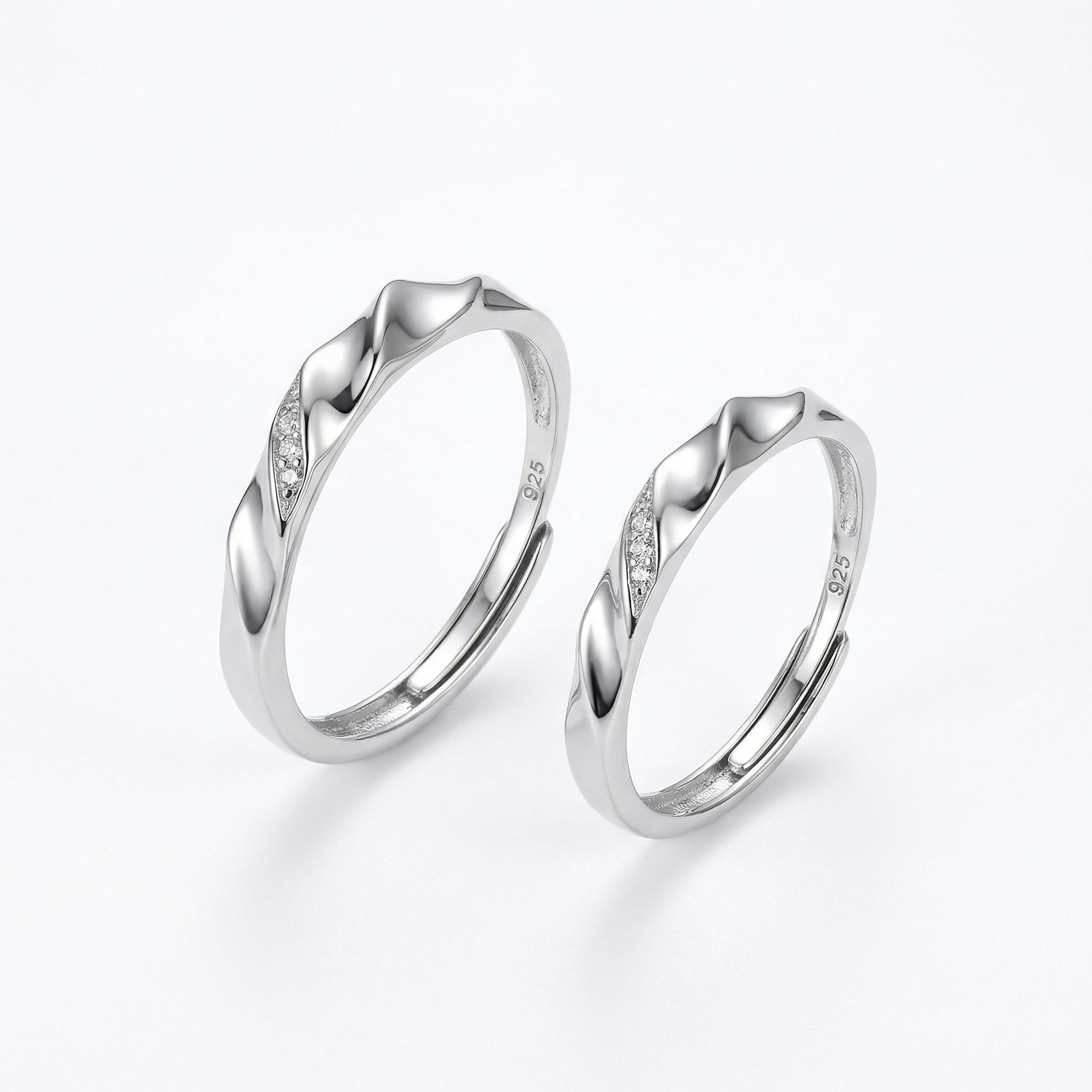 These exquisite rings are crafted from high-quality 925 sterling silver, featuring a unique, modern twisted design that symbolizes the intertwined journey of two people. Each ring is accented with a delicate row of shimmering stones, adding a touch of sophisticated brilliance to the polished finish. Designed with versatility in mind, the open-ended, adjustable bands ensure a comfortable and perfect fit for any finger size. This matching set is an ideal choice for promise rings, anniversary gifts, or as a meaningful symbol of commitment. Their minimalist yet stylish aesthetic makes them perfect for both daily wear and special occasions, beautifully capturing a blend of timeless elegance and contemporary craftsmanship. | Brand: jewelryodm
