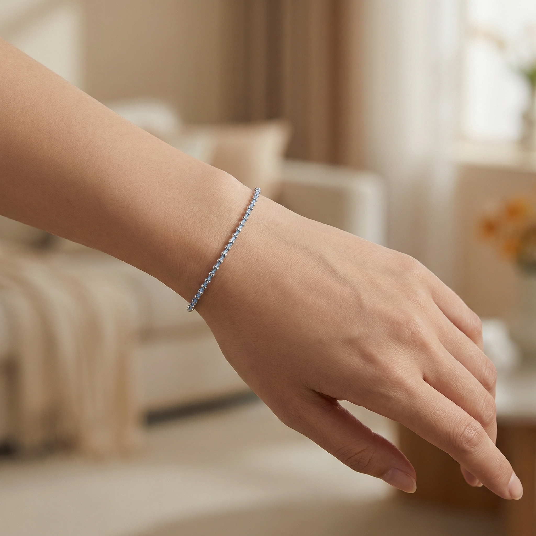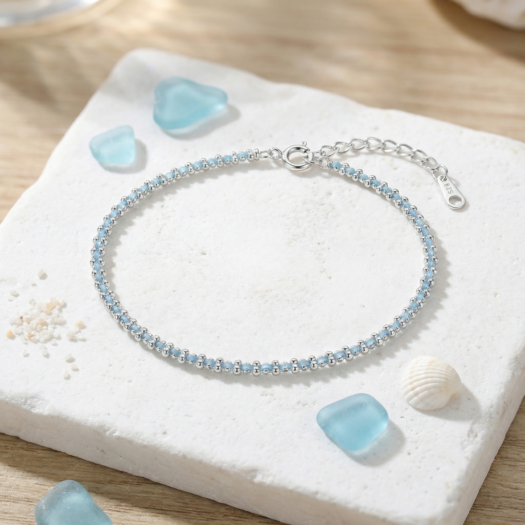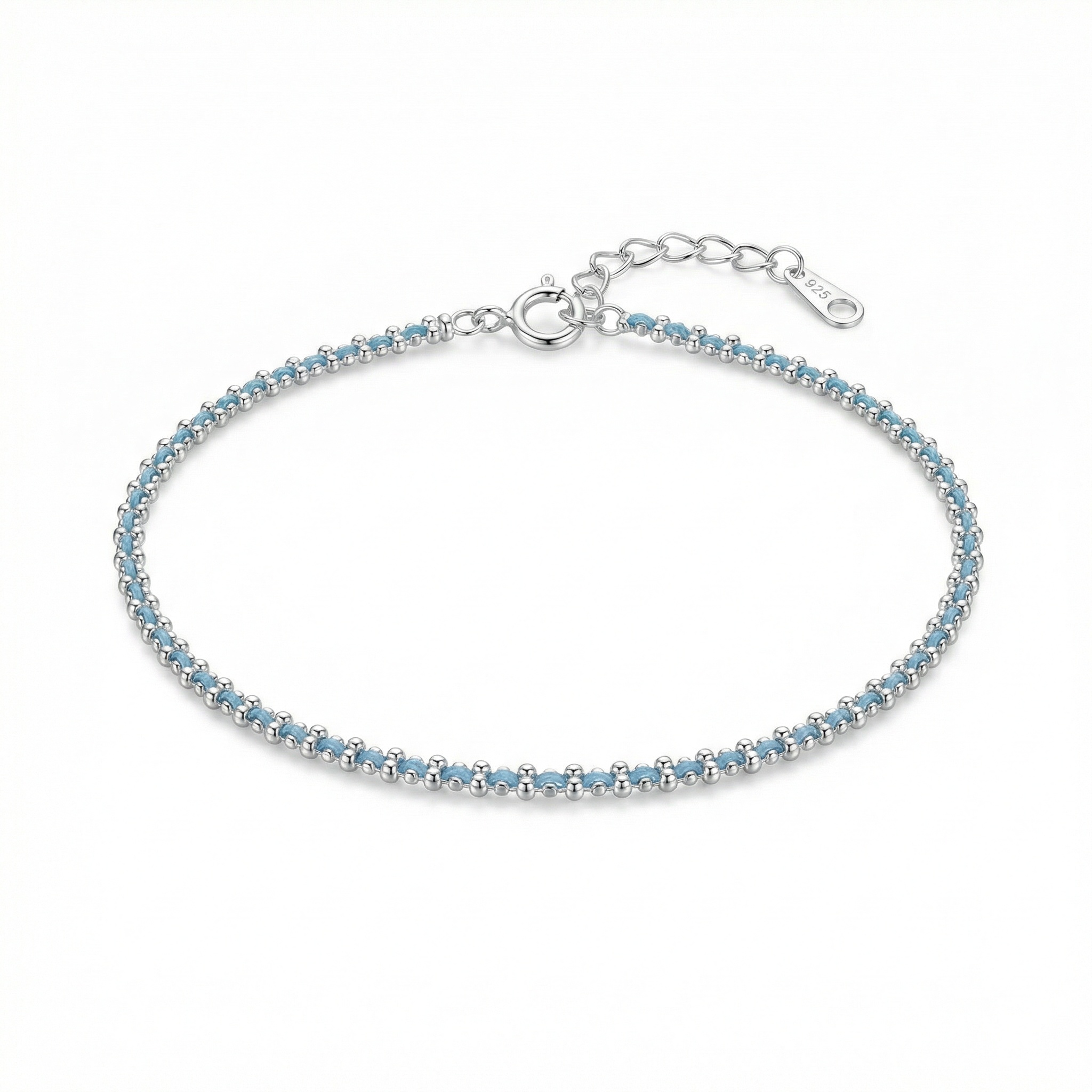 This exquisite bracelet features a delicate blend of shimmering 925 sterling silver beads and soft light blue hand-woven cord. The minimalist design showcases a rhythmic pattern of silver accents that catch the light beautifully against the subtle blue tones. It comes equipped with a secure spring ring clasp and an adjustable extender chain, ensuring a comfortable fit for any wrist size. A small teardrop-shaped tag stamped with "925" signifies its authentic silver quality. Lightweight and charming, this piece is ideal for stacking or wearing alone to add a touch of understated elegance to any outfit. It serves as a perfect gift for birthdays, anniversaries, or special everyday moments. | Brand: jewelryodm