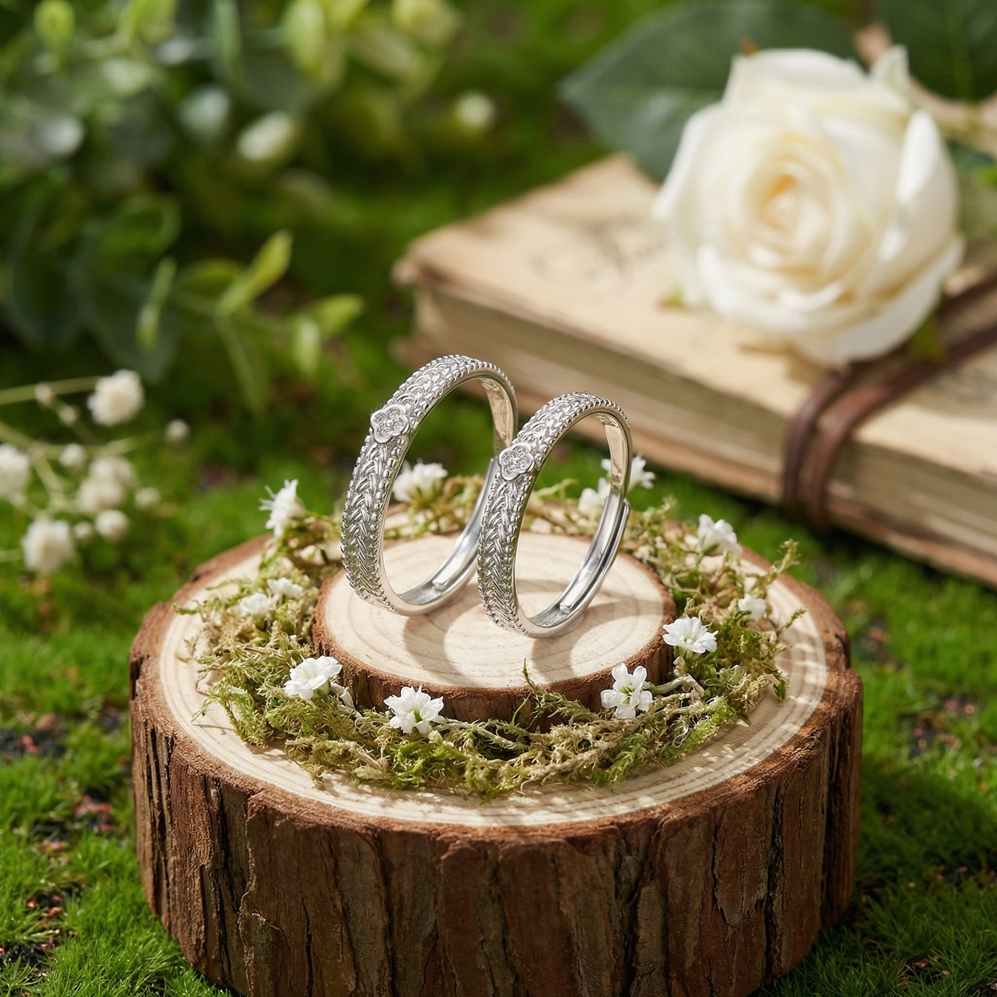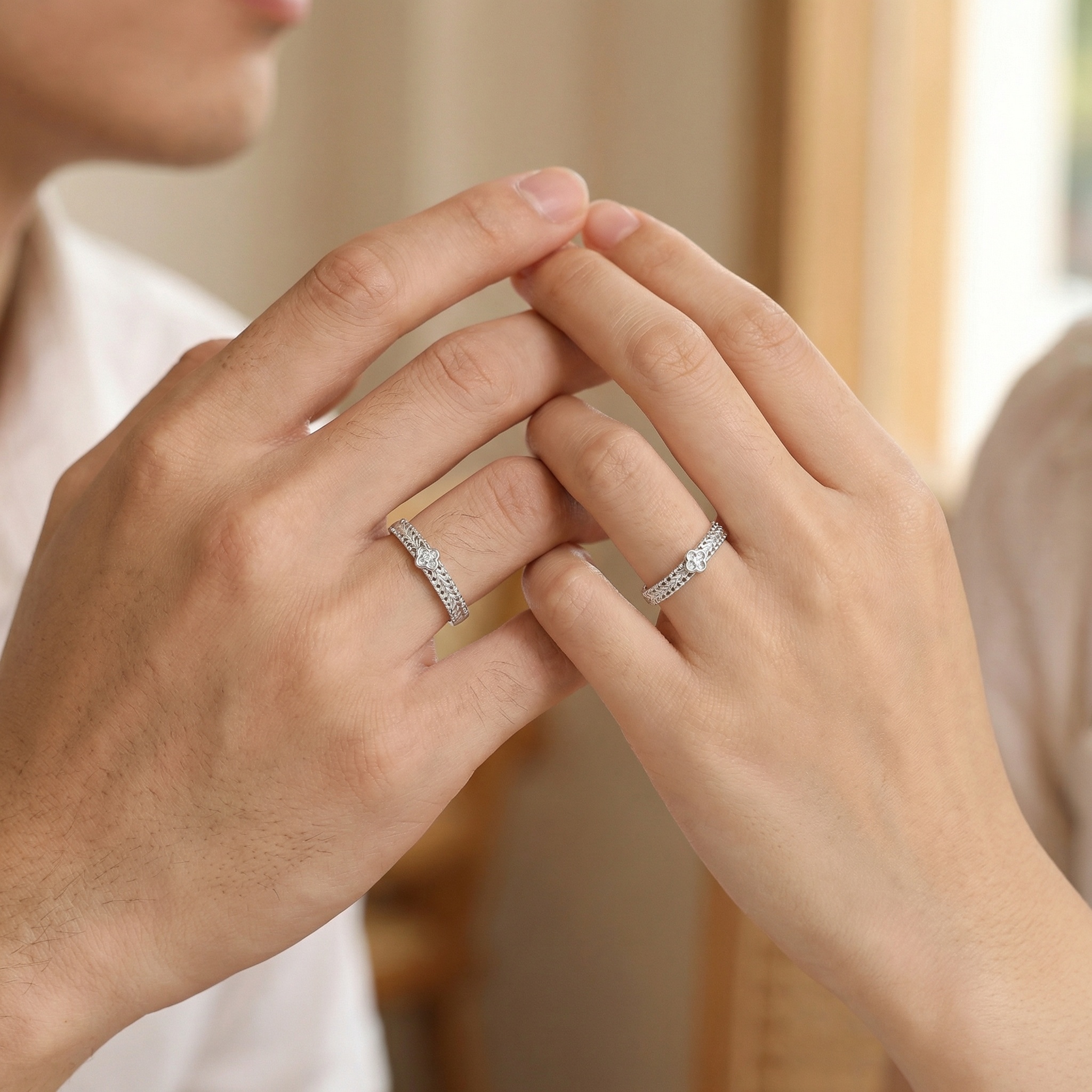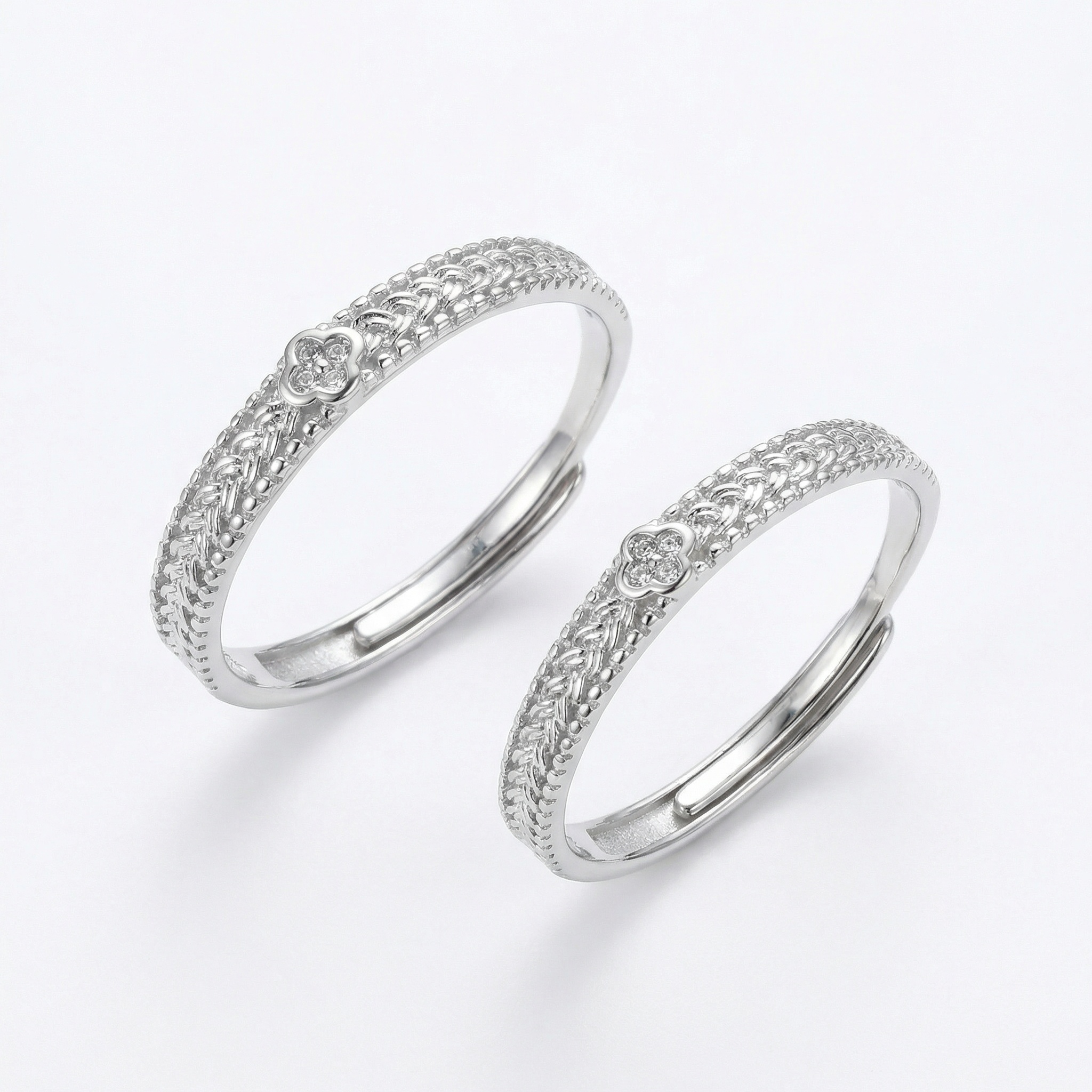 These exquisite matching rings are crafted from high-quality silver, featuring a unique braided texture that adds depth and sophistication to the band. Each ring is adorned with a delicate four-leaf clover charm, beautifully set with sparkling cubic zirconia that glimmers with every movement. Designed for versatility and comfort, the open-back adjustable bands allow for a customized fit, making them a perfect gift for partners or friends. The intricate craftsmanship combined with a polished finish ensures these rings stand out as timeless pieces of jewelry. Symbolizing luck and connection, they are an ideal choice for anniversaries, engagements, or adding a touch of elegance to any outfit. These lightweight yet durable rings provide a blend of modern style and classic charm, making them a must-have accessory for any jewelry enthusiast seeking quality and meaning in their collection. | Brand: jewelryodm