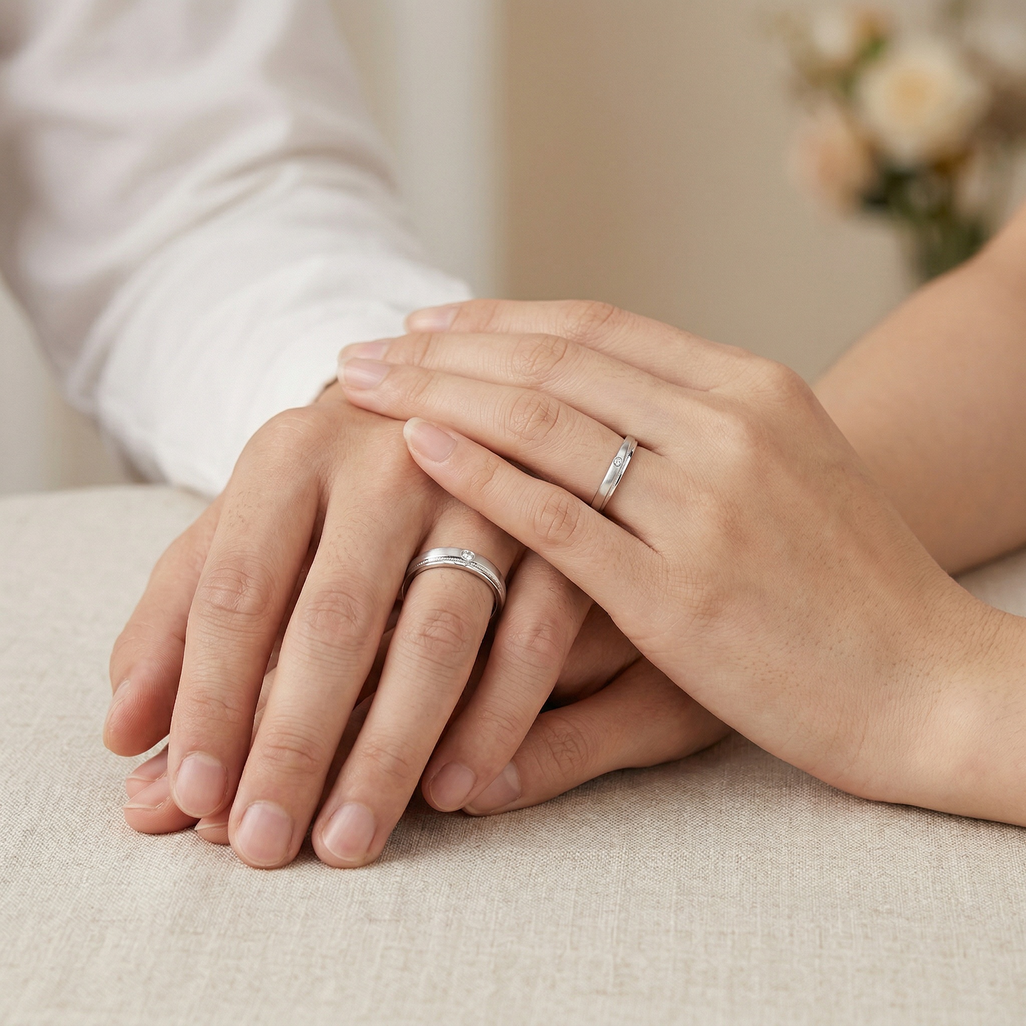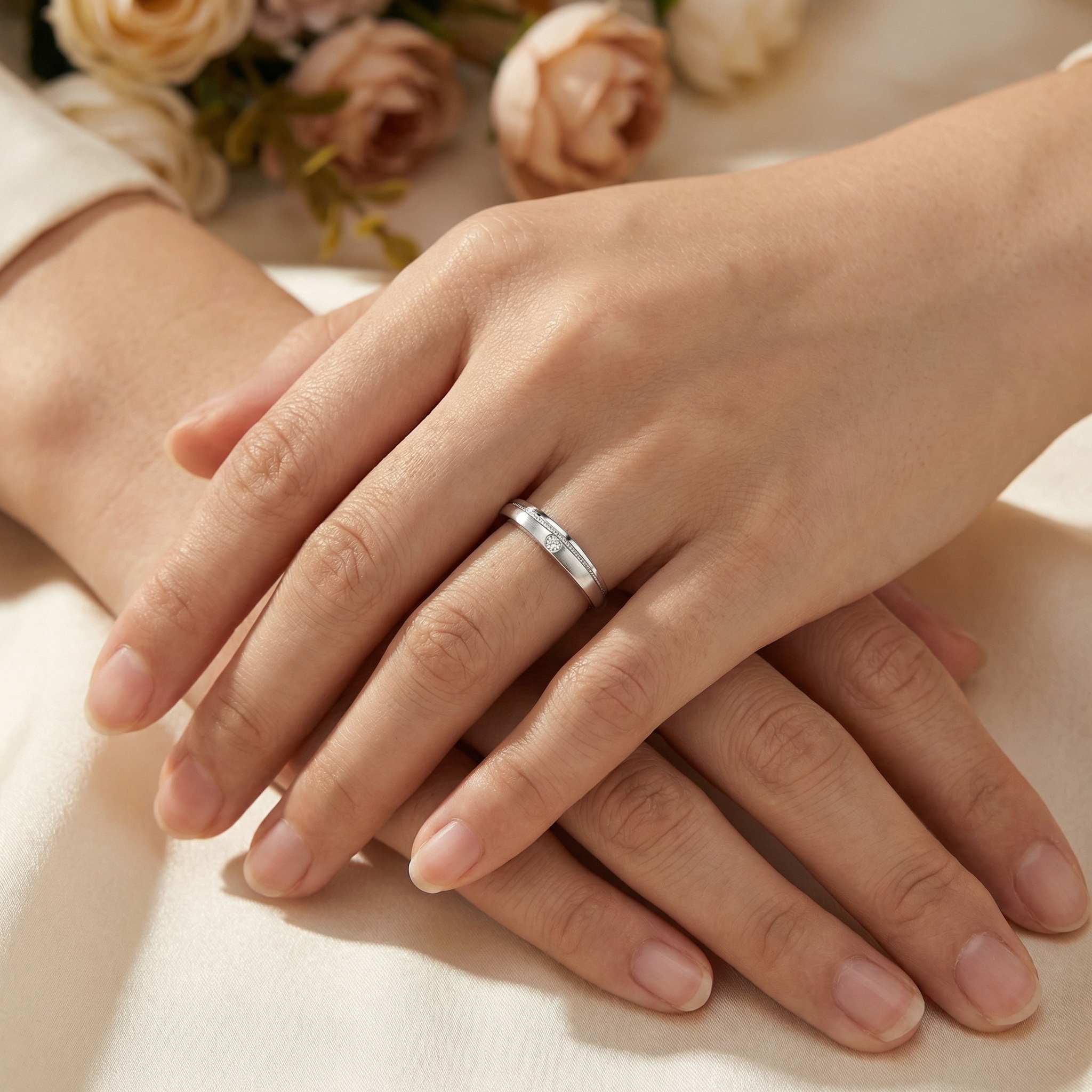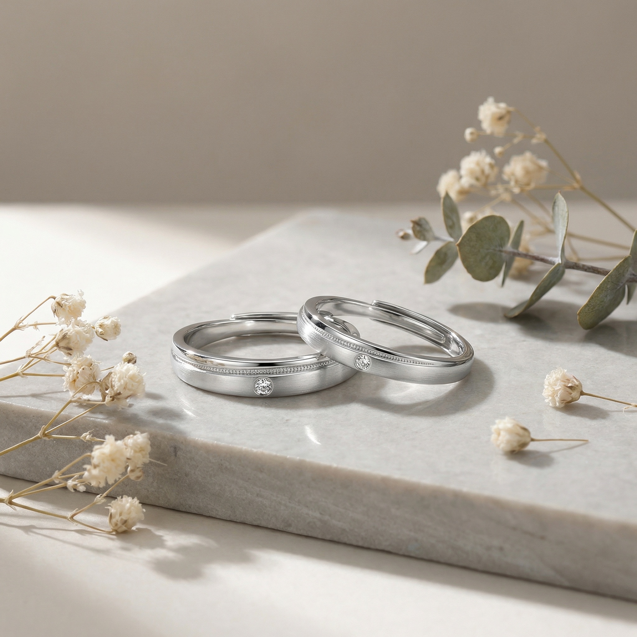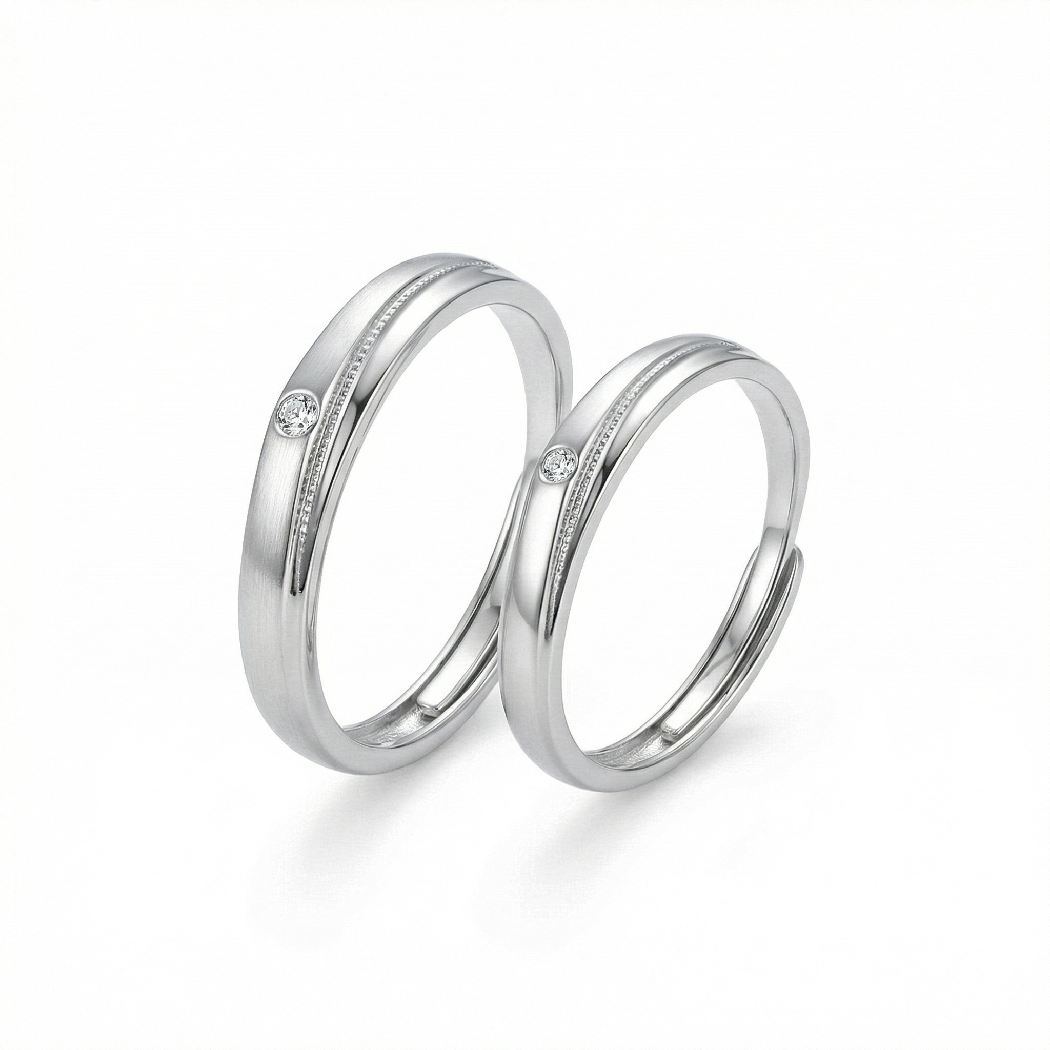 This exquisite pair of matching silver-toned rings is designed for couples who appreciate modern elegance and versatility. Each ring features a sophisticated dual-textured band, seamlessly blending a refined matte-brushed finish with a radiant polished edge. A delicate, beaded texture runs along the center of the band, guiding the eye to a single, brilliant-cut gemstone that adds a subtle touch of sparkle. The innovative open-back adjustable design allows for a perfect, comfortable fit on any finger, making them an ideal choice for promise rings or symbolic wedding bands. Crafted with meticulous attention to detail, these rings represent a harmonious and enduring bond. Their clean, minimalist aesthetic ensures they complement any attire, making them suitable for both everyday wear and special milestones. This timeless set is a beautiful way to celebrate love and commitment with style. | Brand: jewelryodm