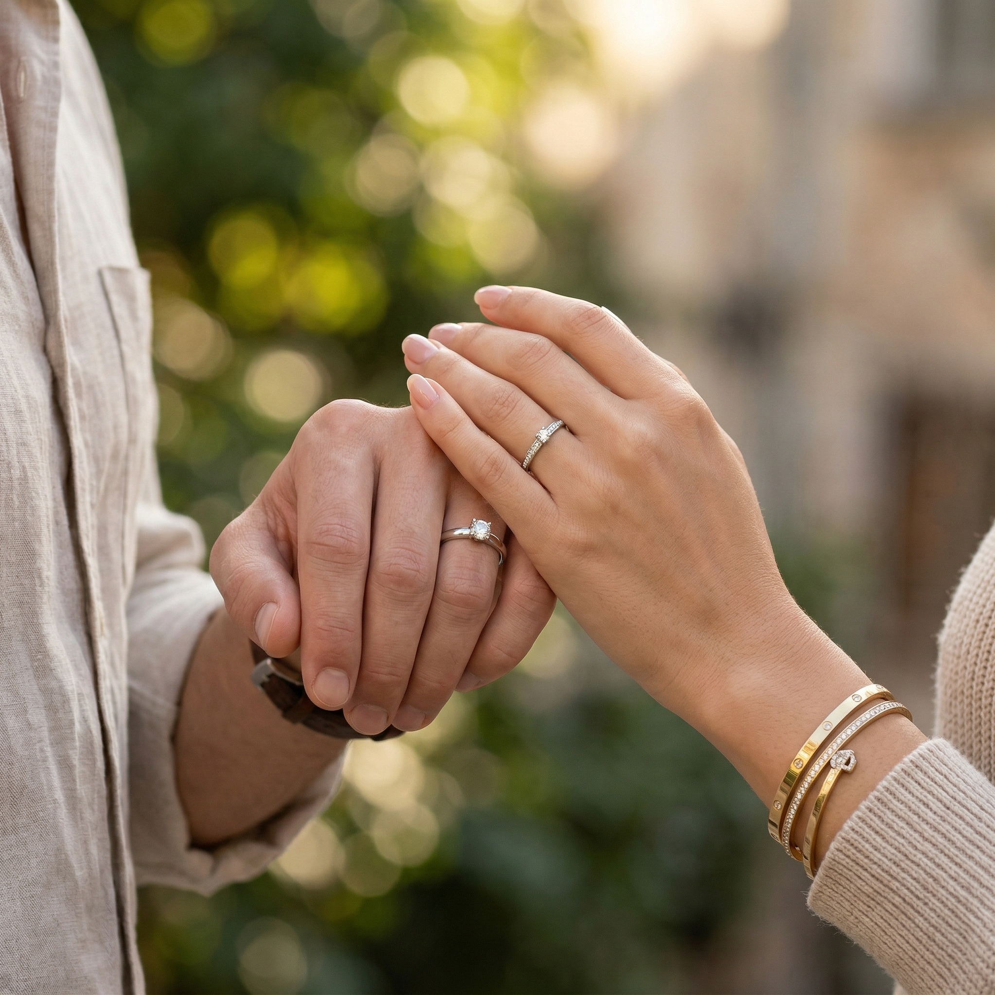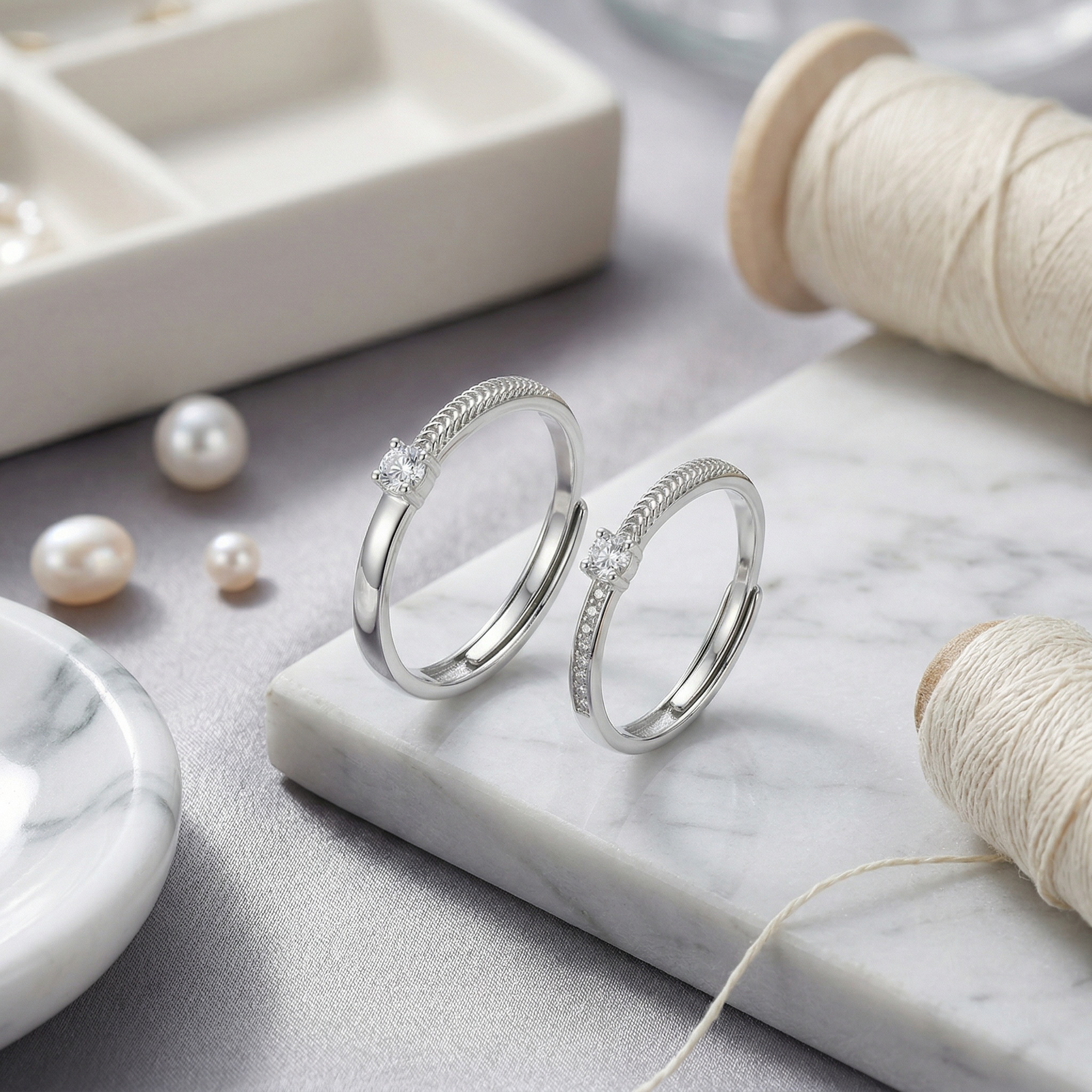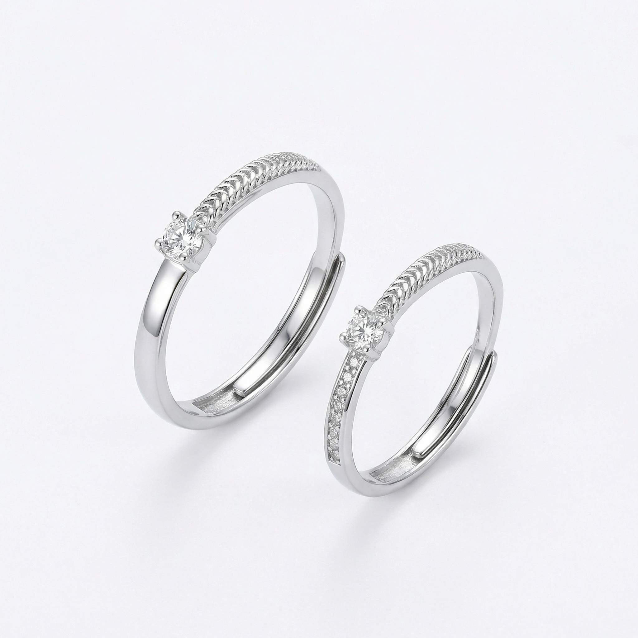 This exquisite pair of matching couple rings is crafted from high-quality silver, offering a timeless and sophisticated look. Each ring features a brilliant round-cut solitaire gemstone, securely held in a classic four-prong setting to maximize its sparkle. The unique design incorporates a beautiful twisted rope texture along half of the band, contrasting elegantly with the smooth, polished finish of the other side. These rings are thoughtfully designed with an adjustable open-end feature, ensuring a comfortable and perfect fit for any finger size. Whether given as a promise, engagement, or anniversary gift, these rings symbolize a special bond and shared elegance. Their minimalist yet detailed aesthetic makes them versatile for both daily wear and special occasions, adding a touch of refined glamour to any ensemble. | Brand: jewelryodm
