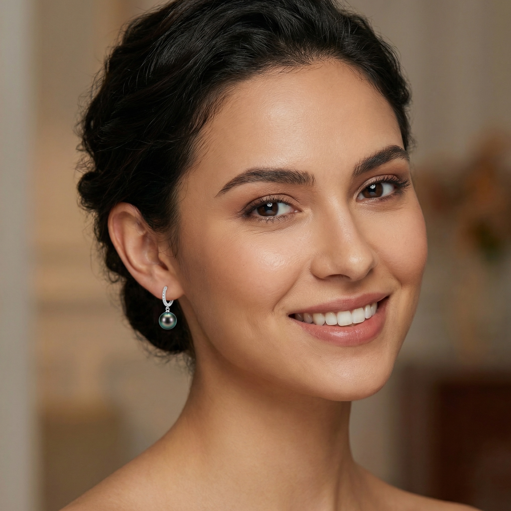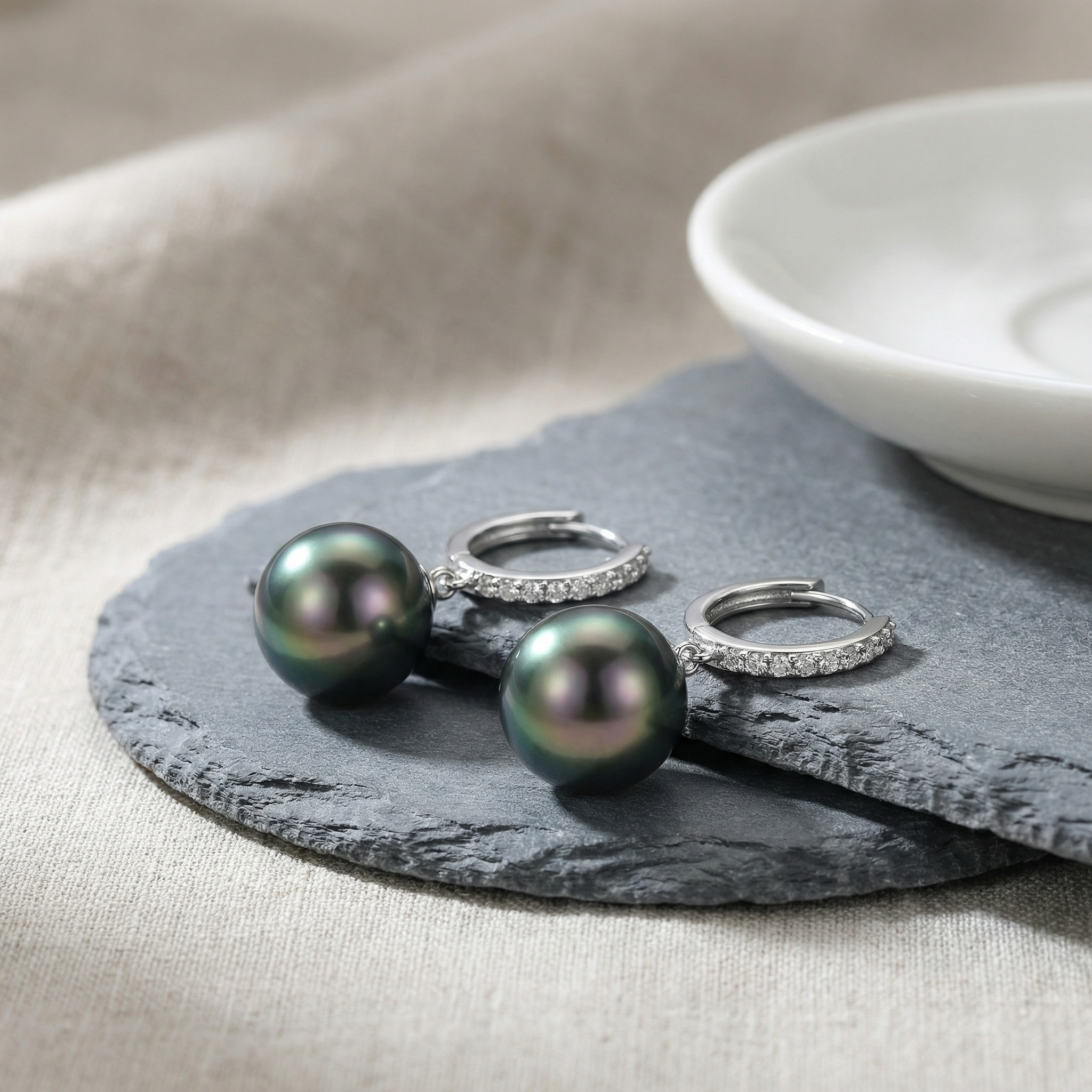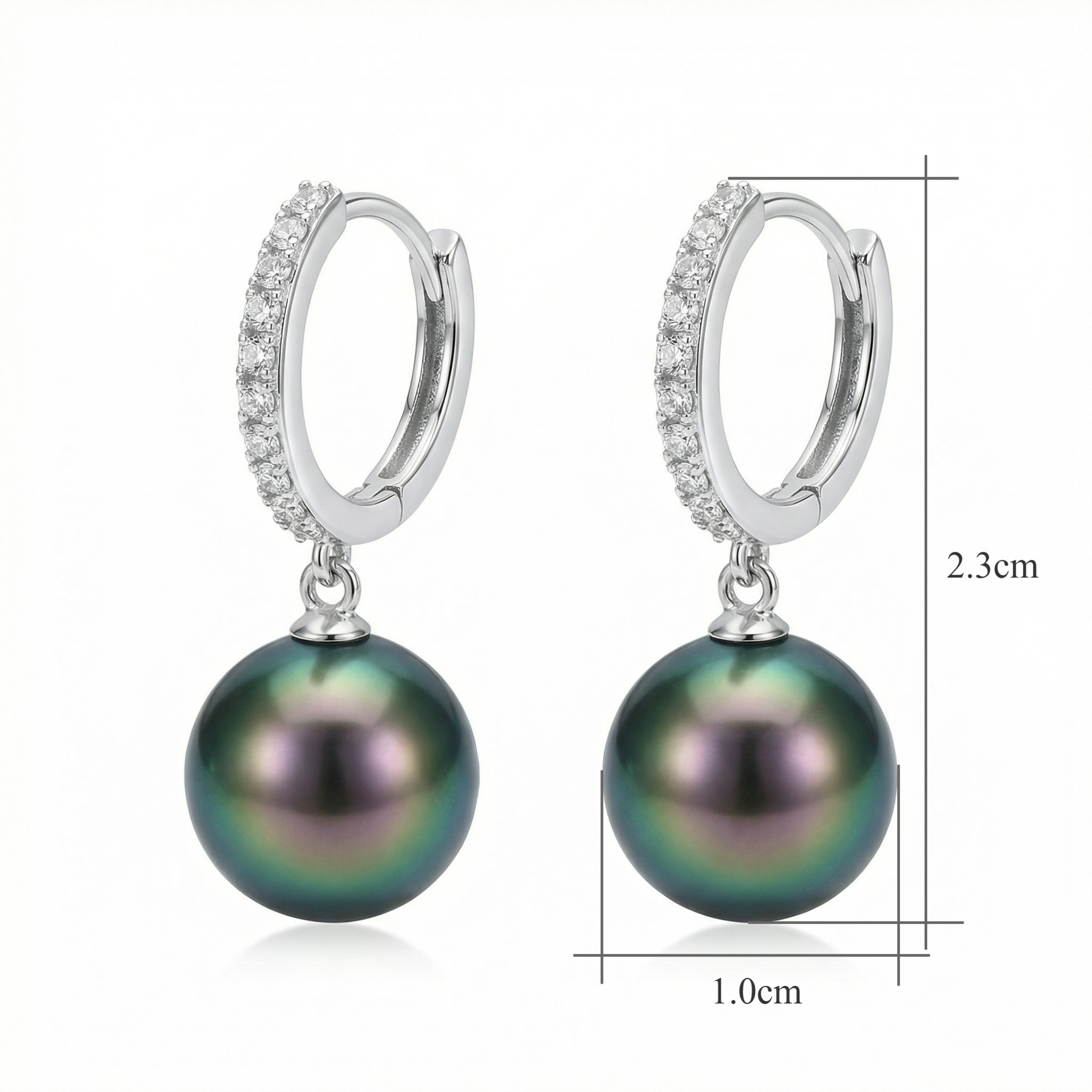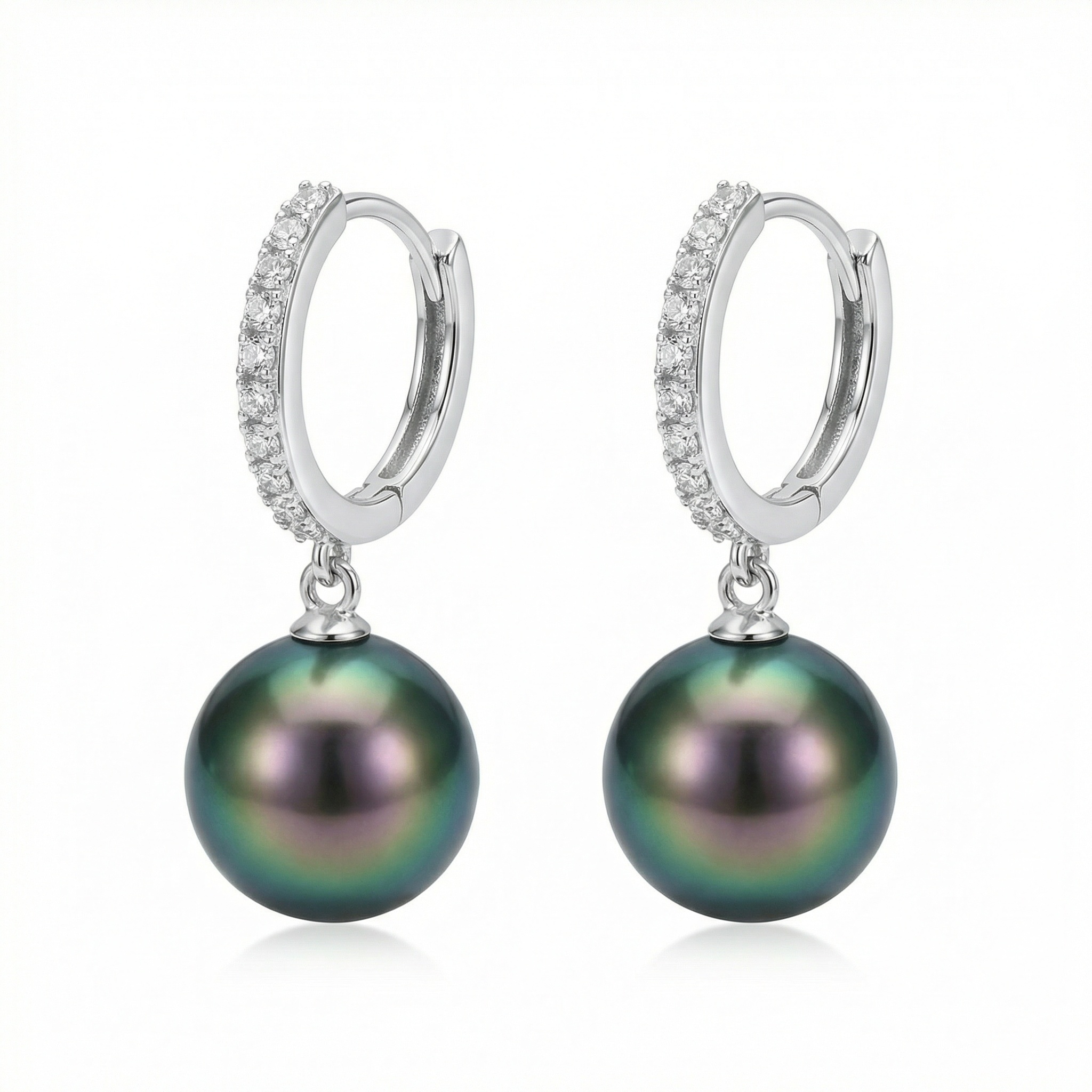 These exquisite huggie hoop earrings feature a stunning pair of round Tahitian black pearls, known for their deep, lustrous hues and natural peacock green iridescence. Each pearl is delicately suspended from a polished silver-toned hoop, meticulously pavé-set with shimmering stones that add a touch of brilliant sparkle. The sleek, modern design combines timeless elegance with contemporary style, making them a perfect choice for both formal occasions and everyday luxury. Crafted with high-quality materials and a secure closure, these earrings offer a comfortable fit and a sophisticated aesthetic. Whether as a treat for yourself or a meaningful gift for someone special, these pearl drop earrings are sure to become a cherished addition to any jewelry collection. | Brand: jewelryodm