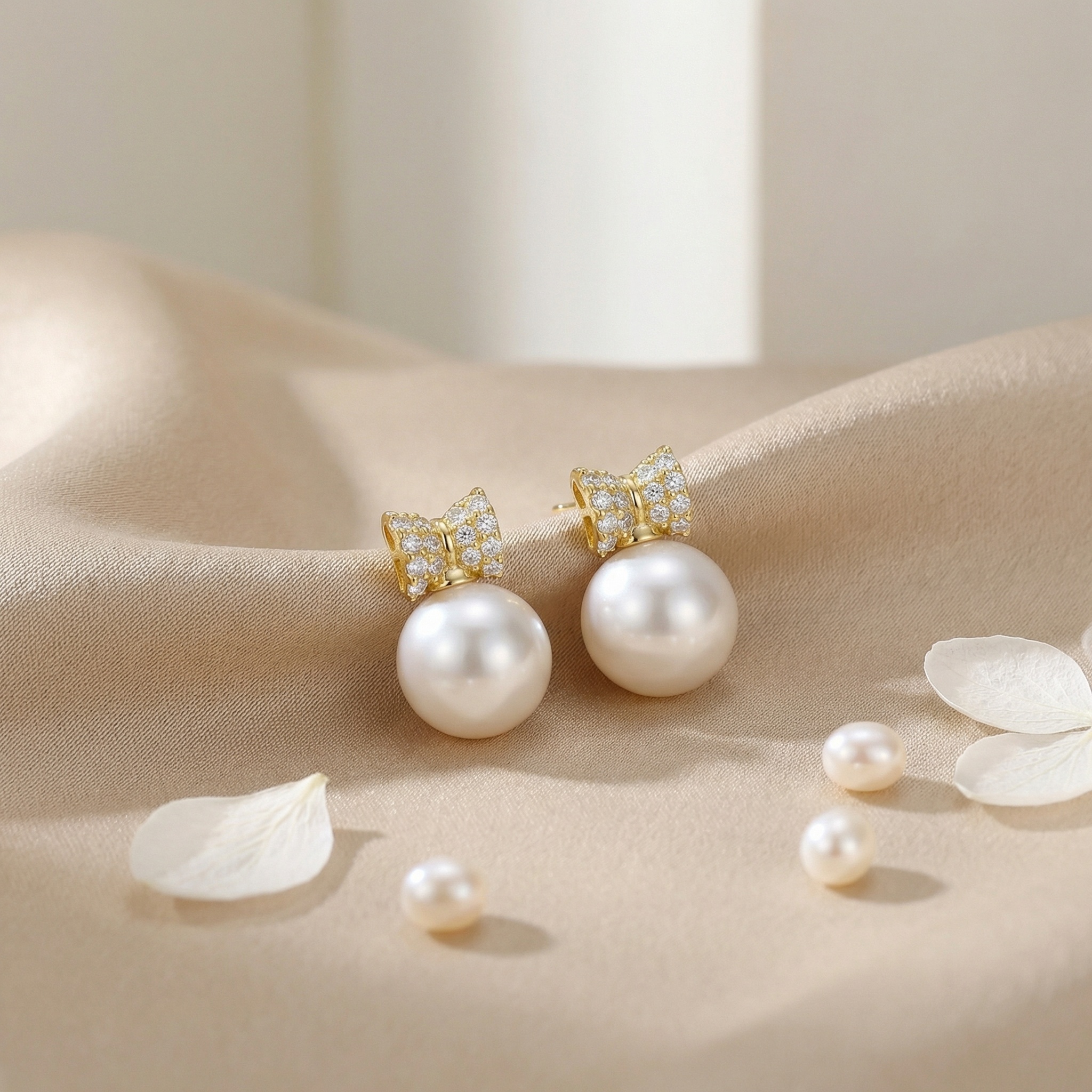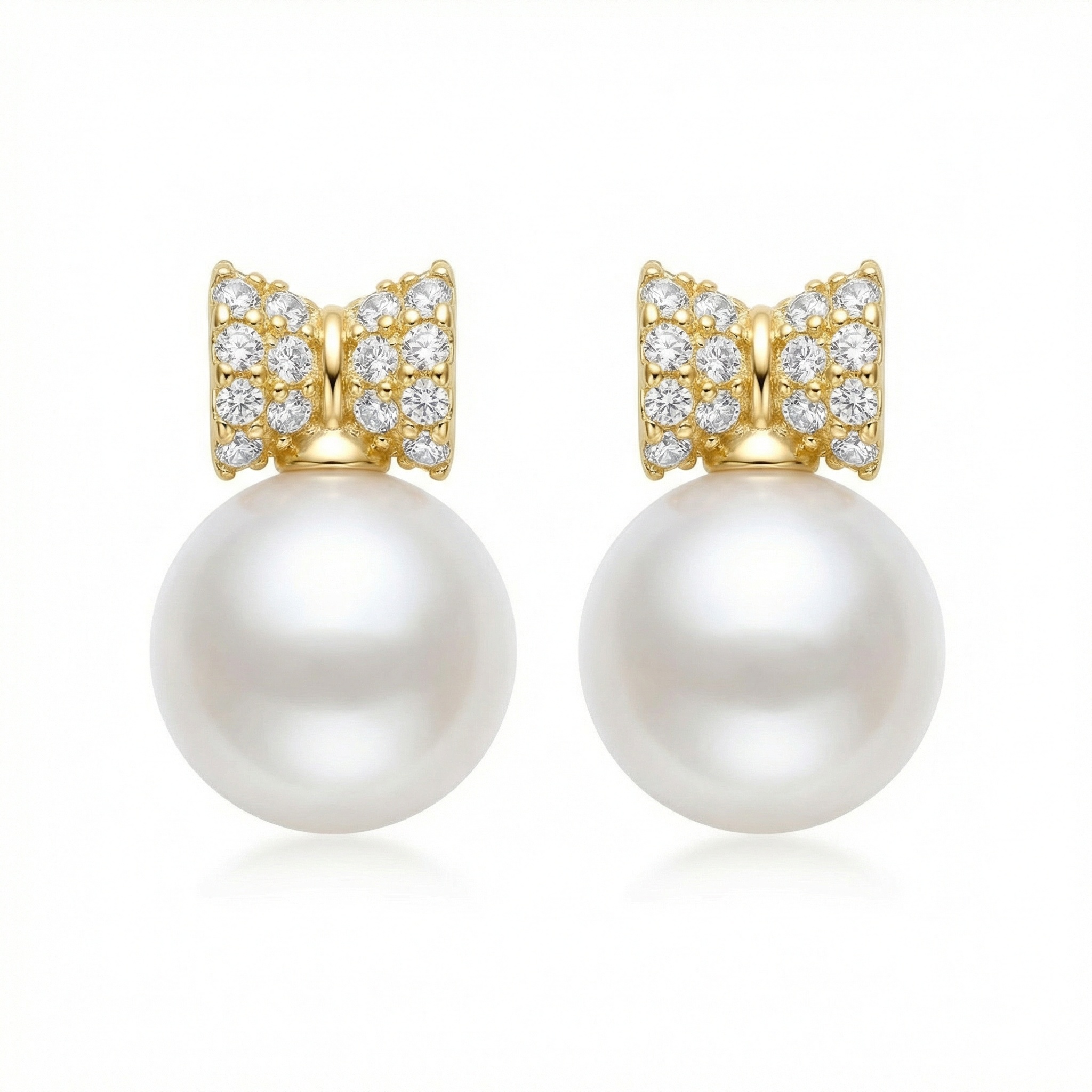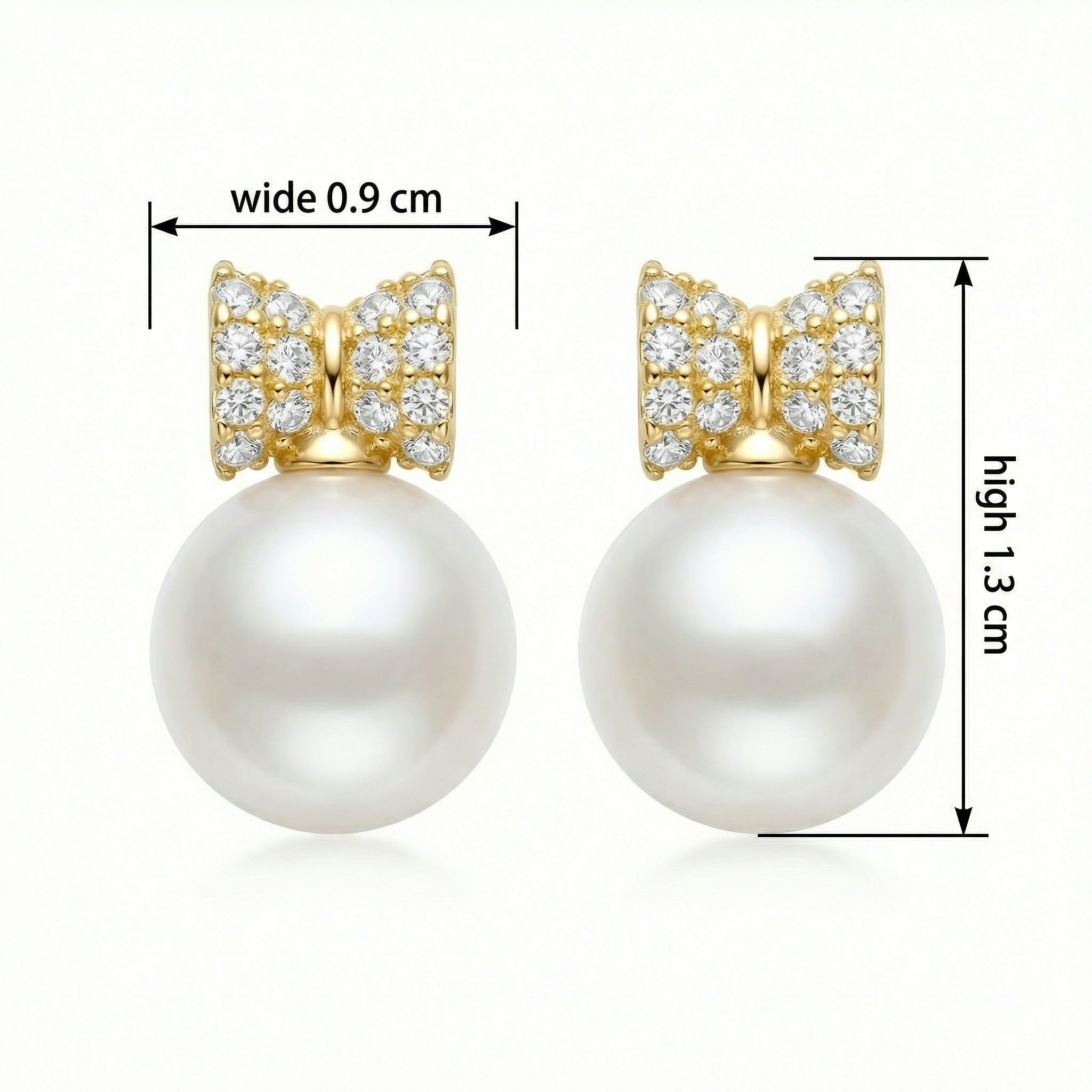 These stunning earrings showcase a perfect blend of classic elegance and feminine charm. Each piece features a large, lustrous white pearl suspended beneath a beautifully detailed bow-shaped stud. The bows are meticulously encrusted with brilliant, small clear stones that catch the light from every angle, providing a radiant shimmer. The smooth, creamy surface of the pearls contrasts perfectly with the sparkling accents, creating a sophisticated look suitable for any occasion. Whether paired with a formal gown or a casual outfit, these earrings add a touch of refined grace. The secure backing ensures comfortable wear throughout the day, while the high-quality craftsmanship guarantees lasting beauty. A versatile addition to any jewelry collection, these pearl drops make an ideal gift for weddings, anniversaries, or special milestones. | Brand: jewelryodm