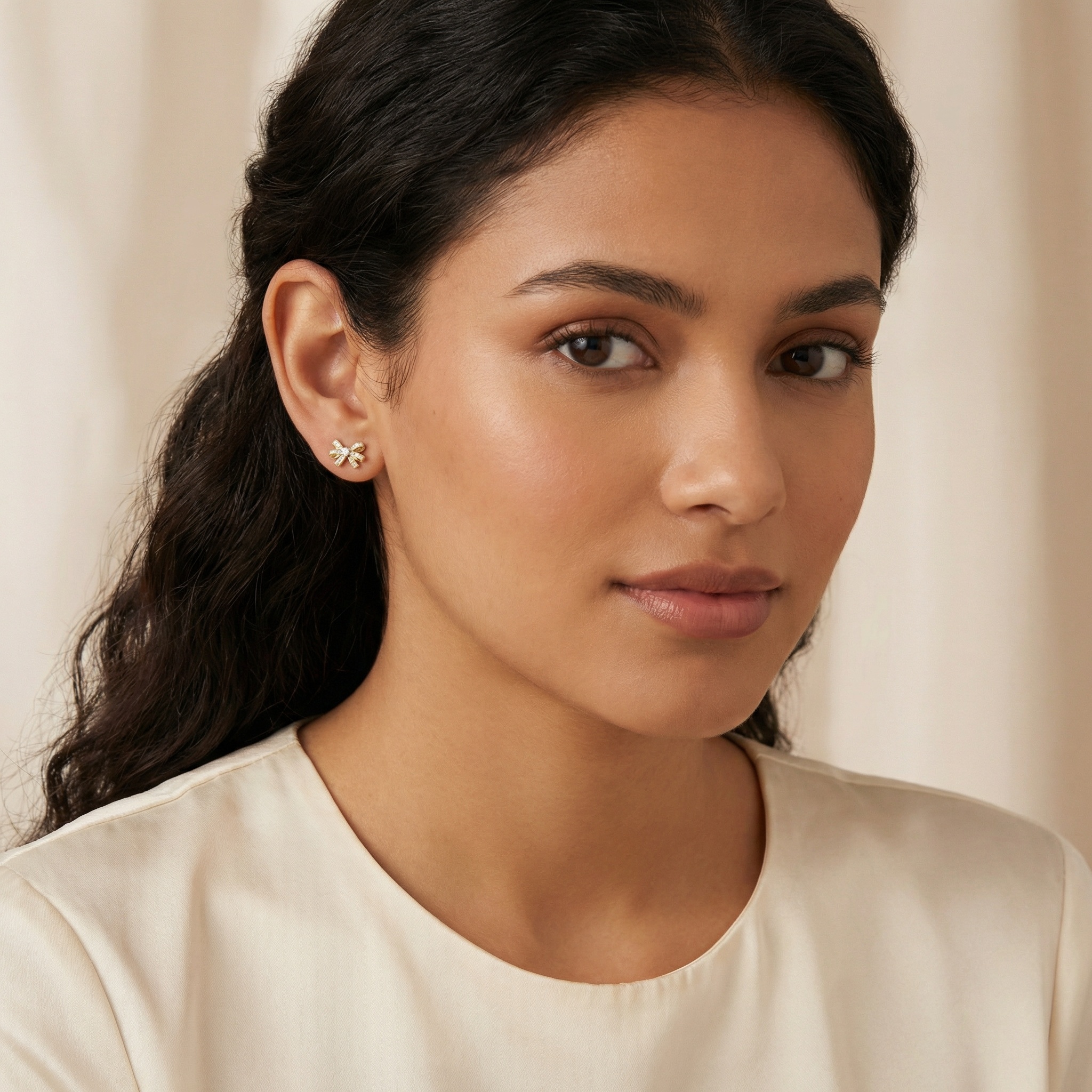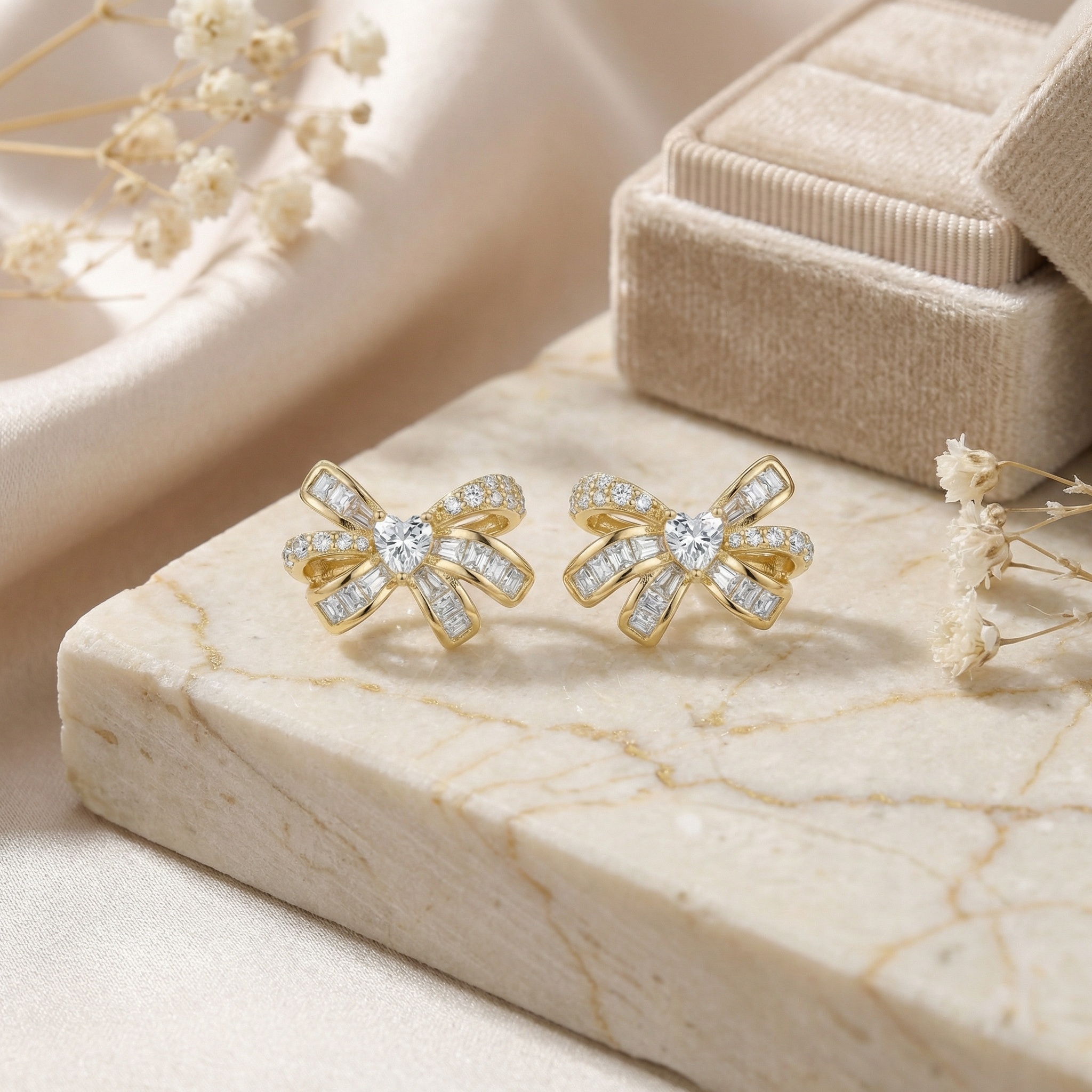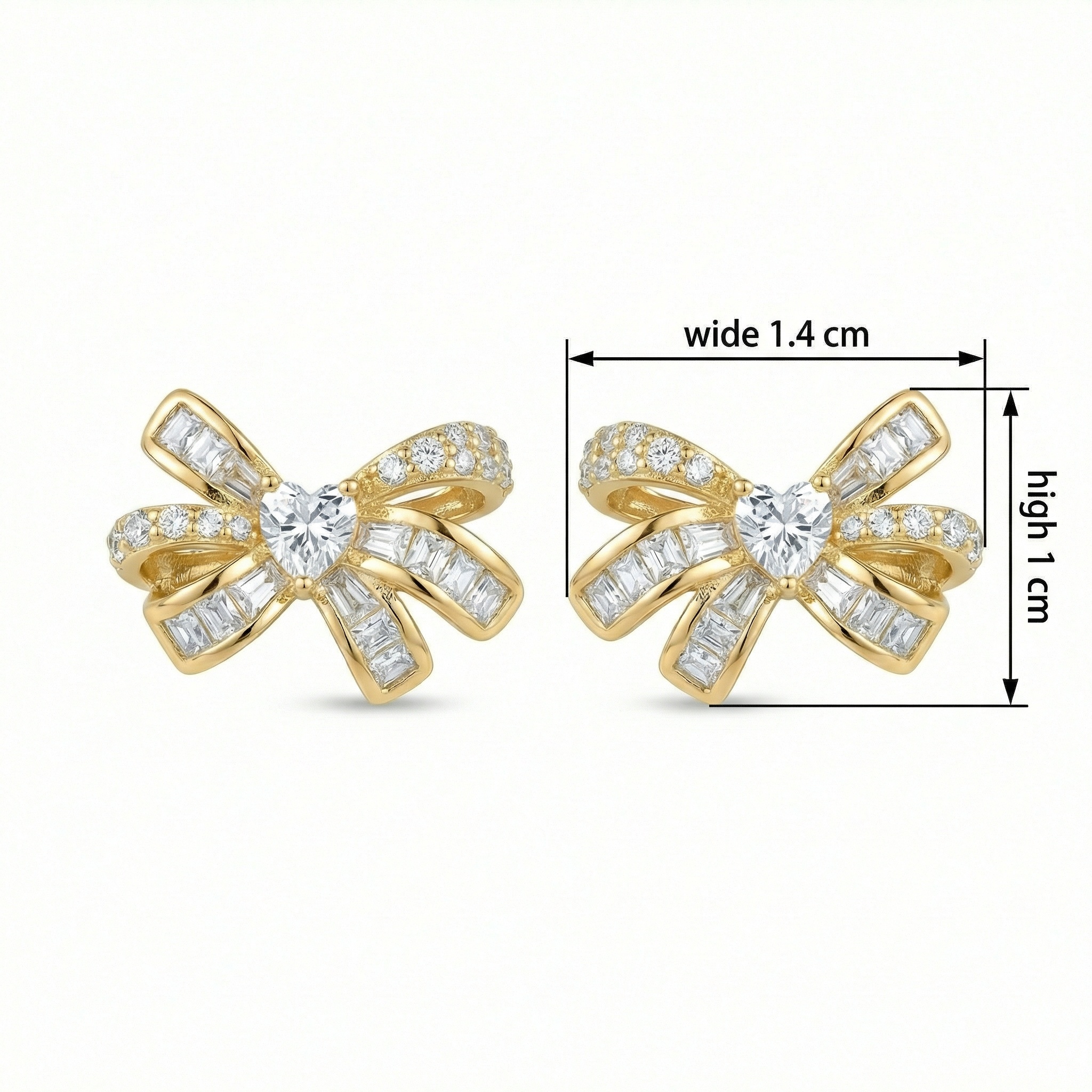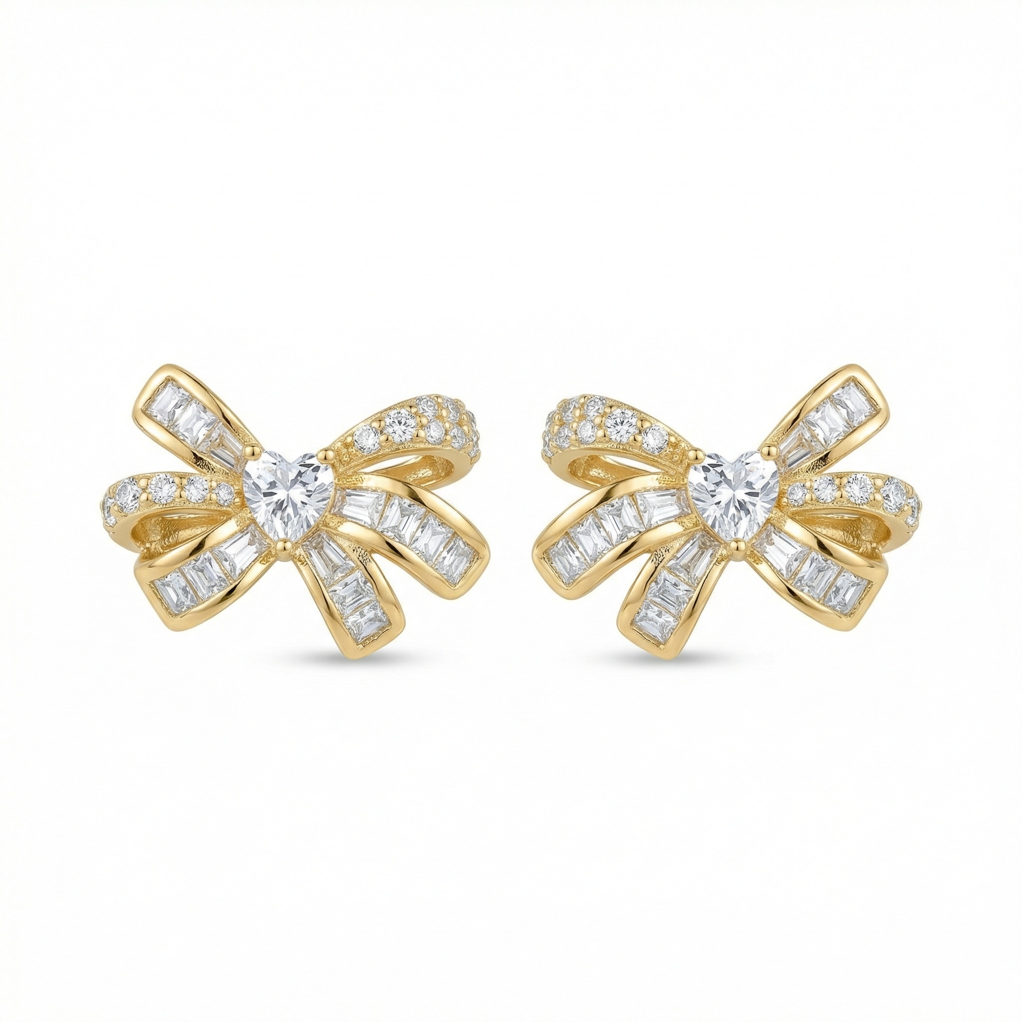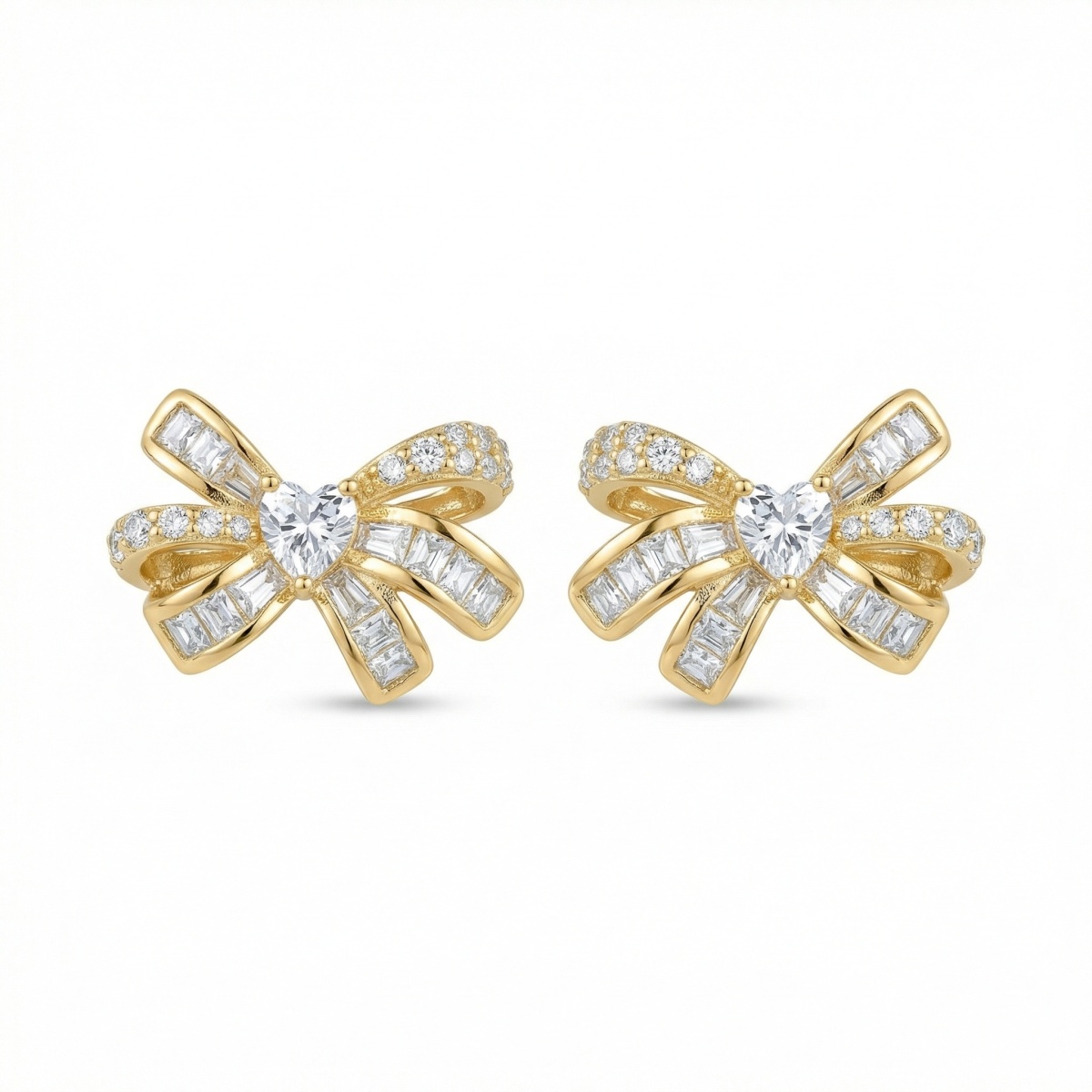 These stunning earrings feature a delicate bow design, meticulously crafted with a polished finish. At the heart of each bow sits a brilliant heart-shaped stone, radiating romance and elegance. The loops and ribbons of the bows are adorned with a sophisticated mix of baguette-cut and round pave-set stones, creating a multi-dimensional sparkle that catches the light from every angle. The warm metallic tones perfectly complement the clear stones, making them a versatile accessory for both special occasions and everyday luxury. These studs offer a secure fit and a timeless silhouette, making them a perfect gift for someone special or a charming addition to any jewelry collection. Their intricate craftsmanship and feminine appeal ensure they remain a cherished piece for years to come. | Brand: jewelryodm
