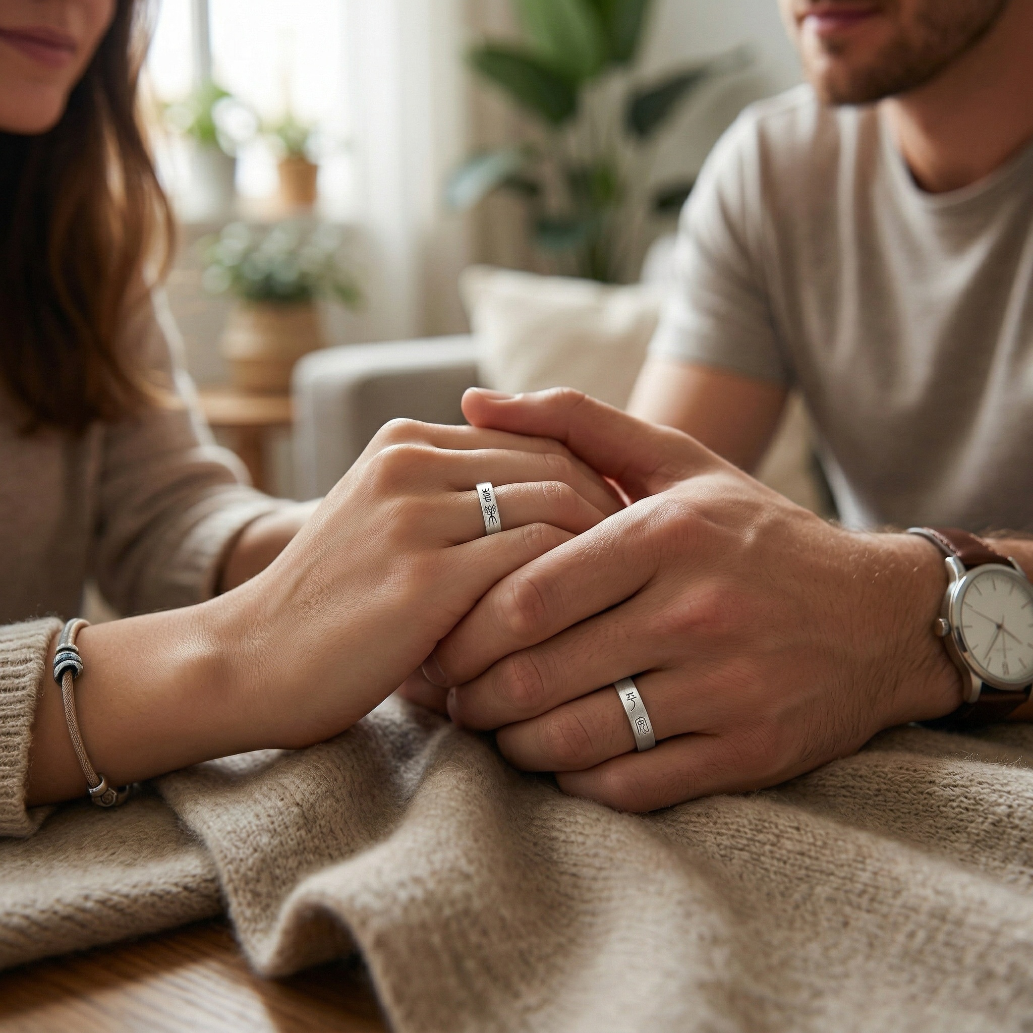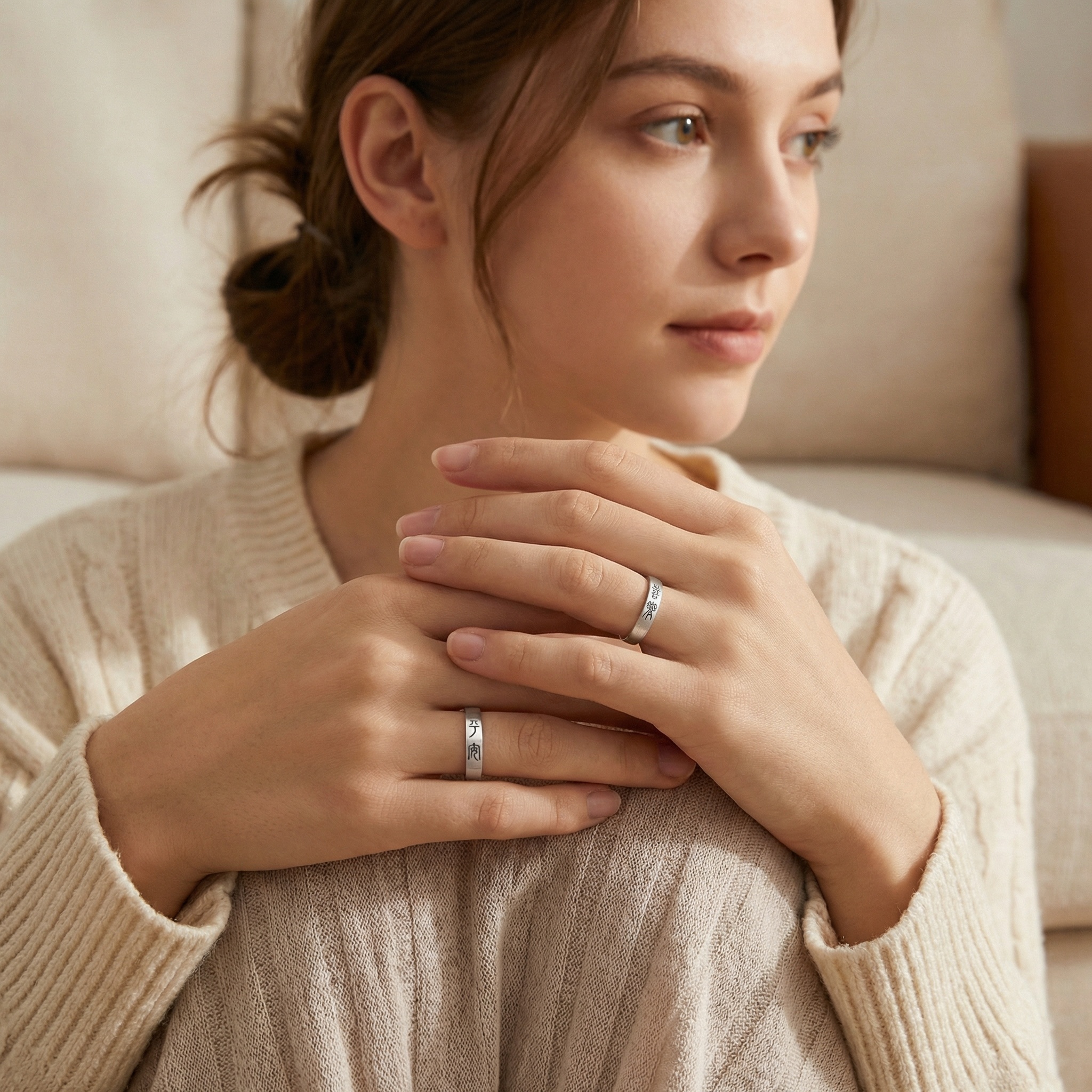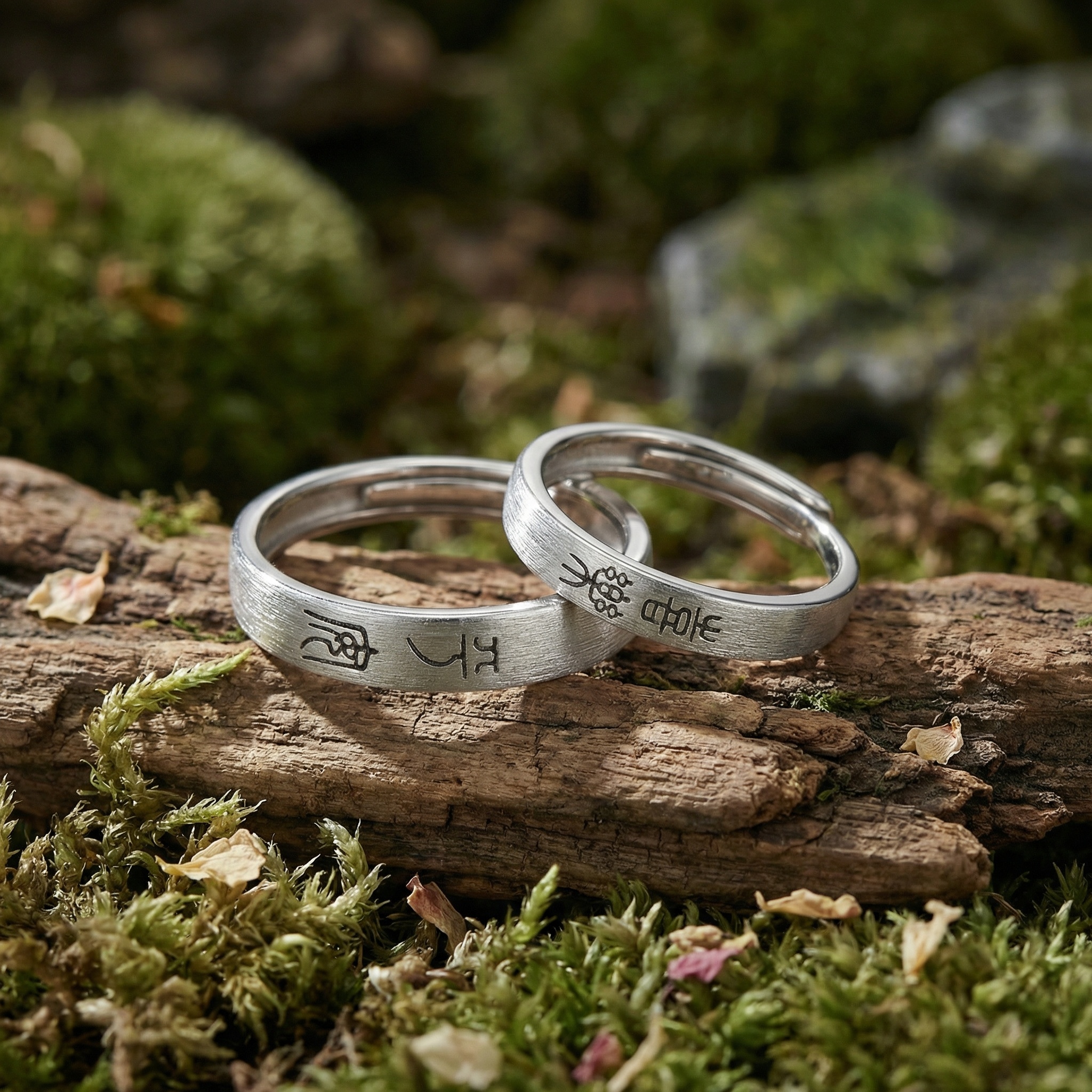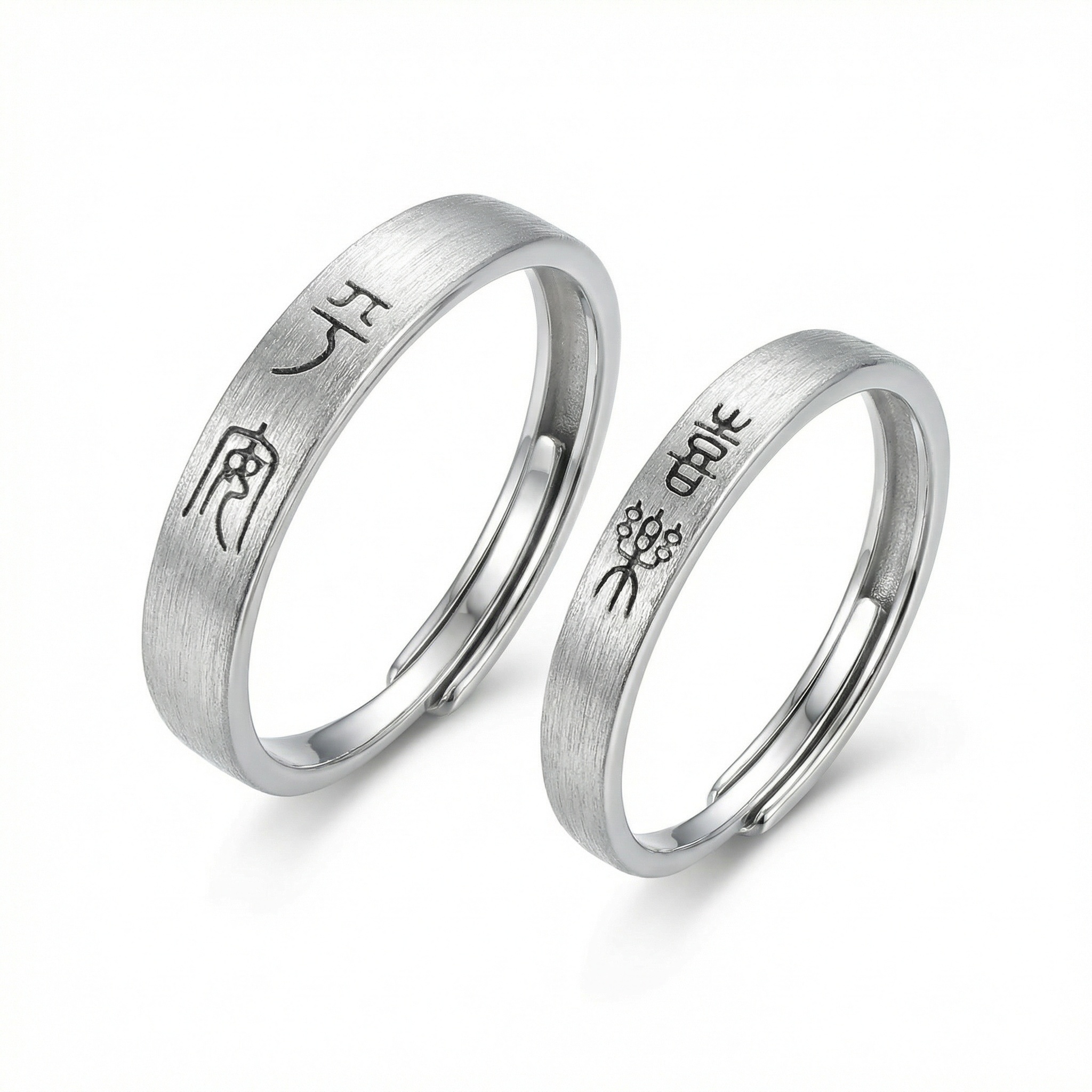 These exquisite couple rings are crafted from high-quality silver with a sophisticated brushed matte finish. Each band is elegantly engraved with ancient Chinese seal script, adding a touch of timeless cultural heritage and symbolic meaning to the set. The minimalist yet profound design makes them a perfect gift for anniversaries, weddings, or as a promise of eternal connection. Featuring an adjustable open-end design, these rings ensure a comfortable and customized fit for any finger size. The subtle texture of the brushed surface reflects light softly, highlighting the intricate black calligraphy. Combining traditional artistry with modern craftsmanship, these rings serve as a beautiful testament to a shared journey and a lasting bond between two souls. | Brand: jewelryodm