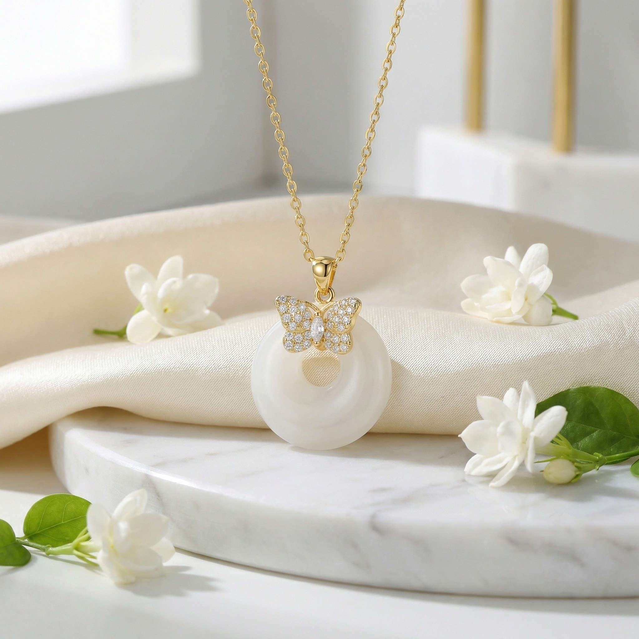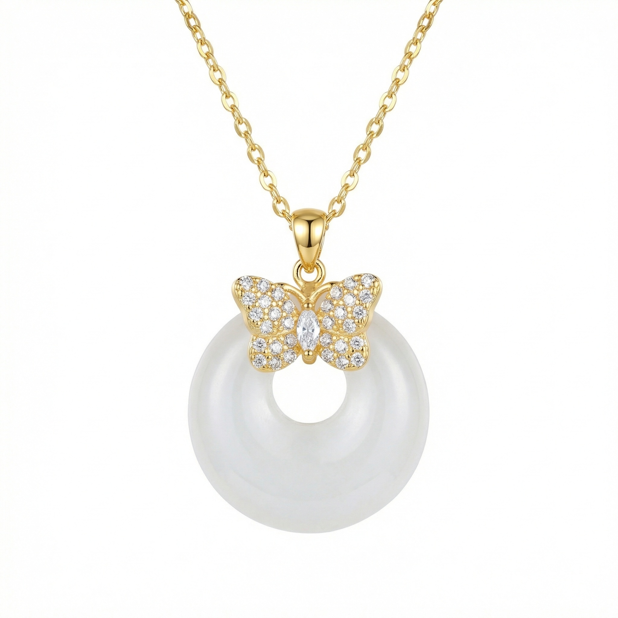 925 Sterling Silver Elegant Butterfly and White Gemstone Circular Pendant Necklace