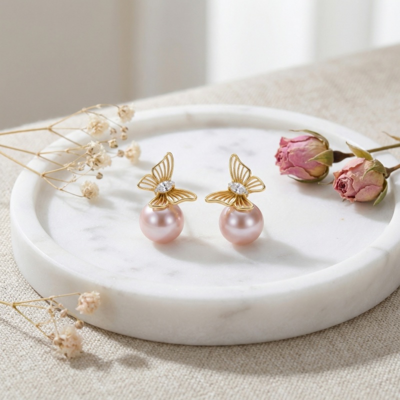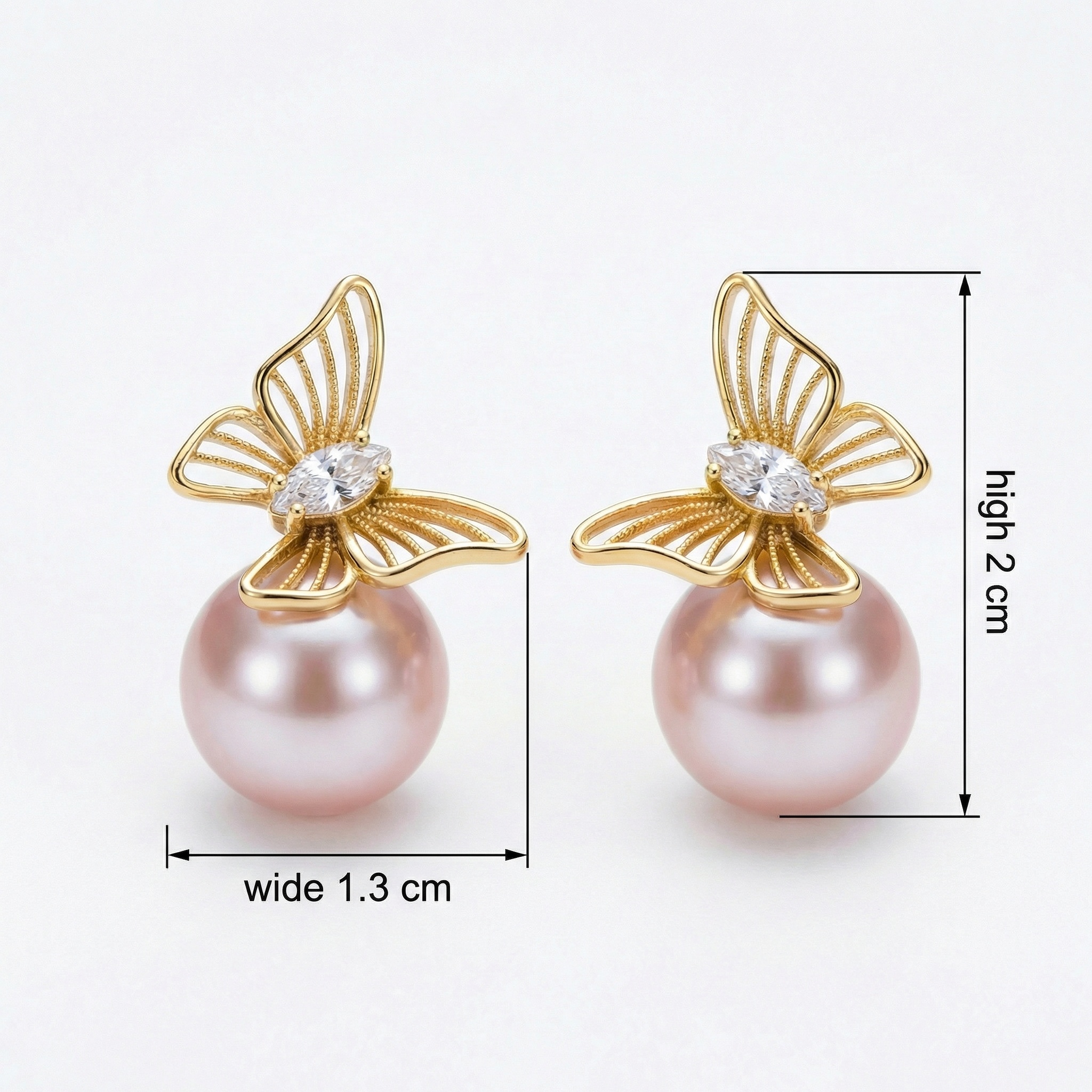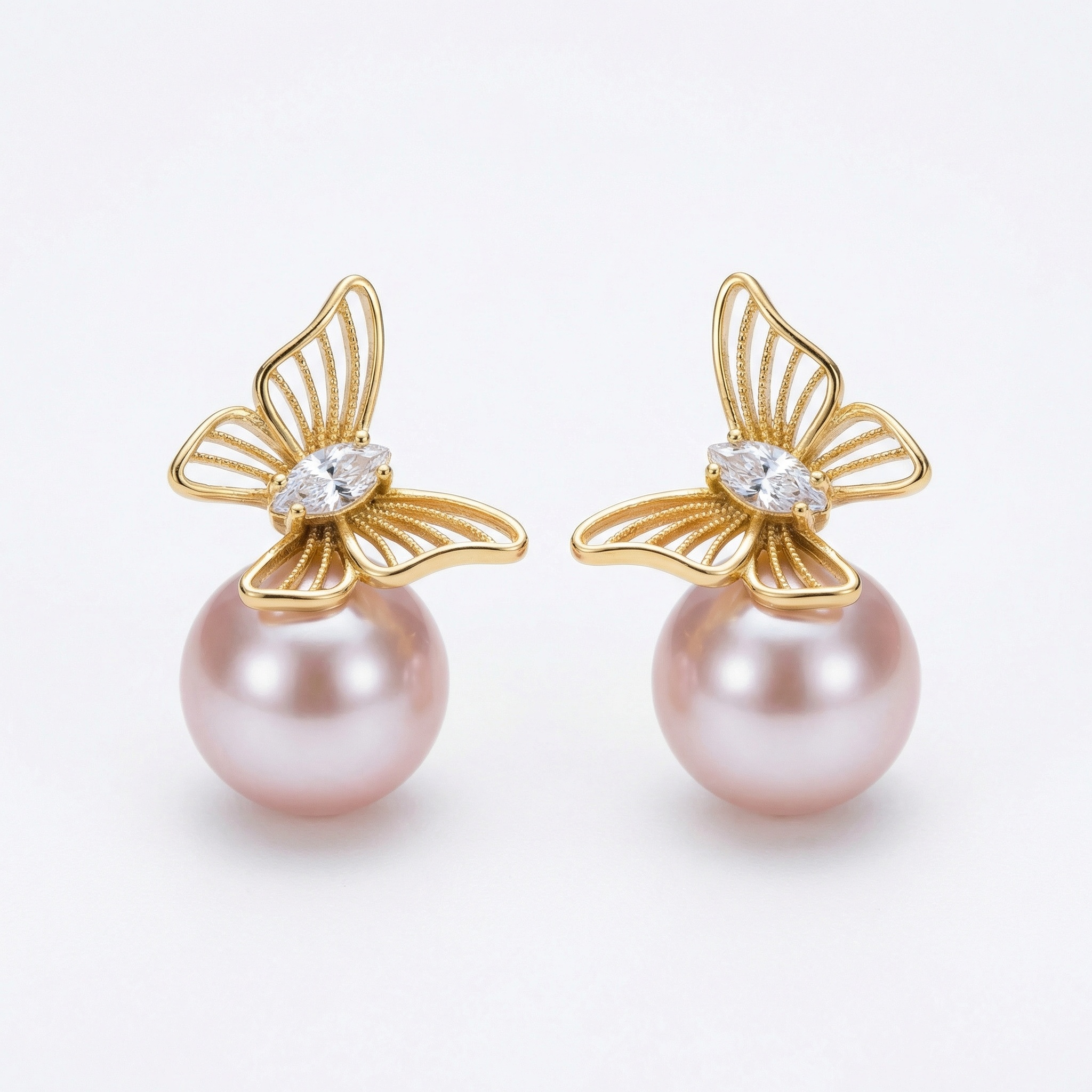 These exquisite earrings showcase a pair of lustrous pink pearls, celebrated for their soft radiance and smooth finish. Perched elegantly above each pearl is a meticulously designed butterfly, featuring intricate openwork wings that capture a sense of delicate movement. The centerpiece of each butterfly is a shimmering marquise-cut clear gemstone, providing a sophisticated sparkle that catches the light beautifully. The warm-toned metallic setting perfectly enhances the pearls' subtle lavender-pink hues, resulting in a design that is both romantic and refined. Ideal for weddings, special events, or adding a touch of whimsy to daily attire, these earrings represent a perfect blend of nature-inspired beauty and classic craftsmanship. They serve as a stunning statement piece or a cherished gift for those who appreciate fine jewelry with a feminine touch. | Brand: jewelryodm