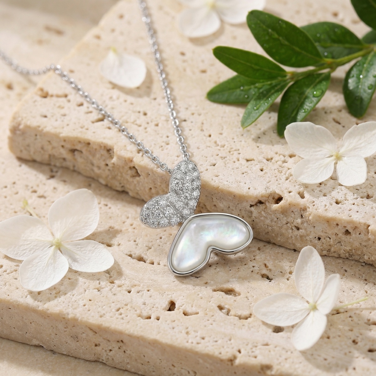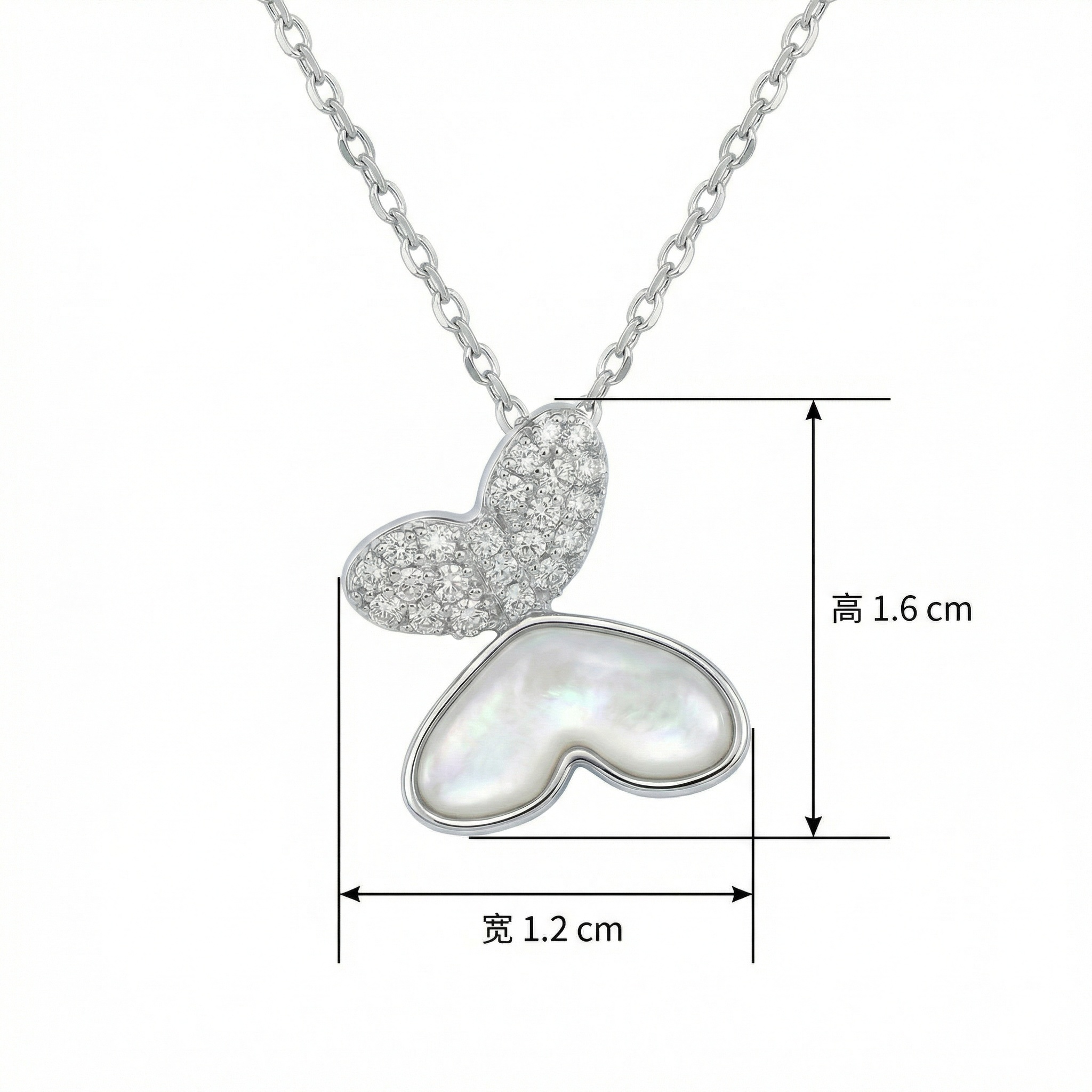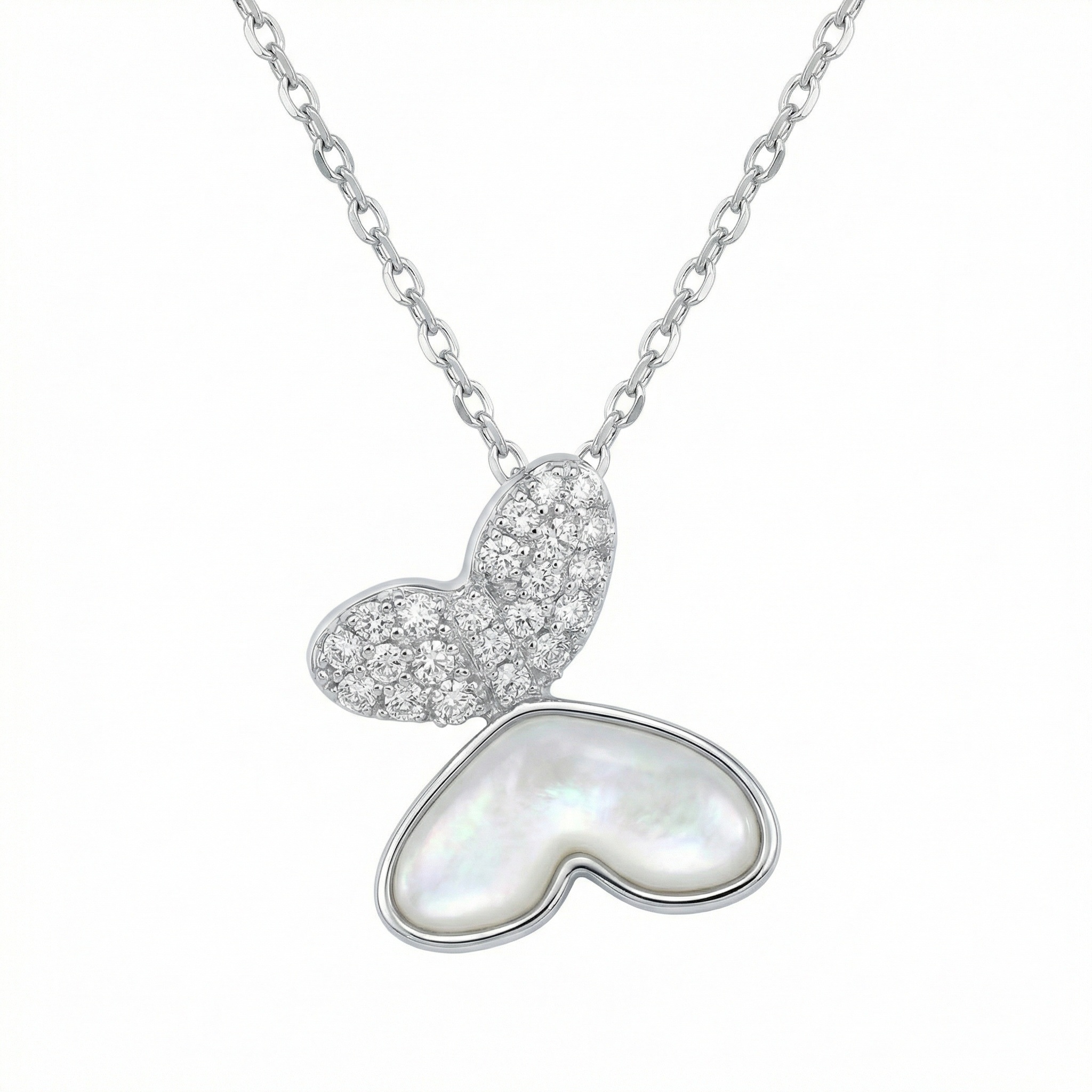 This exquisite necklace features a beautifully crafted butterfly pendant suspended from a delicate silver cable chain. The design artistically combines two contrasting textures: the upper wings are encrusted with sparkling pavé-set stones that catch the light from every angle, while the lower section is inlaid with a smooth, iridescent mother-of-pearl. The polished finish of the white metal frame enhances the brilliance of the gems and the soft, luminous glow of the shell. Capturing the grace of nature, this elegant piece is a sophisticated accessory suitable for both daily wear and special occasions. It serves as a timeless symbol of transformation and beauty, making it an ideal gift for a loved one or a charming addition to any personal jewelry collection. | Brand: jewelryodm