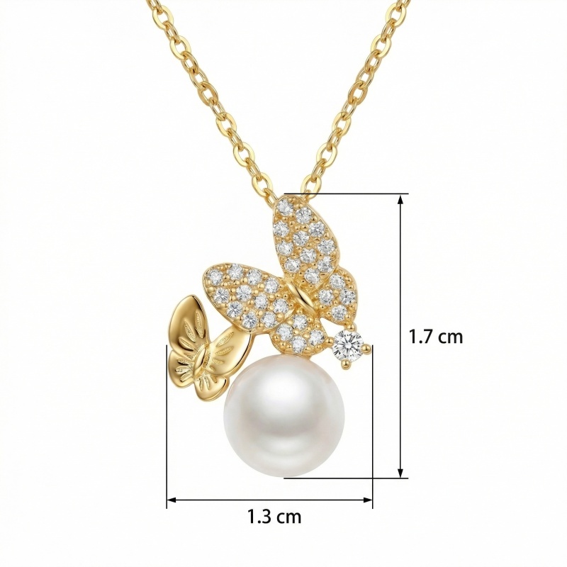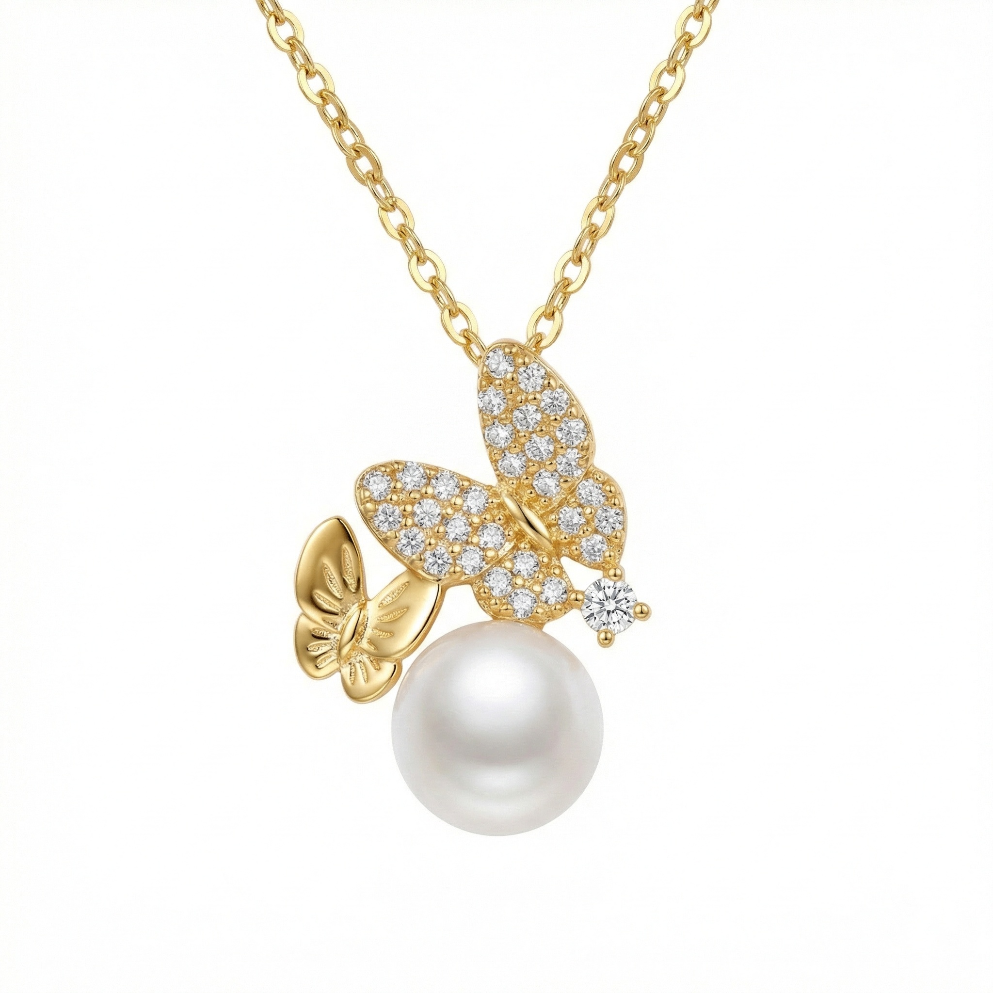 This exquisite necklace showcases a whimsical design of two fluttering butterflies resting gracefully above a radiant pearl. The larger butterfly is meticulously pavé-set with brilliant-cut round stones that capture the light from every angle, while its smaller companion features a beautifully textured and polished finish. A single, sparkling accent stone sits delicately to the side, adding a touch of modern brilliance. Suspended below is a large, high-luster white pearl, perfectly round and smooth, symbolizing timeless elegance. The pendant hangs from a delicate link chain, crafted in a warm, lustrous metal that enhances the brilliance of the gemstones and the soft glow of the pearl. Perfect for nature lovers or anyone seeking a sophisticated statement piece, this jewelry item blends classic charm with contemporary luxury. Its intricate details and high-quality craftsmanship make it an ideal gift for special occasions or a refined addition to any jewelry collection. | Brand: jewelryodm
