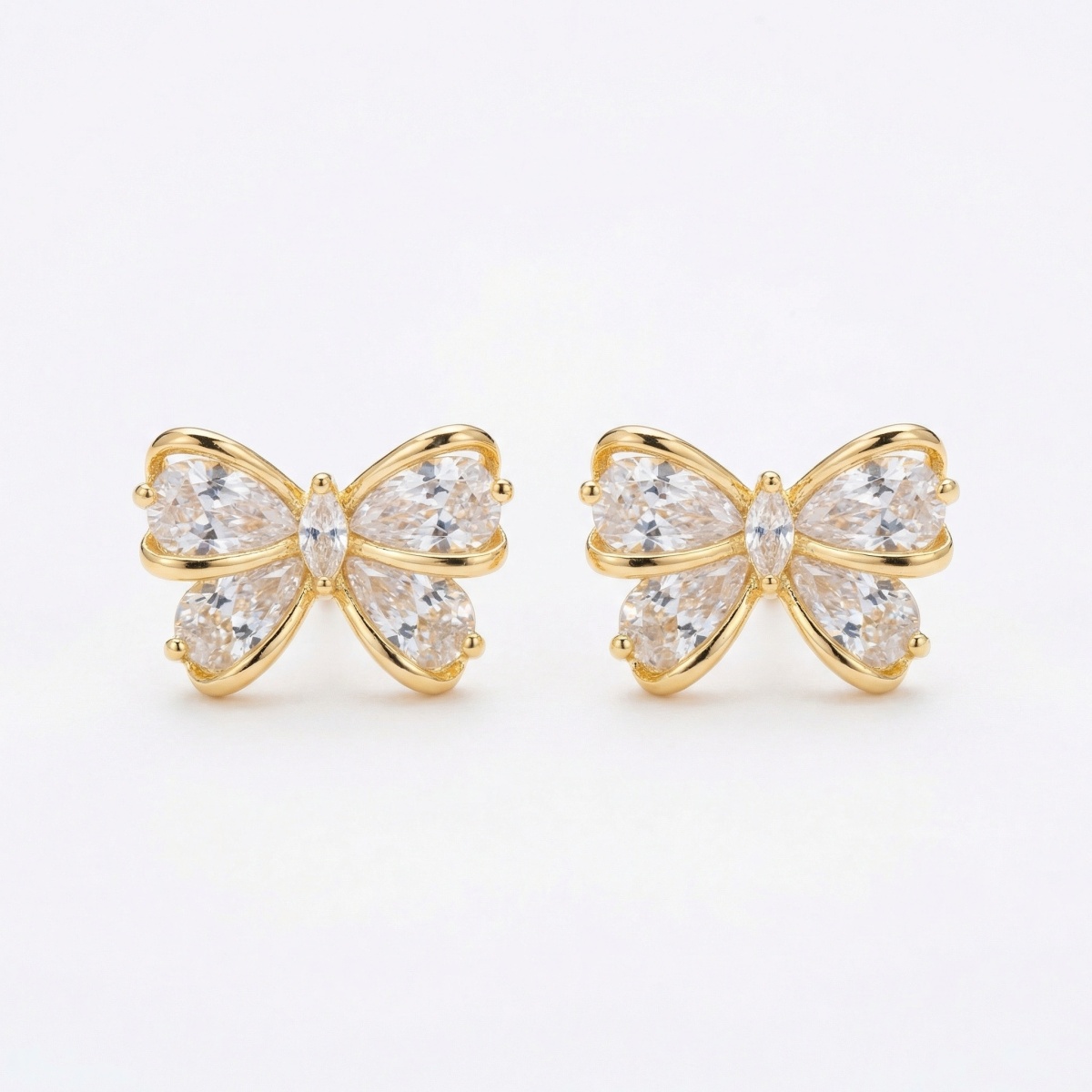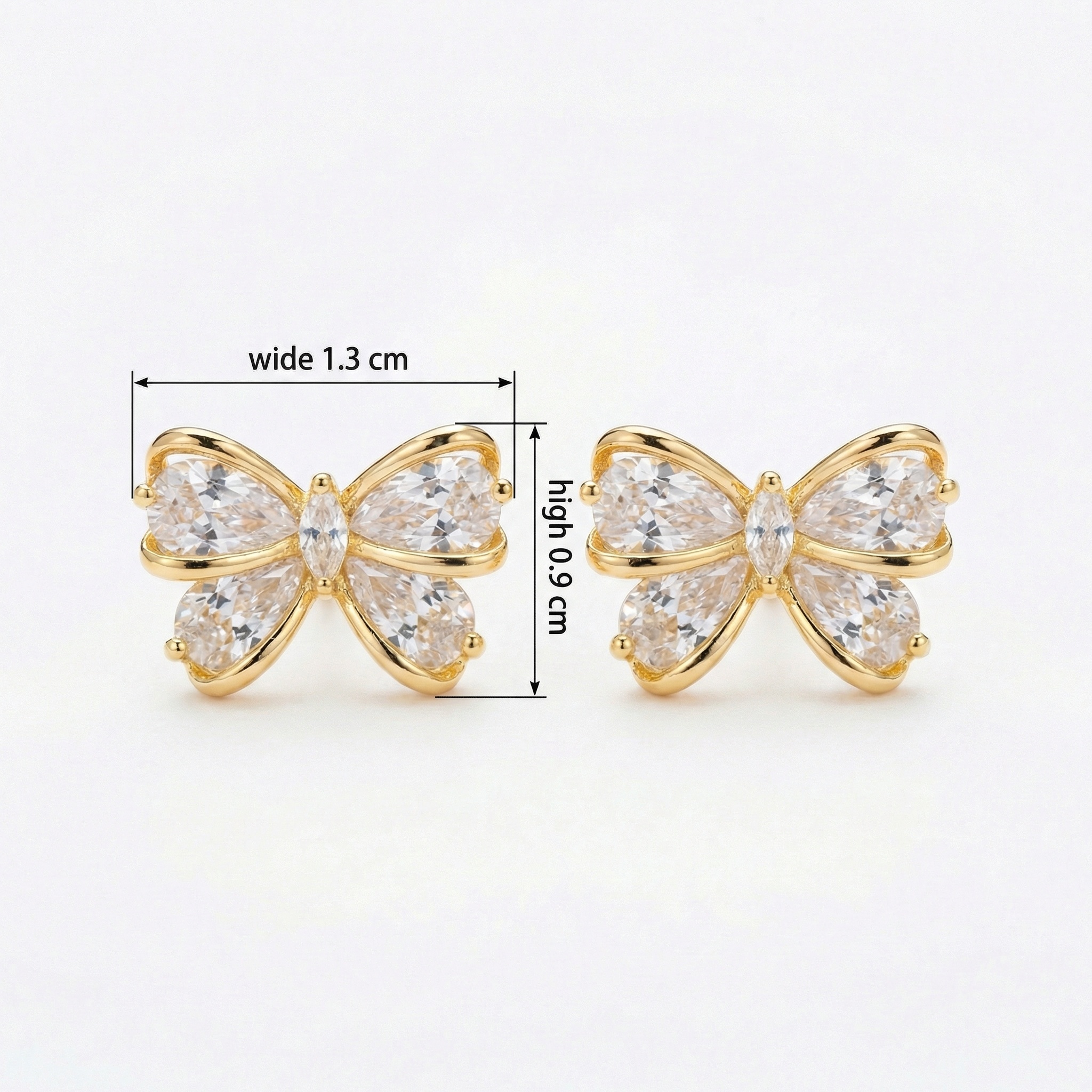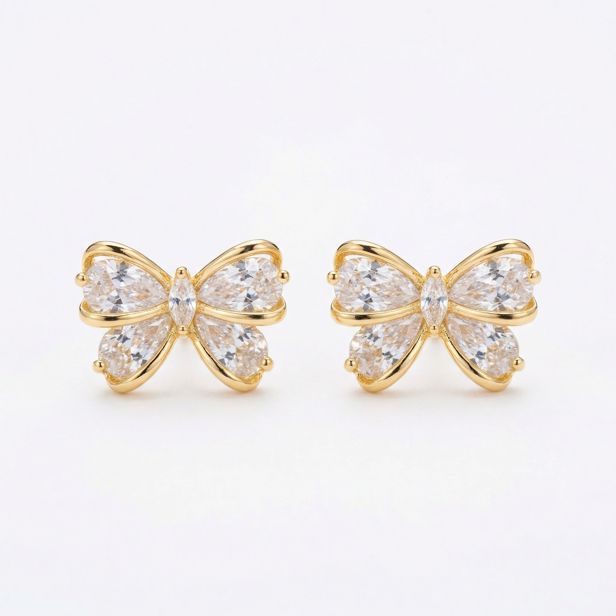 These exquisite butterfly-shaped stud earrings are designed to capture light and attention. Each piece features a beautifully crafted winged silhouette set with shimmering clear gemstones. The central body is accented by a marquise-cut stone, while the wings are formed by larger pear-shaped crystals, creating a delicate and sophisticated look. The metallic setting provides a warm, polished finish that perfectly complements the brilliant sparkle of the stones. Lightweight and comfortable for daily wear, these earrings add a touch of nature-inspired elegance to any outfit. Ideal for gifting or personal collections, they offer a timeless charm that transitions seamlessly from casual daywear to elegant evening attire. Their intricate detailing and high-shine finish make them a versatile accessory for those who appreciate refined jewelry design. | Brand: jewelryodm