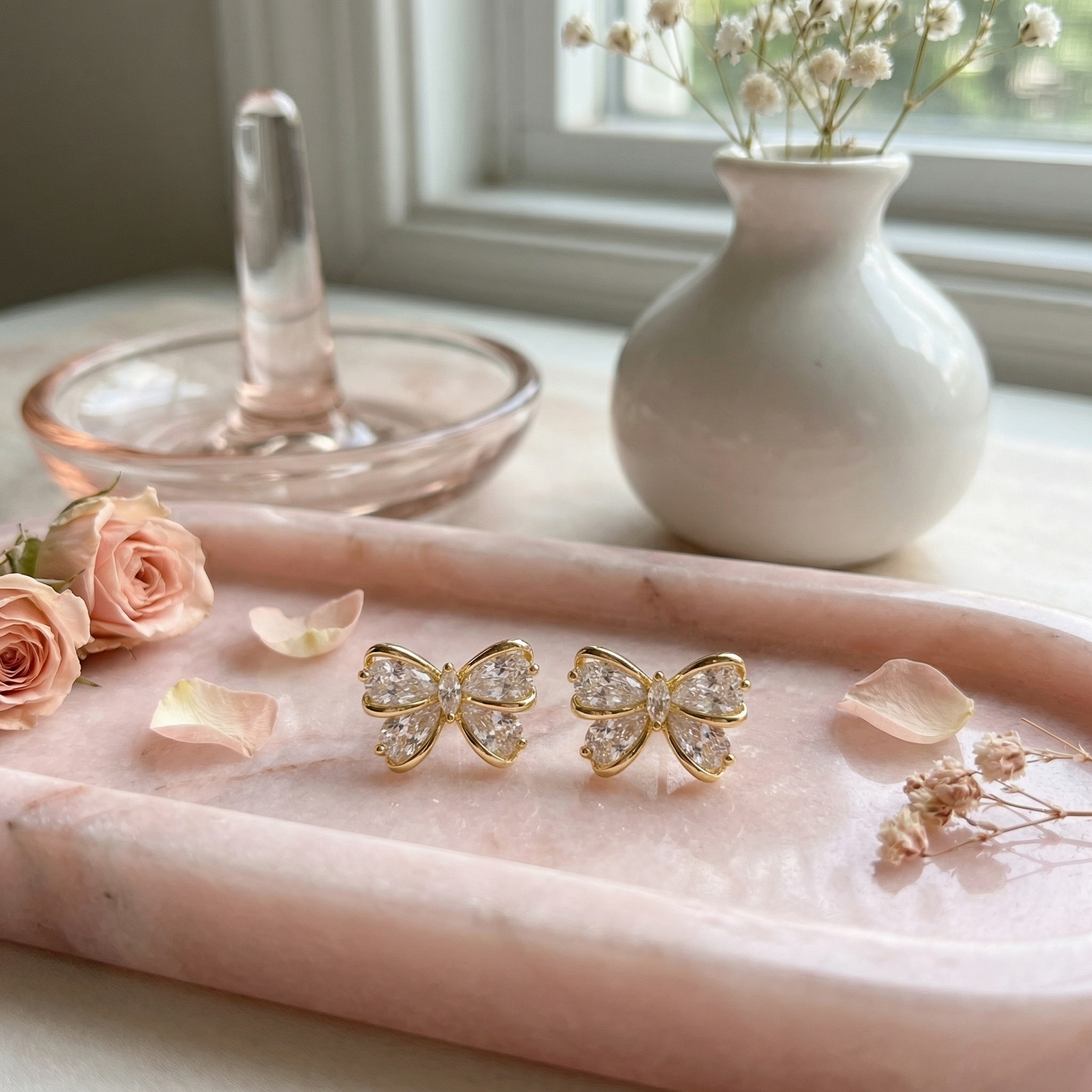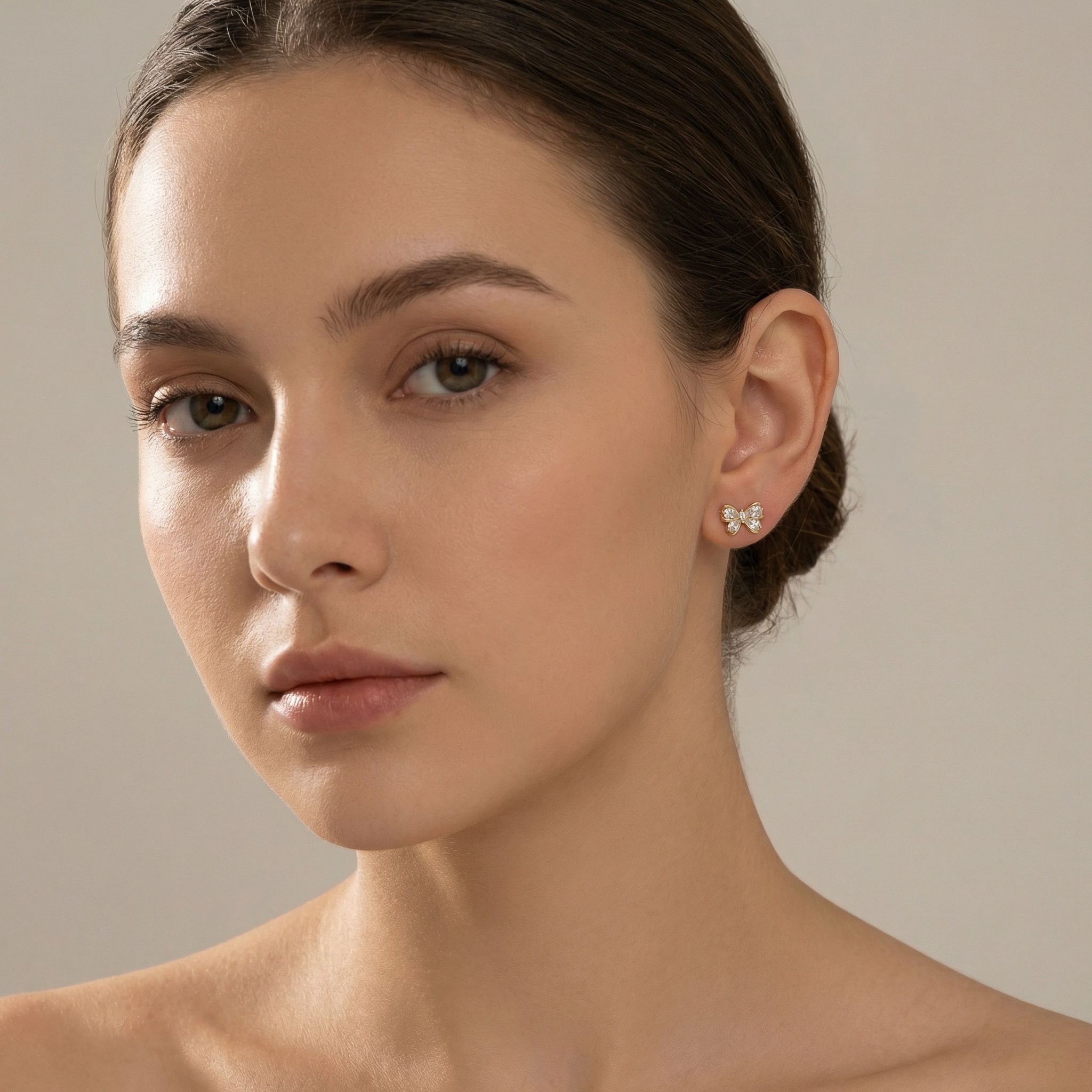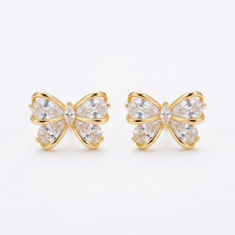 These exquisite butterfly-shaped stud earrings are designed to capture light and attention. Each piece features a beautifully crafted winged silhouette set with shimmering clear gemstones. The central body is accented by a marquise-cut stone, while the wings are formed by larger pear-shaped crystals, creating a delicate and sophisticated look. The metallic setting provides a warm, polished finish that perfectly complements the brilliant sparkle of the stones. Lightweight and comfortable for daily wear, these earrings add a touch of nature-inspired elegance to any outfit. Ideal for gifting or personal collections, they offer a timeless charm that transitions seamlessly from casual daywear to elegant evening attire. Their intricate detailing and high-shine finish make them a versatile accessory for those who appreciate refined jewelry design. | Brand: jewelryodm