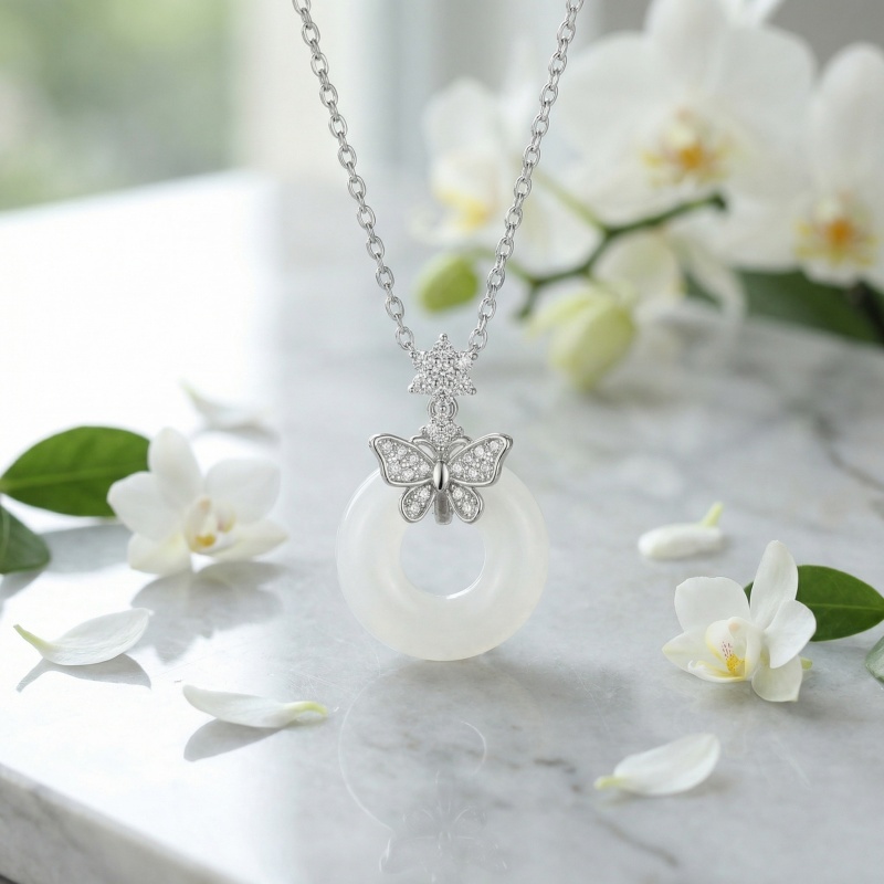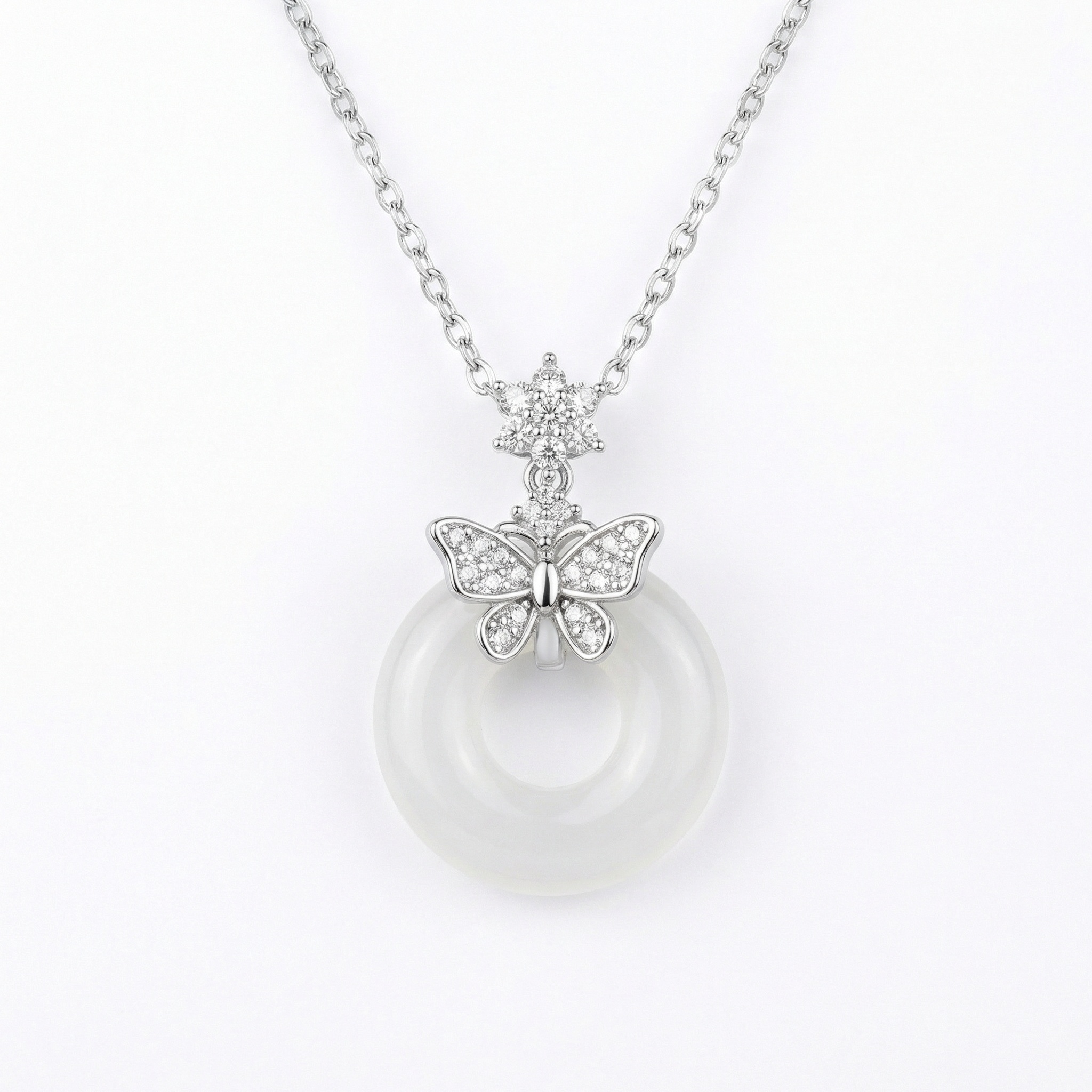 925 Sterling Silver Elegant Butterfly White Gemstone Donut Pendant Necklace in Sterling Silver